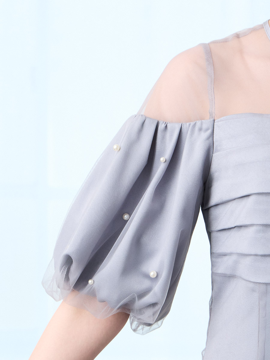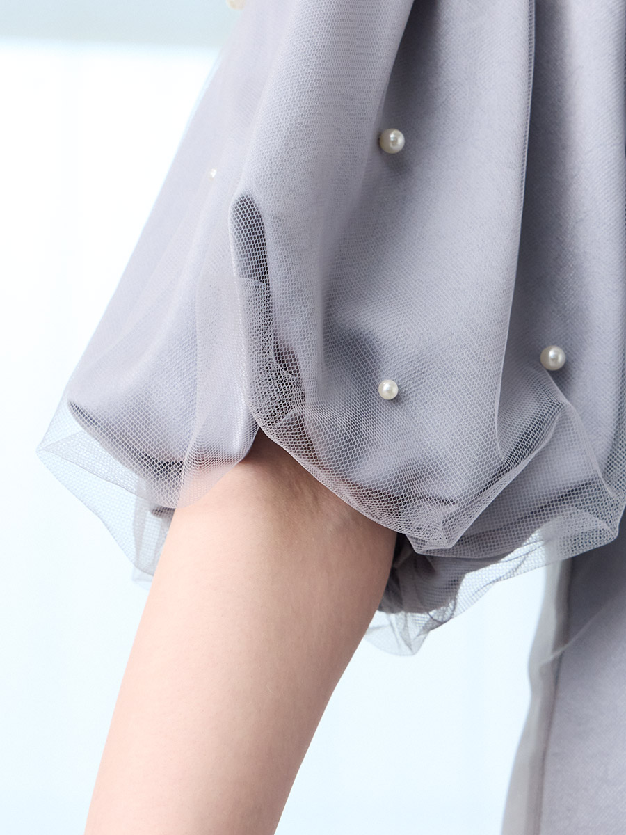 ・袖は立体的なパフスリーブに小粒パールを散りばめ、華やぎをプラス