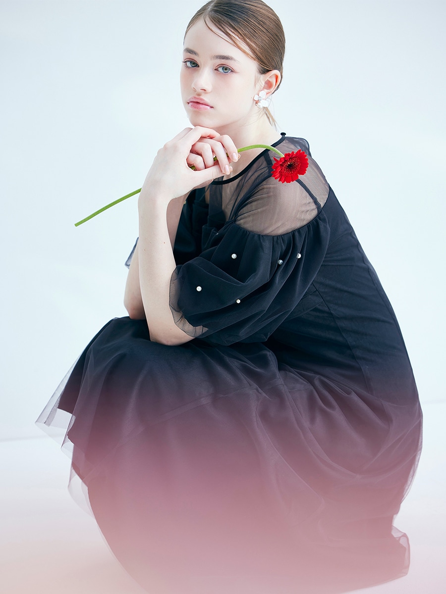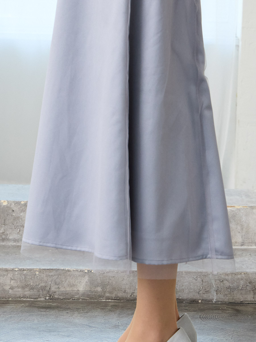 ・程よい光沢と落ち感があるヴィンテージサテンにシアー感のあるチュールを重ね、奥行きと透明感をプラス
