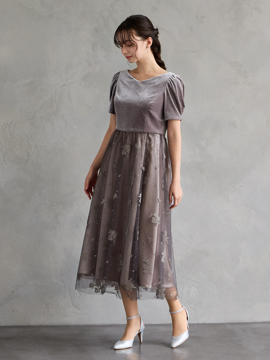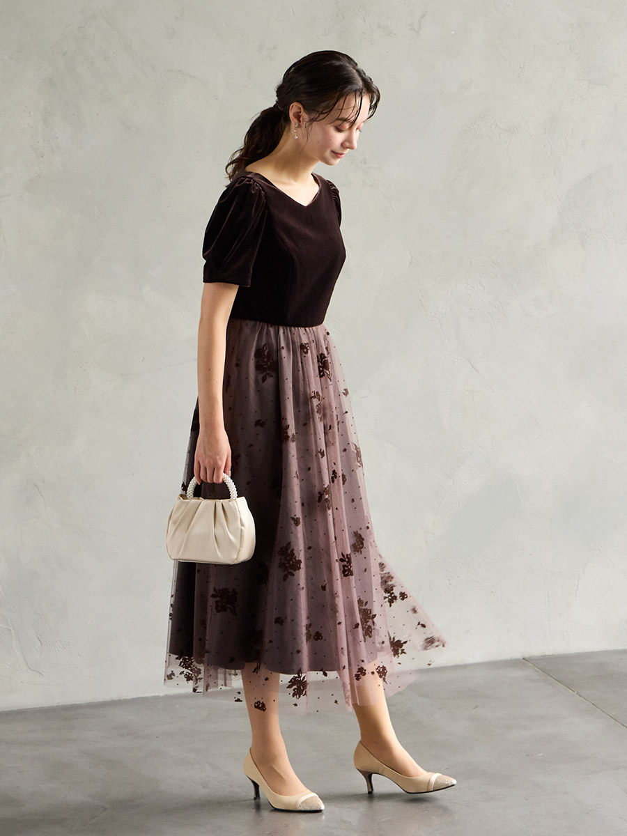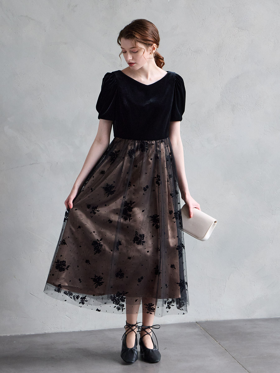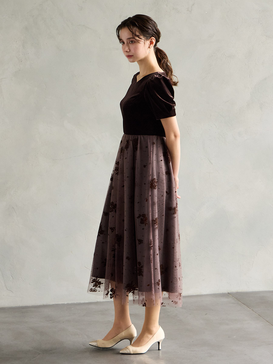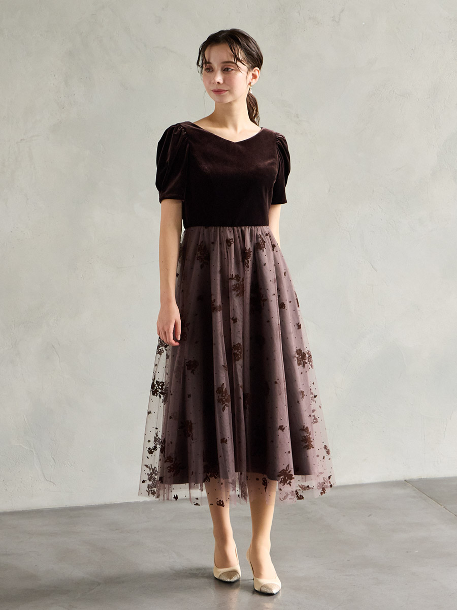 秋冬らしいベロアのぬくもりとラメフロッキー加工で描いた立体感のある花柄スカートが目を惹くドレス。