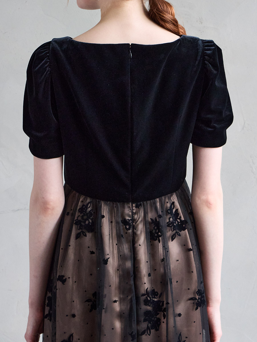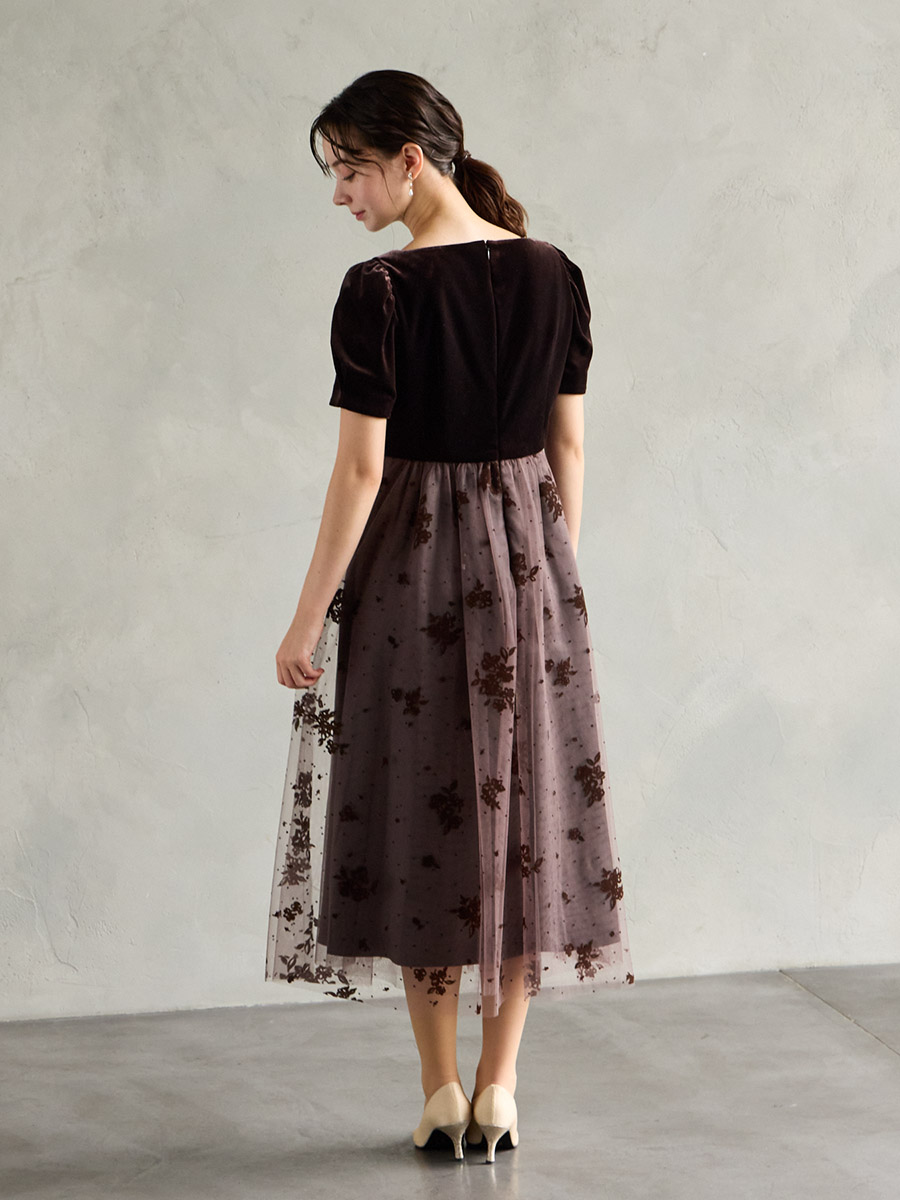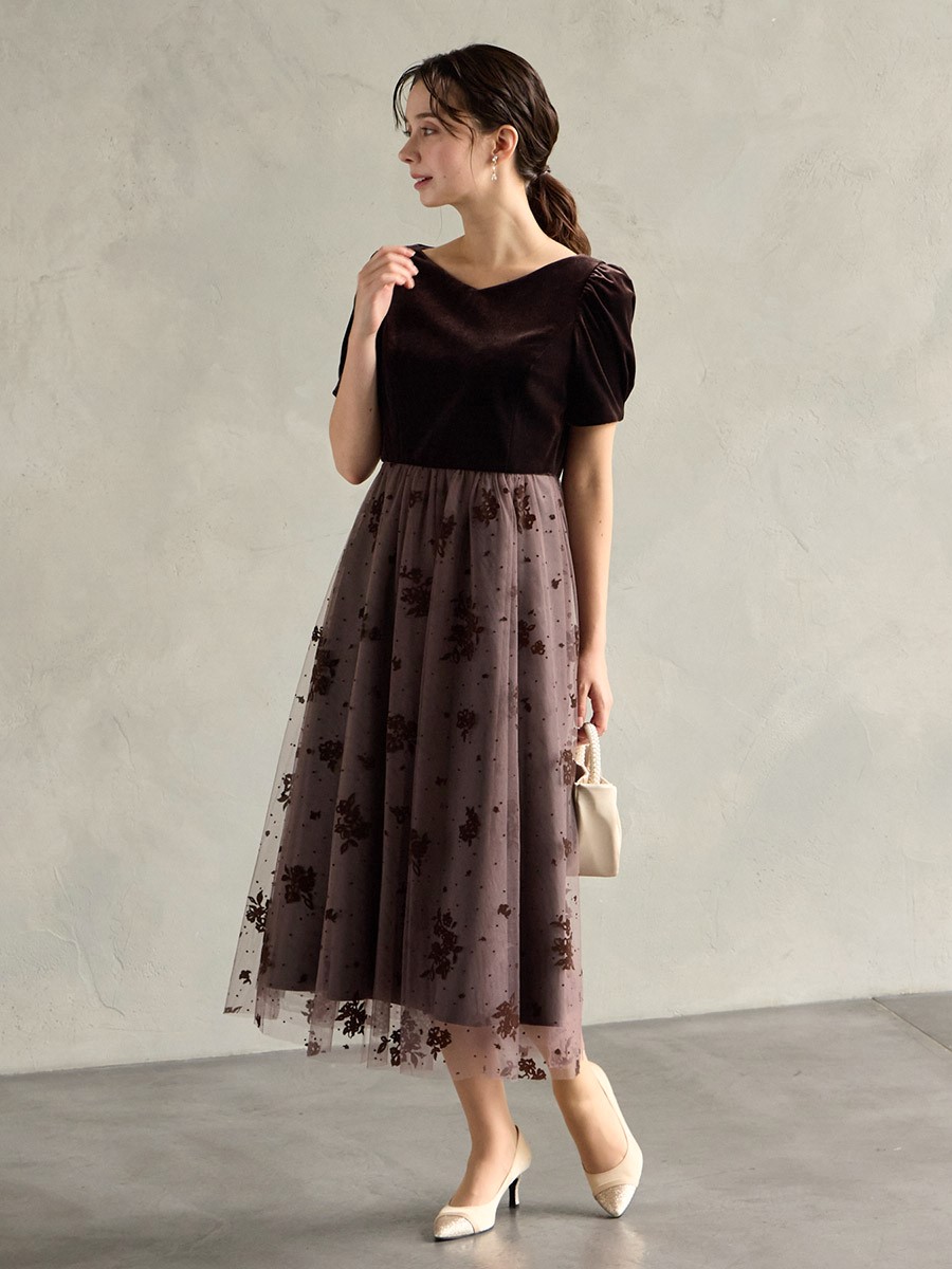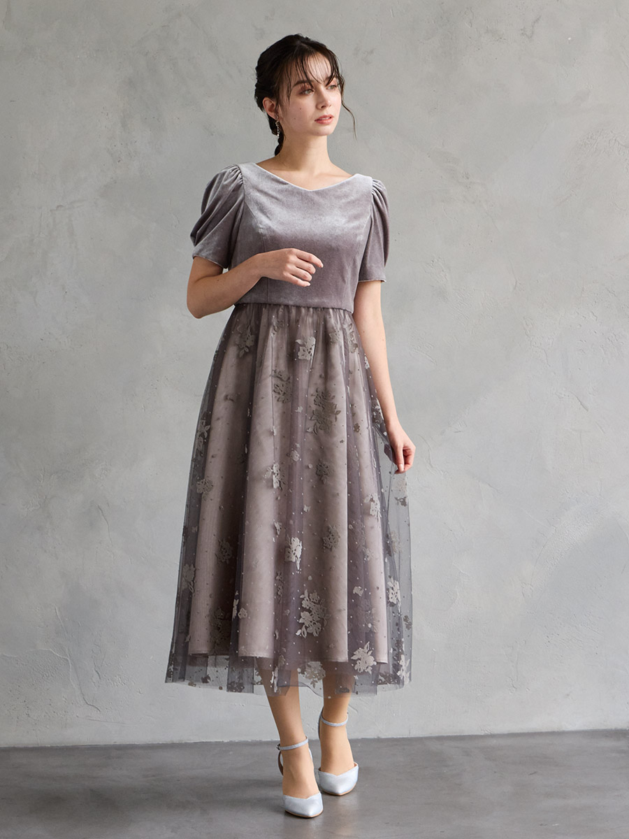 秋冬らしいベロアのぬくもりとラメフロッキー加工で描いた立体感のある花柄スカートが目を惹くドレス。