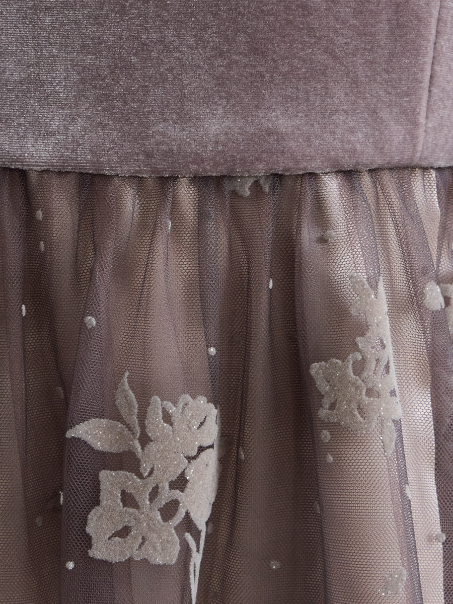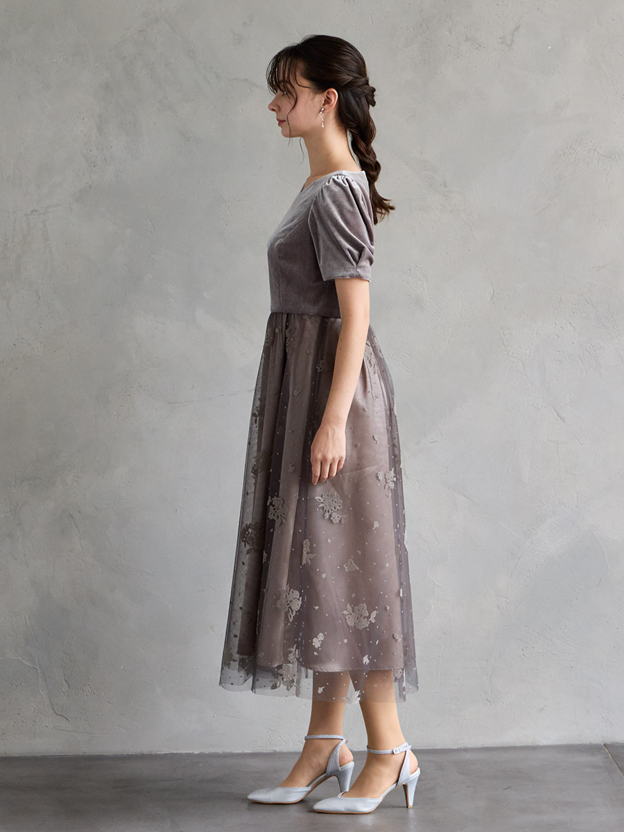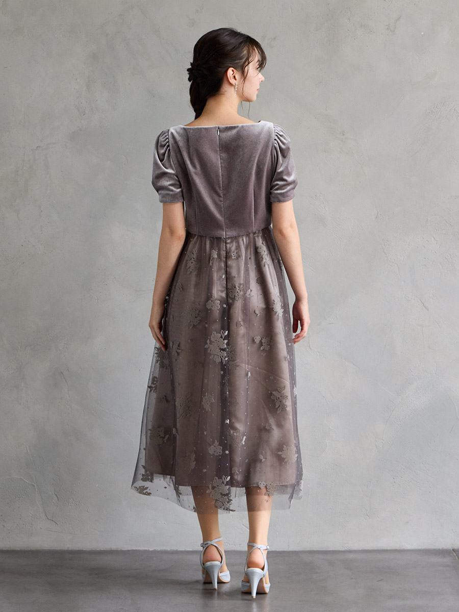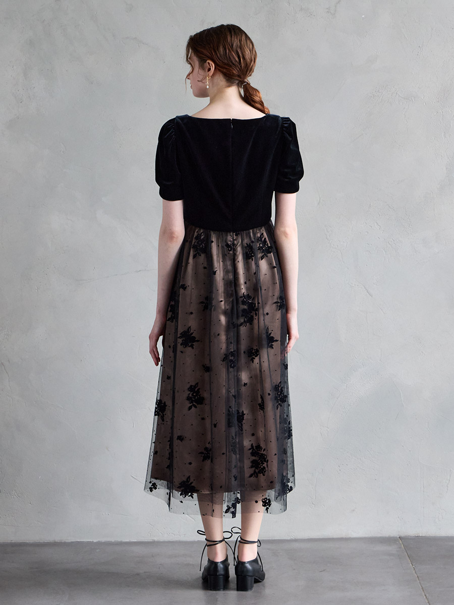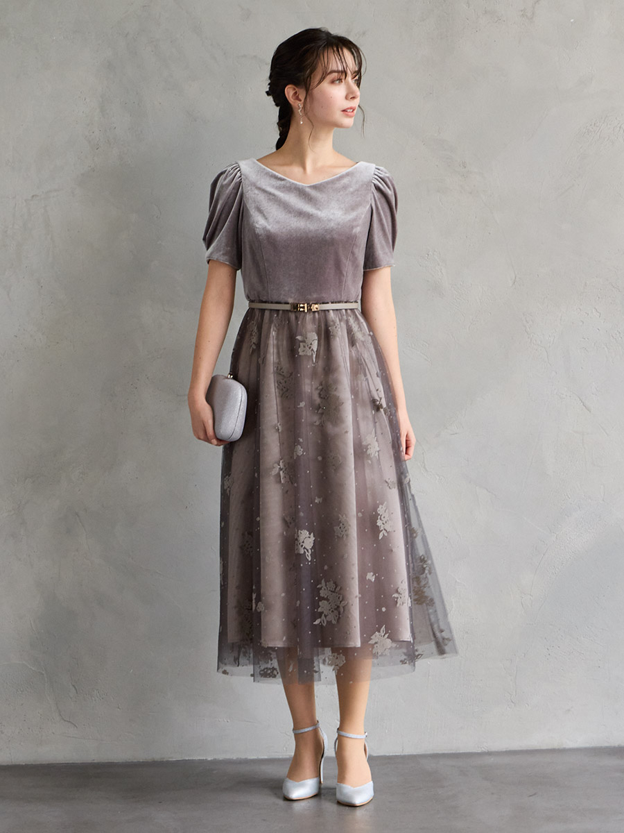 秋冬らしいベロアのぬくもりとラメフロッキー加工で描いた立体感のある花柄スカートが目を惹くドレス。