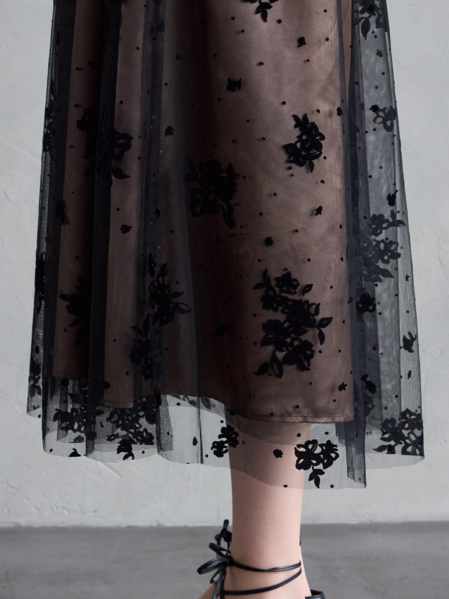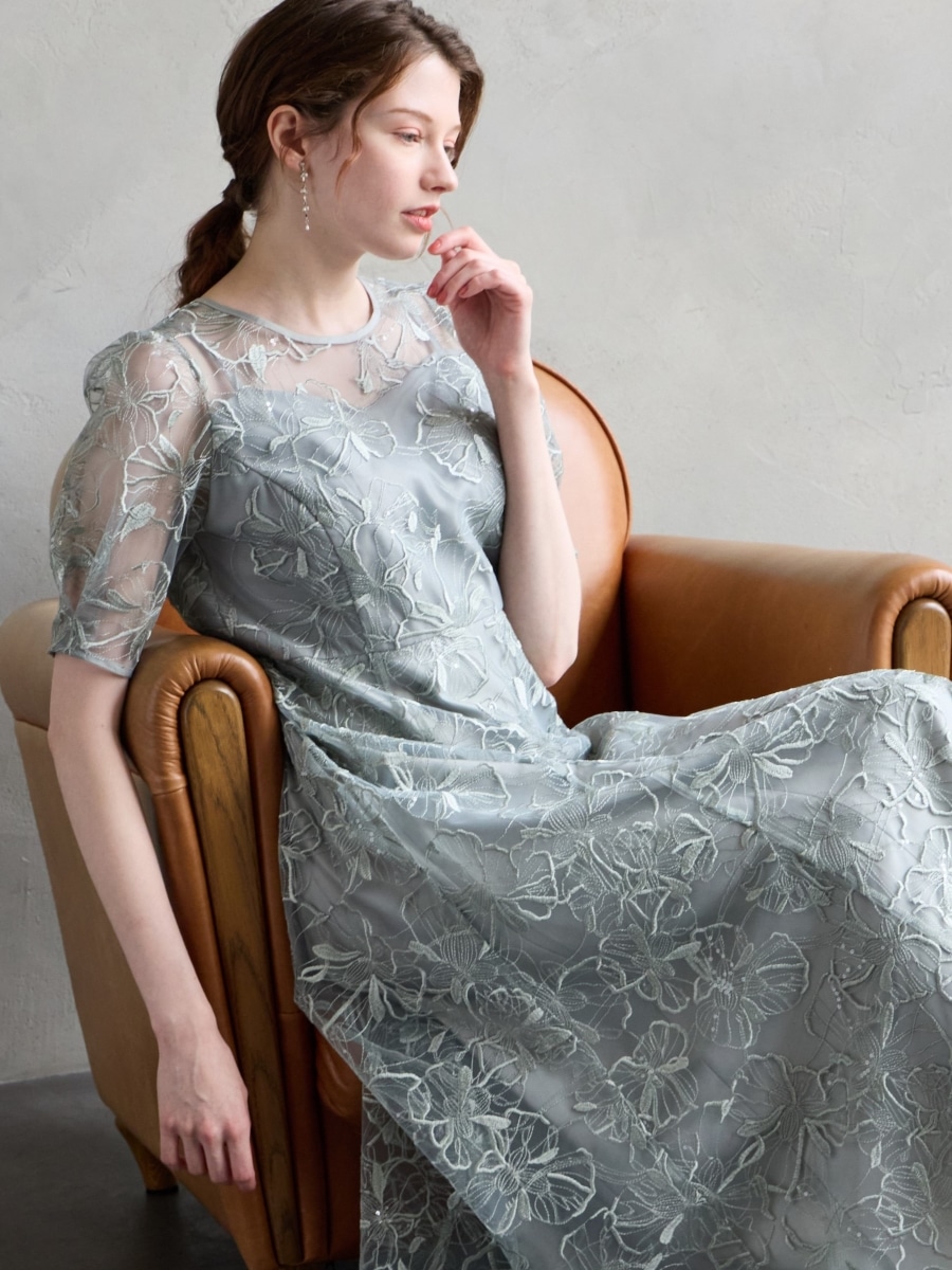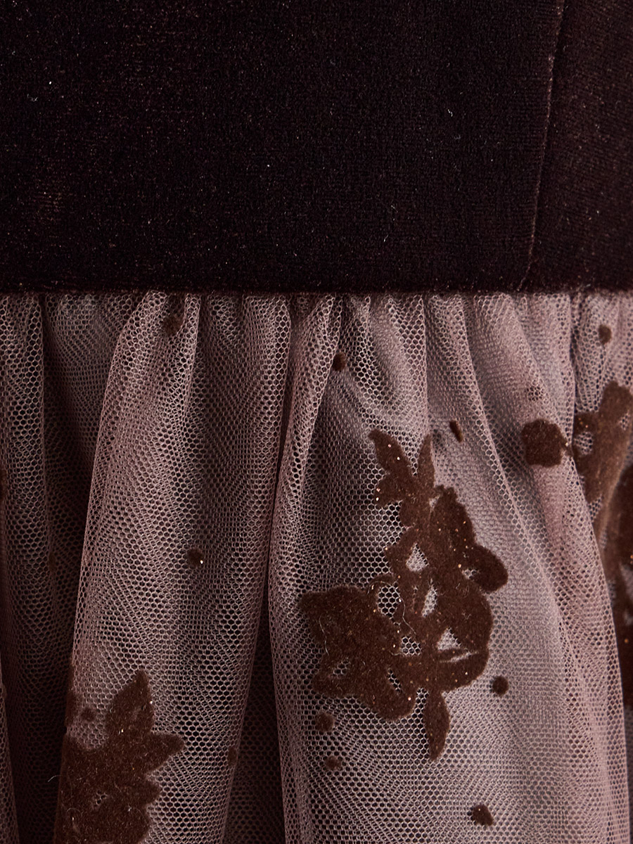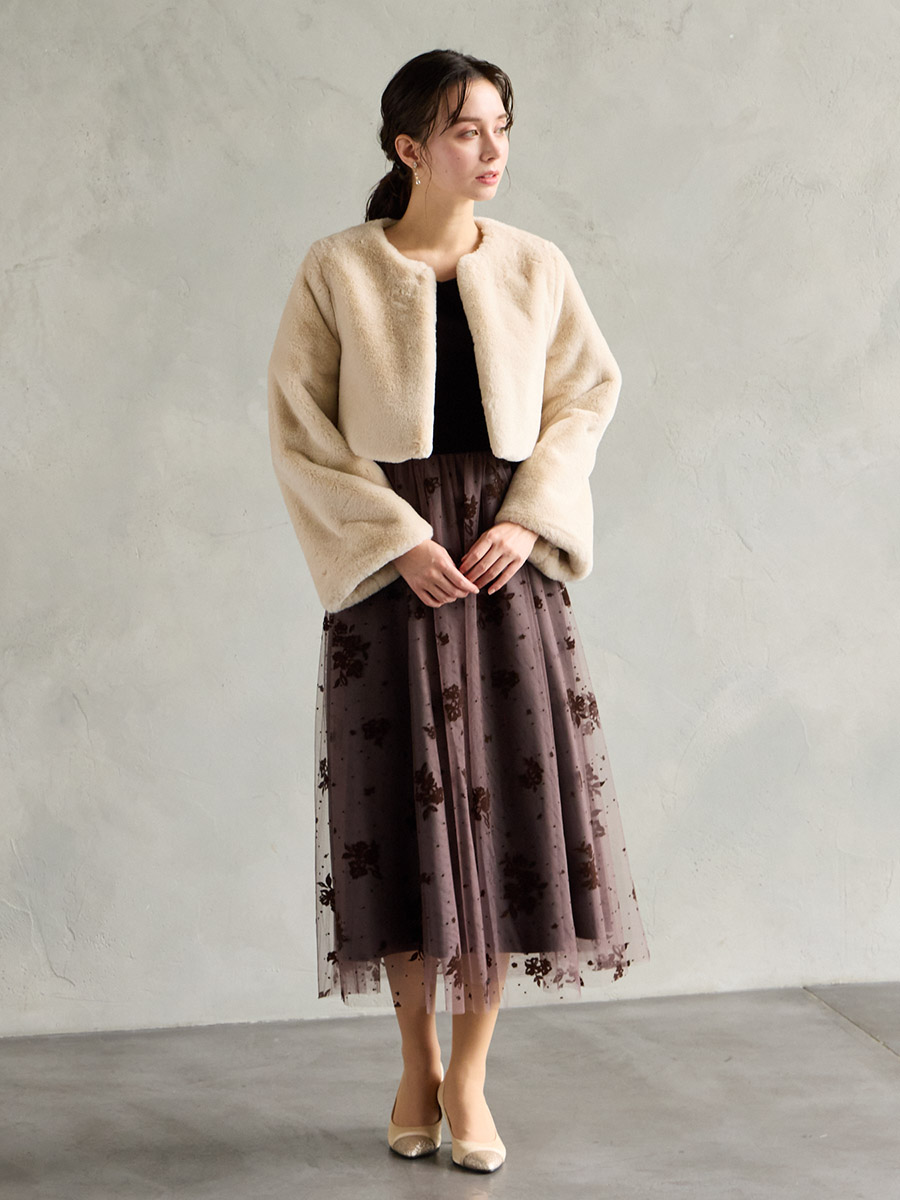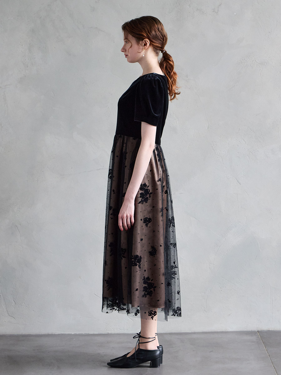 秋冬らしいベロアのぬくもりとラメフロッキー加工で描いた立体感のある花柄スカートが目を惹くドレス。