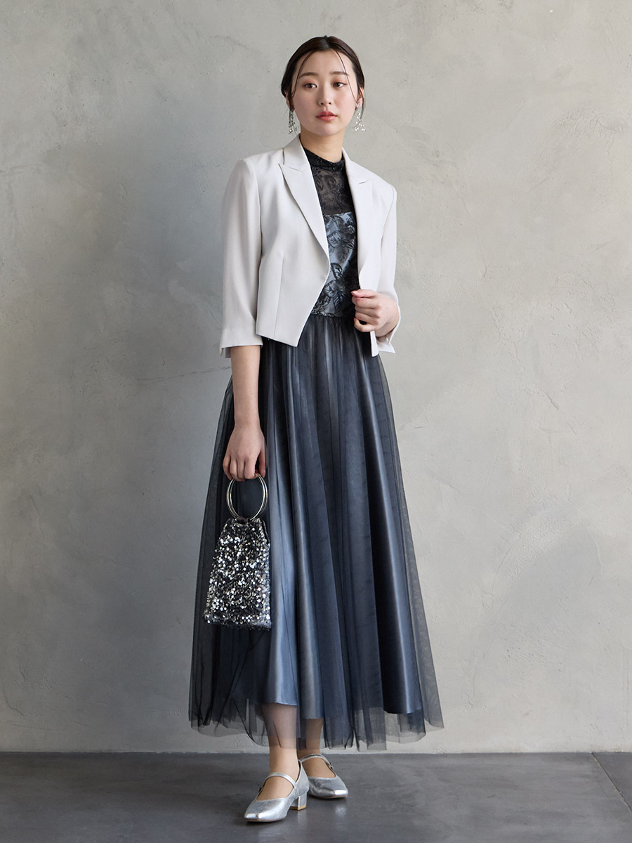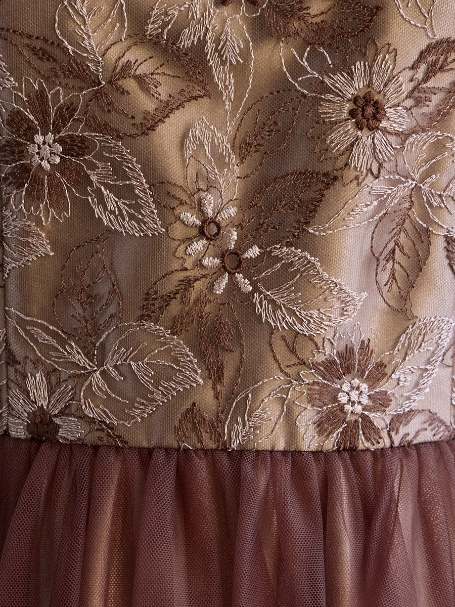 身頃にはきらりと光る刺繍レースを使い、デコルテが少し透けるデザインで柔らかい印象のドレスです。スカートには色の異なる2枚のソフトチュールを重ね奥行きのあるカラーに仕上げています。