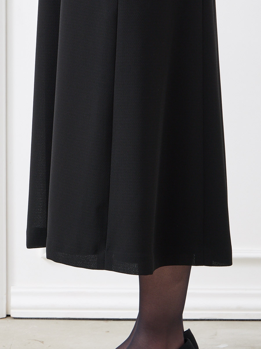 ・襟元のVネックデザインと、縦長のロングスカートシルエットがシャープな大人の印象です。