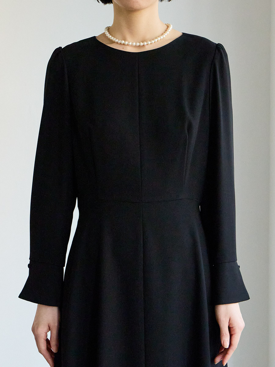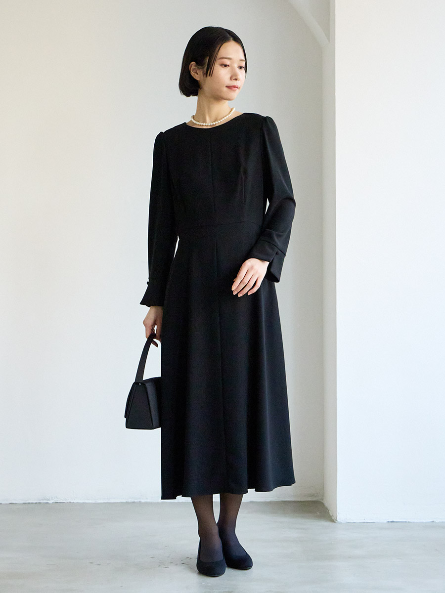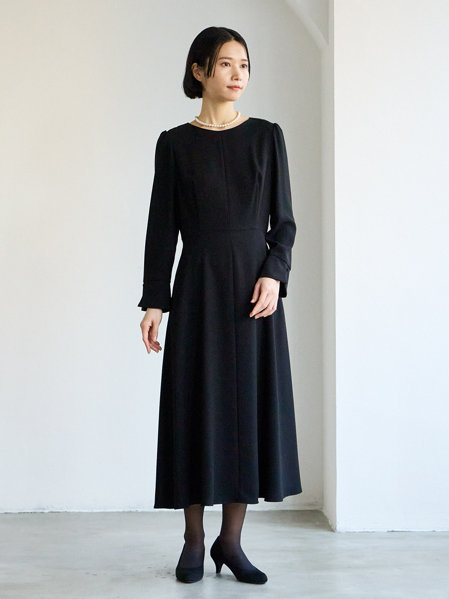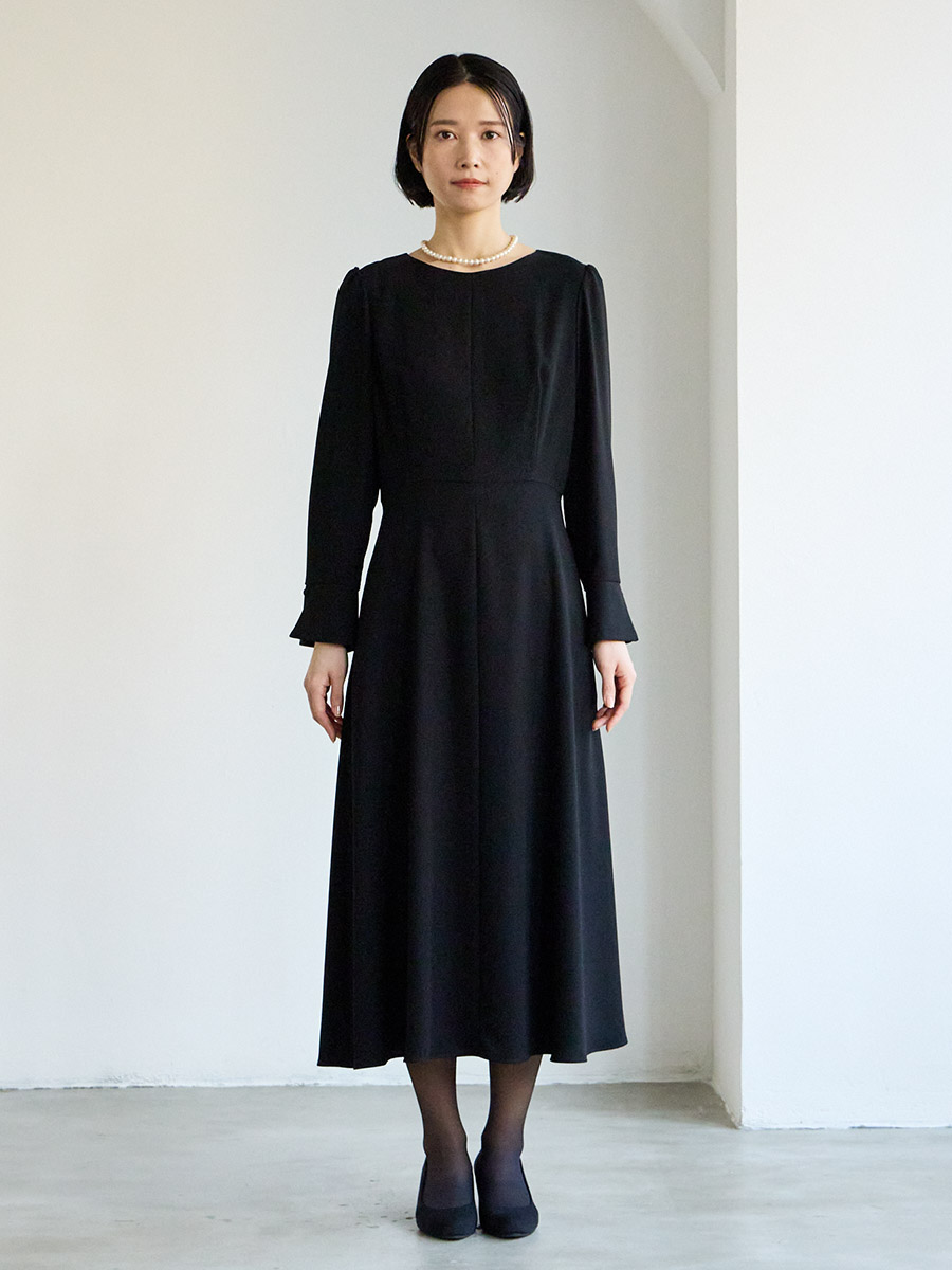 【喪服・礼服】【ウォッシャブル】カフススリーブAラインフレアブラックフォーマルワンピース