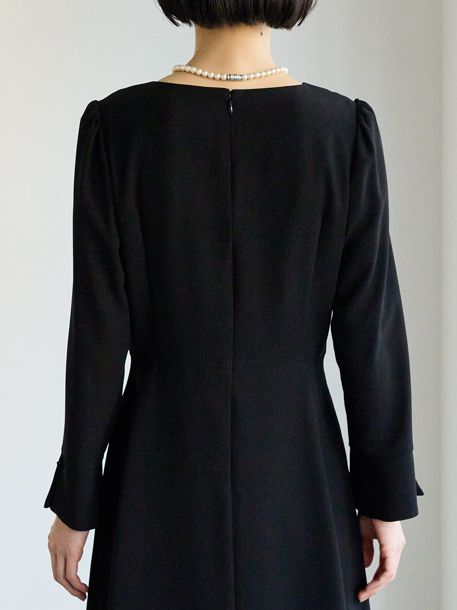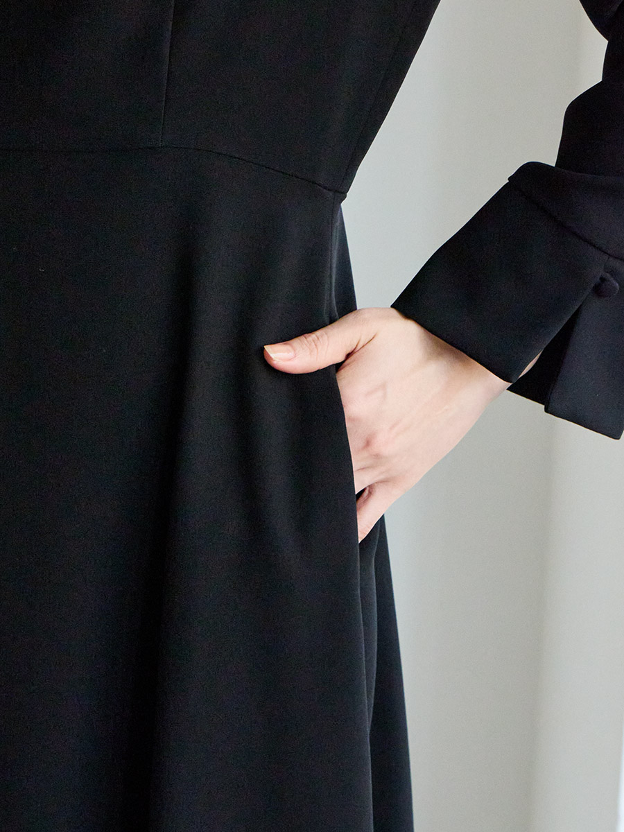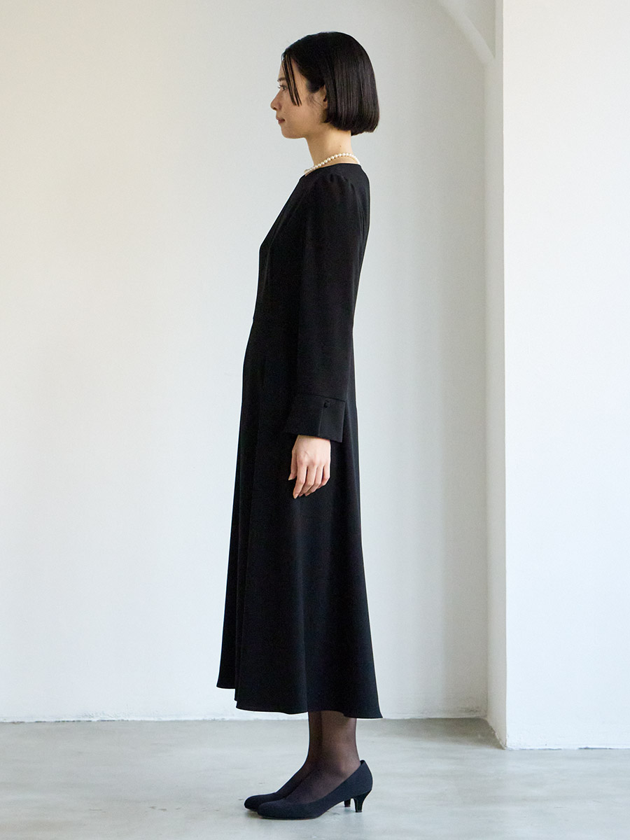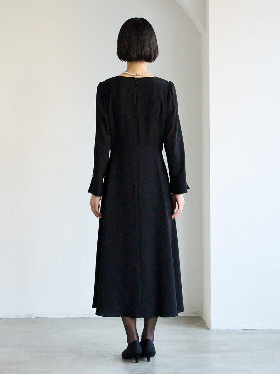 【喪服・礼服】【ウォッシャブル】カフススリーブAラインフレアブラックフォーマルワンピース