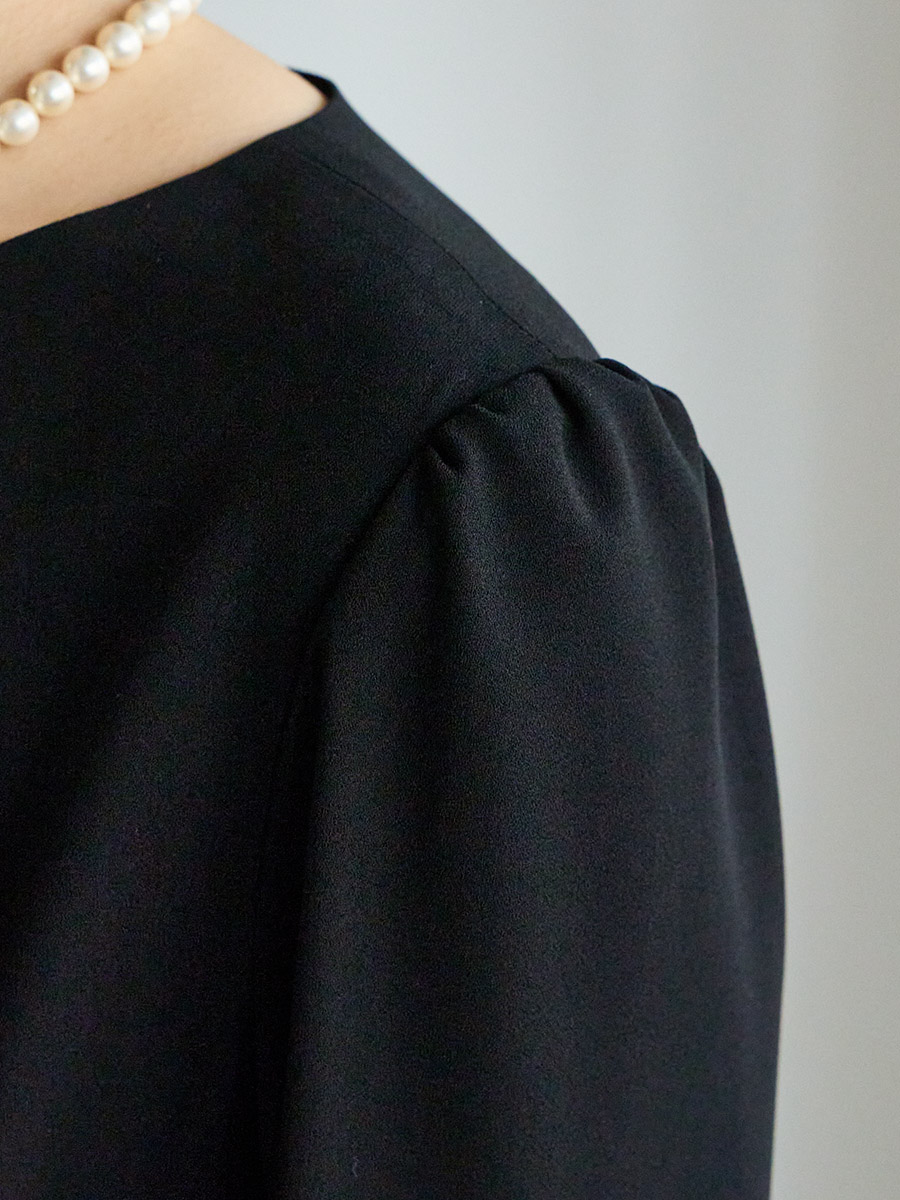 ・肩にはさりげなくキャザーを入れふんわりと、ワンピース一枚で着てもサマになるアクセントにしています。