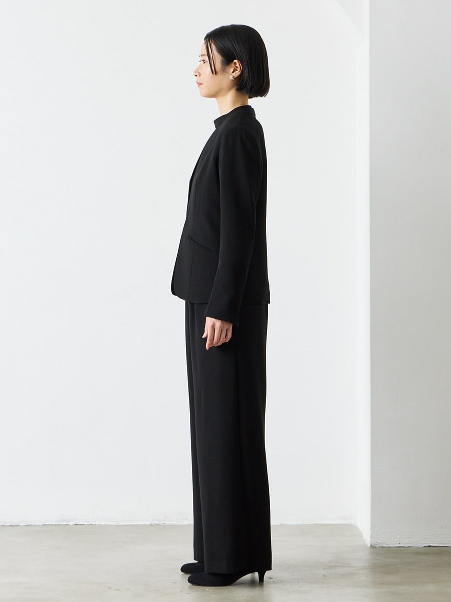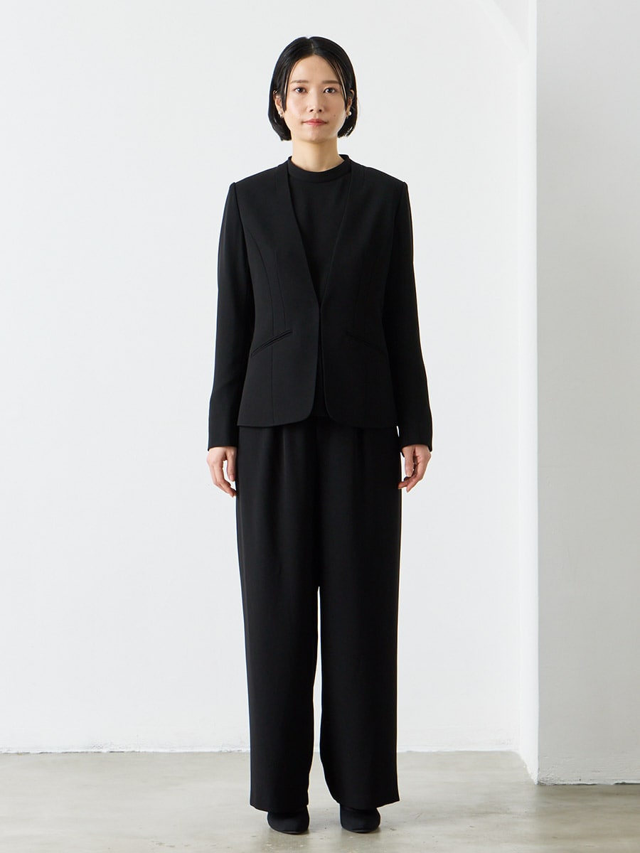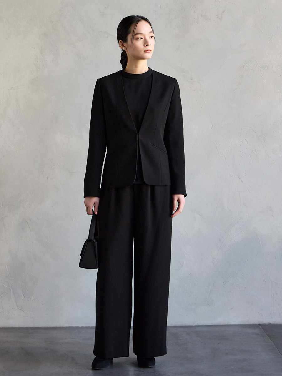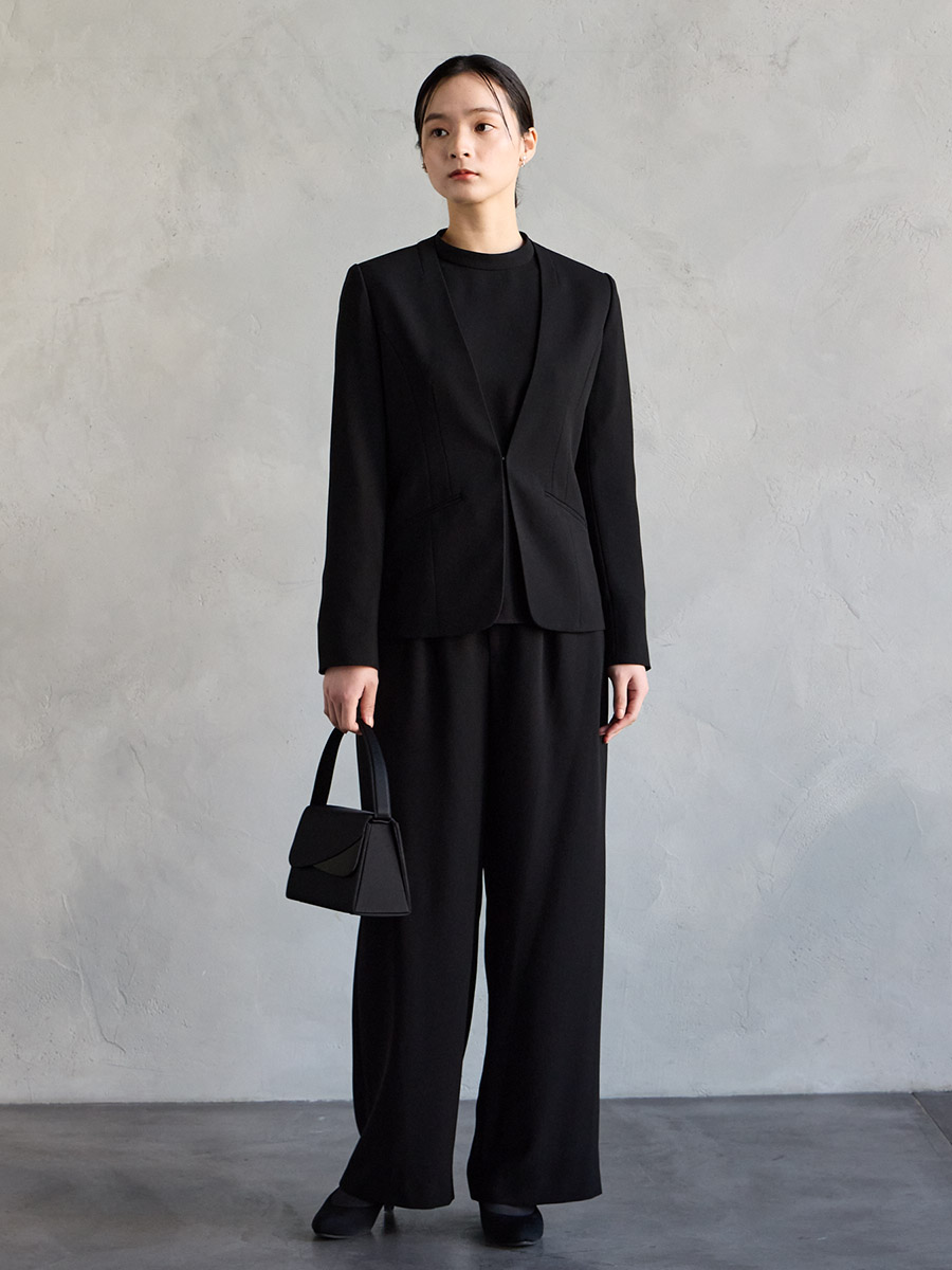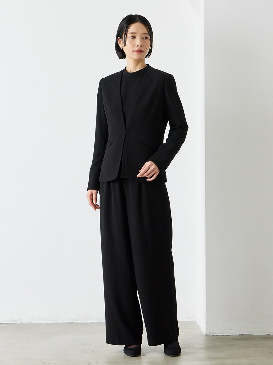 【喪服・礼服】【WEB限定】【マシンウォッシャブル】パンツタイプ3点セットブラックアンサンブル(ノーカラージャケット・スタンドネックブラウス・タック入りワイドパンツ)