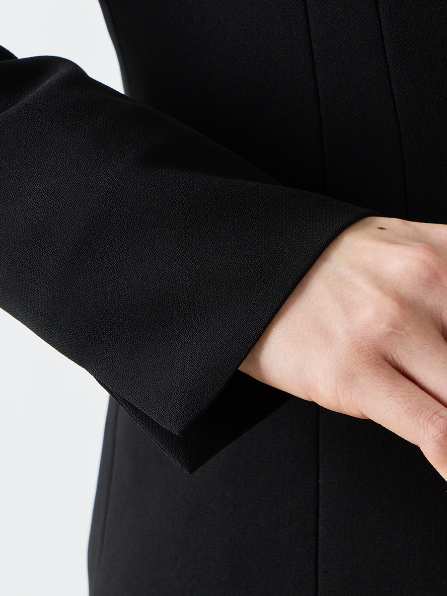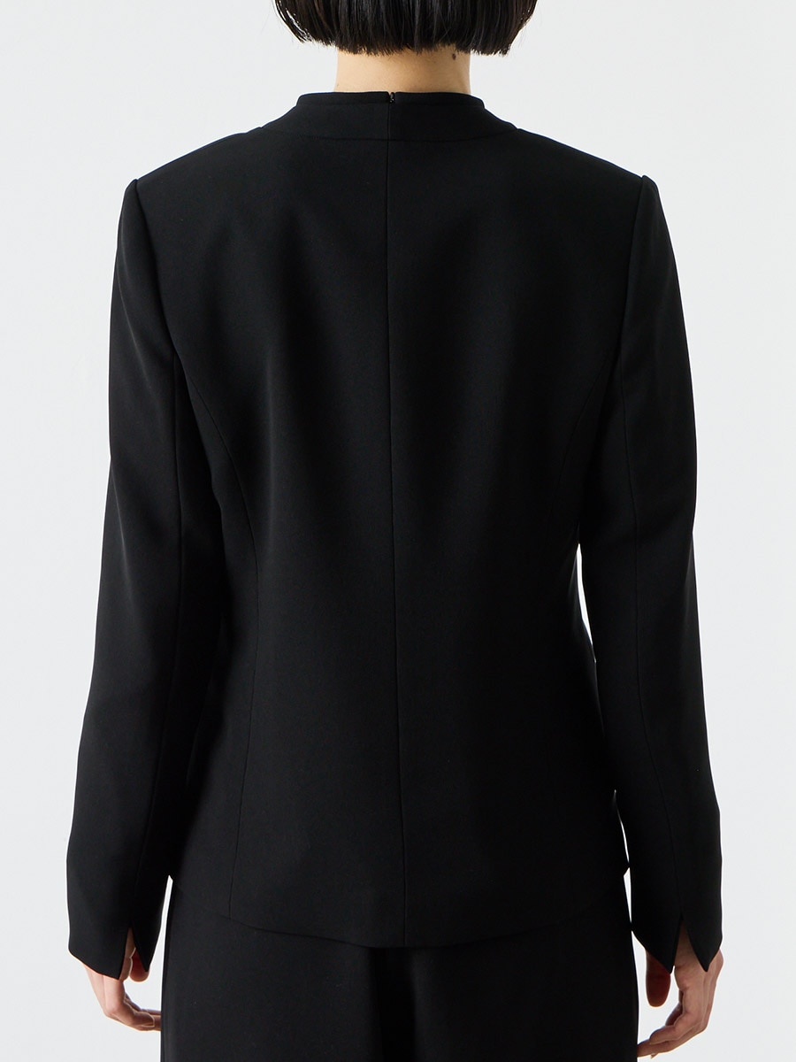 ・顔周りをすっきり見せる、深めのVラインのノーカラーデザイン