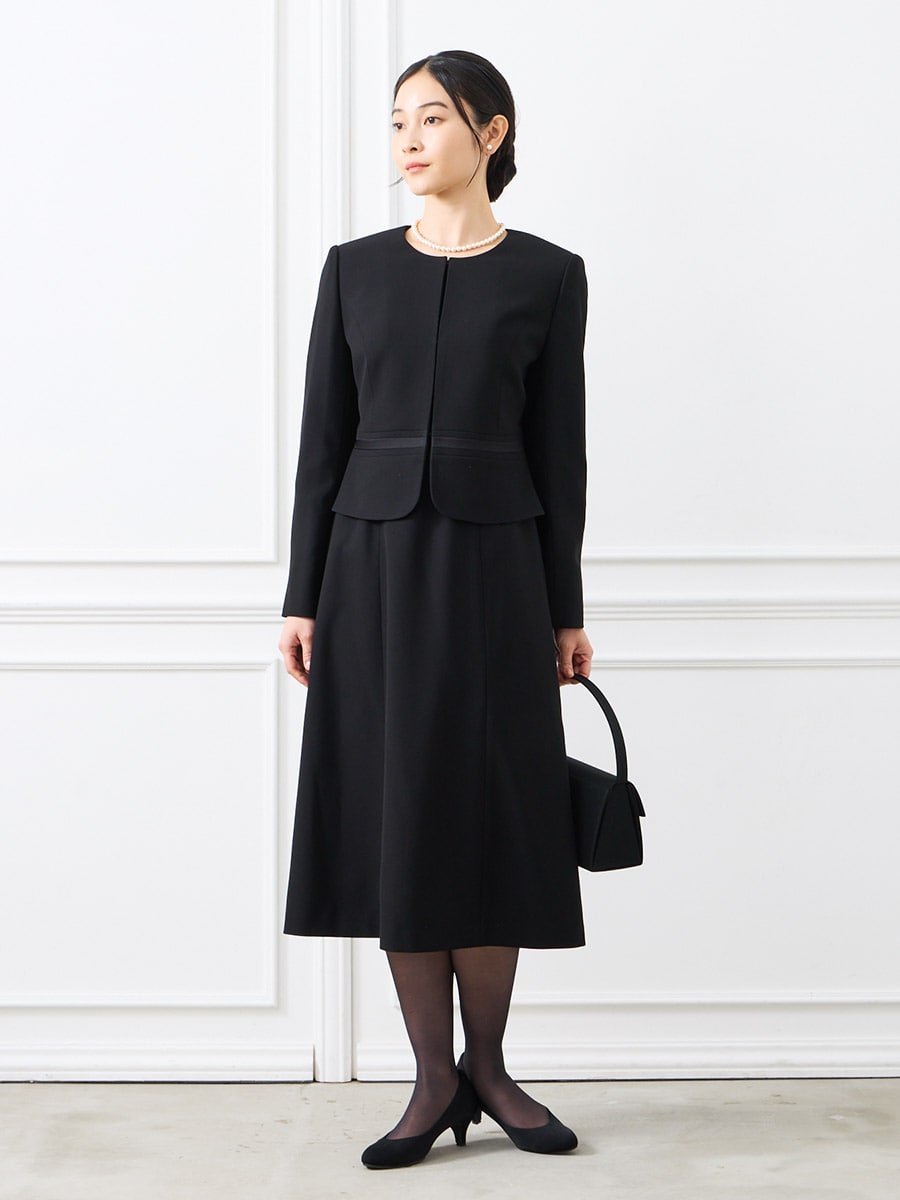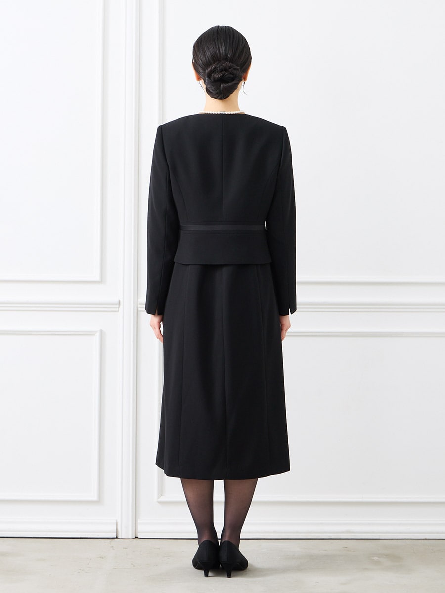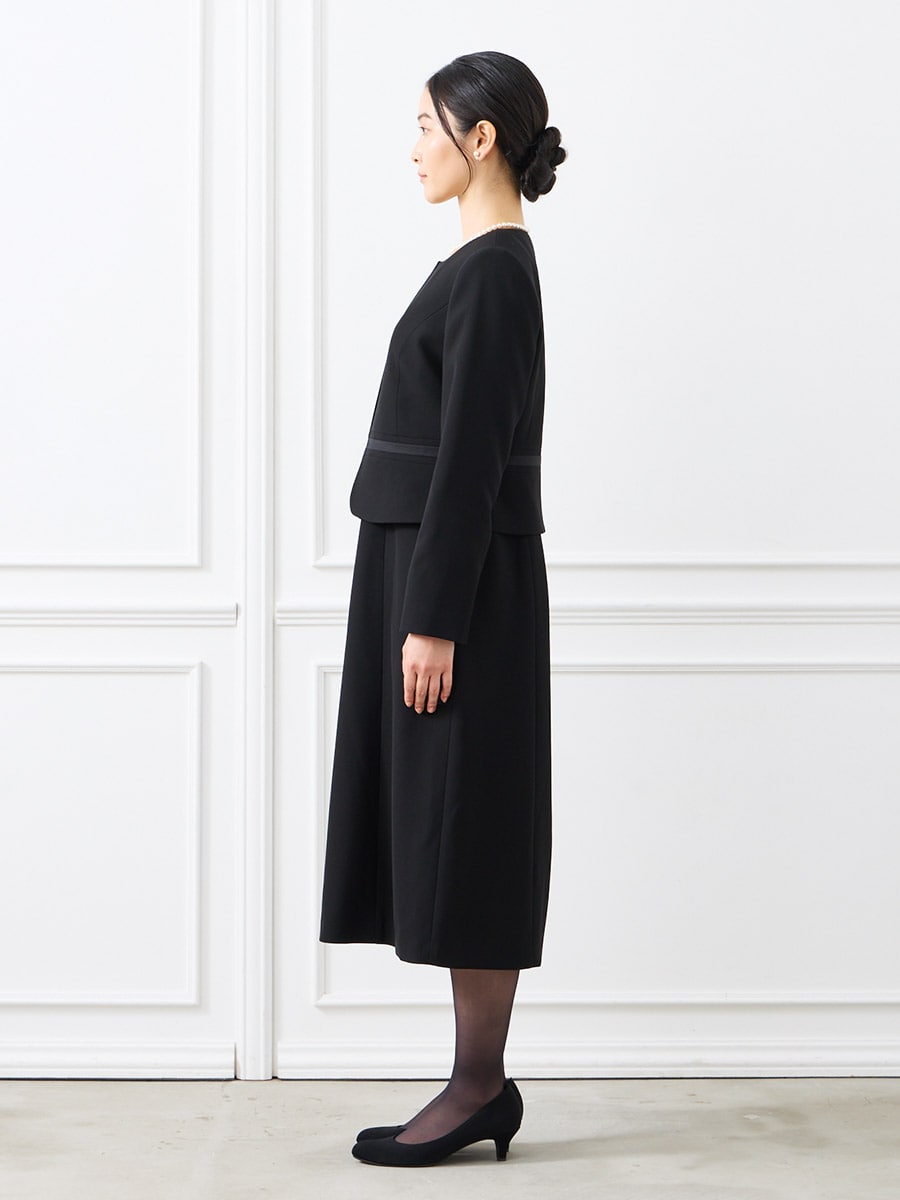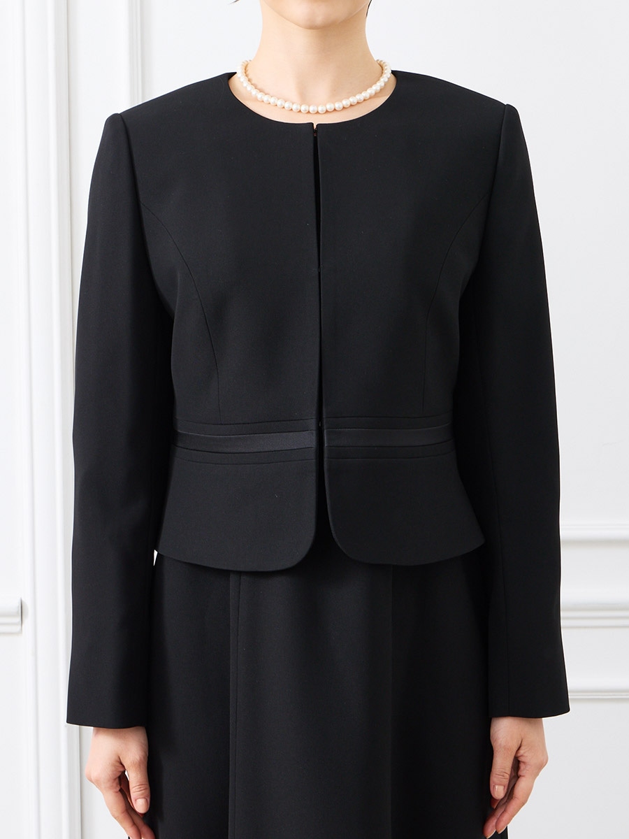 【喪服・礼服】【洗える・マシンウォッシャブル】ブラックフォーマルアンサンブル(グログラン切り替えノーカラージャケット 前開きフレアワンピース)