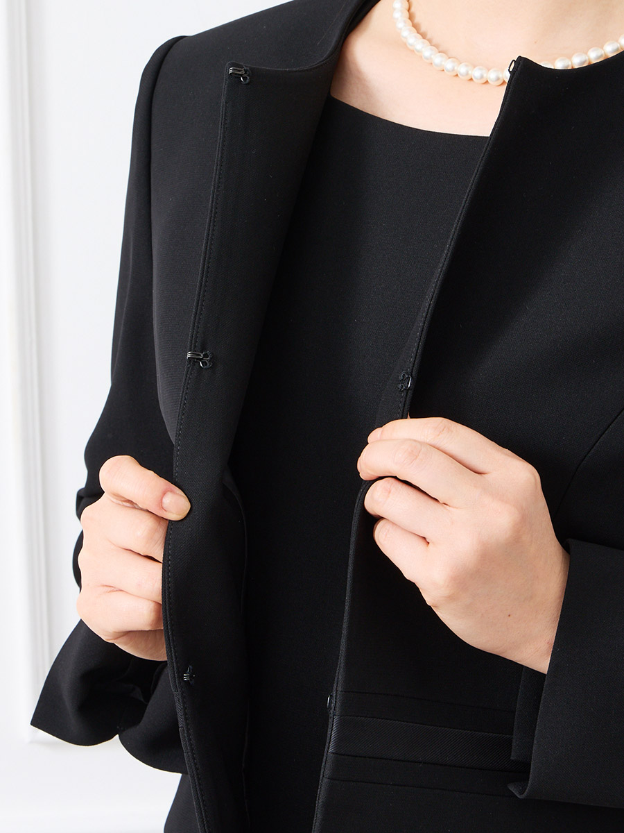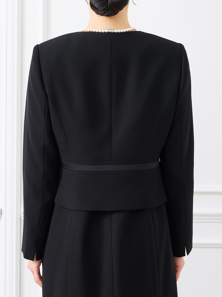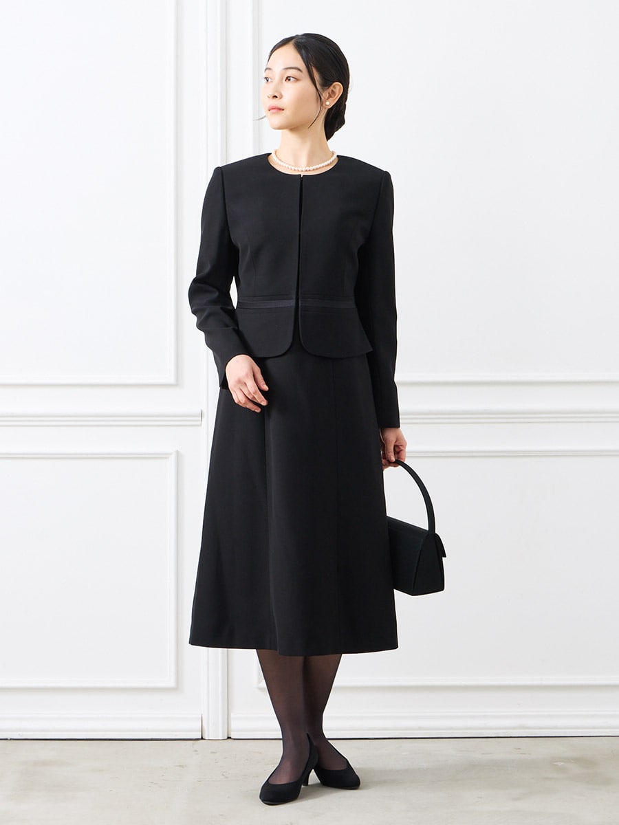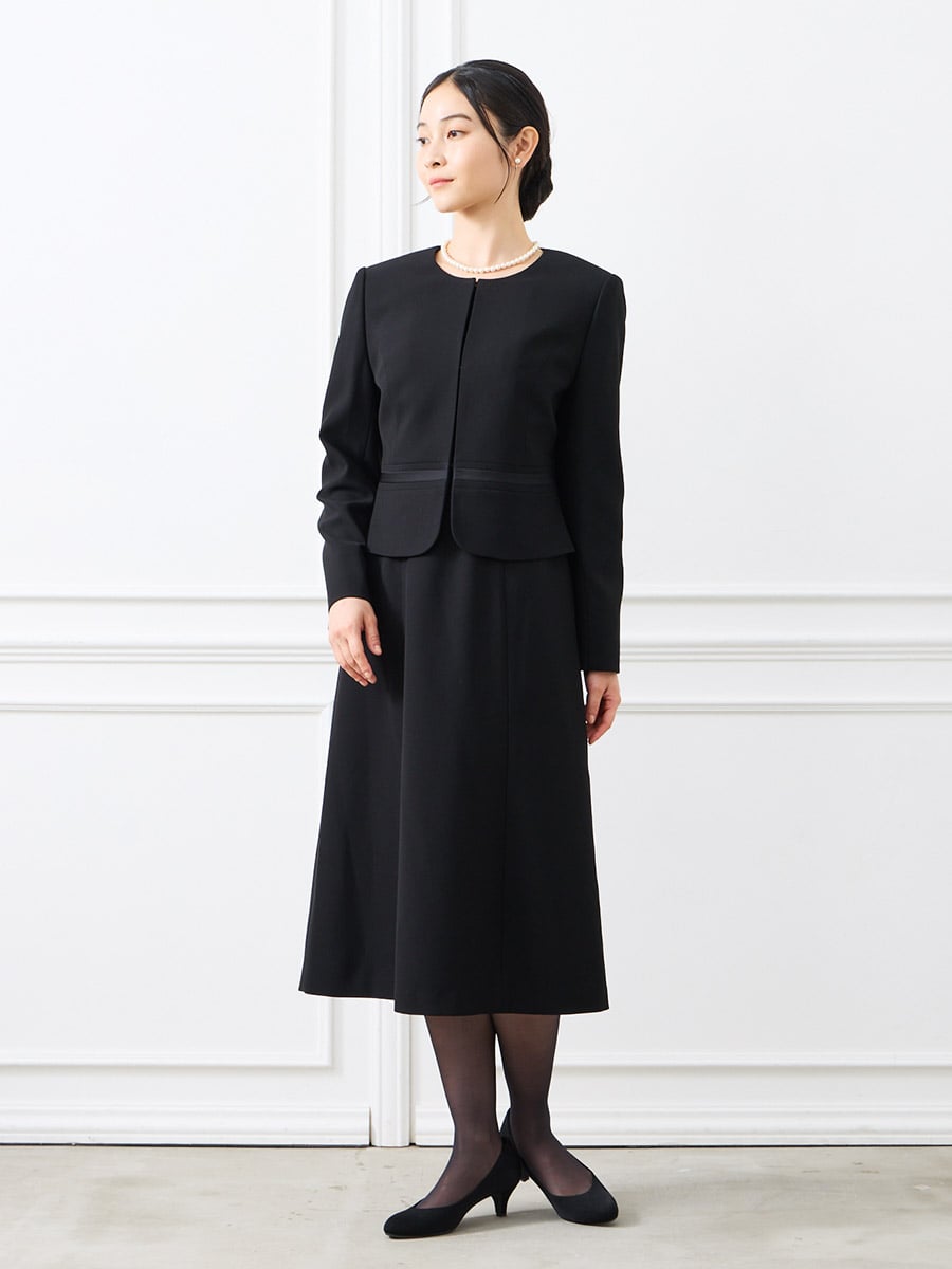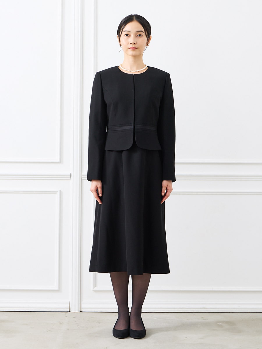 【喪服・礼服】【洗える・マシンウォッシャブル】ブラックフォーマルアンサンブル(グログラン切り替えノーカラージャケット 前開きフレアワンピース)