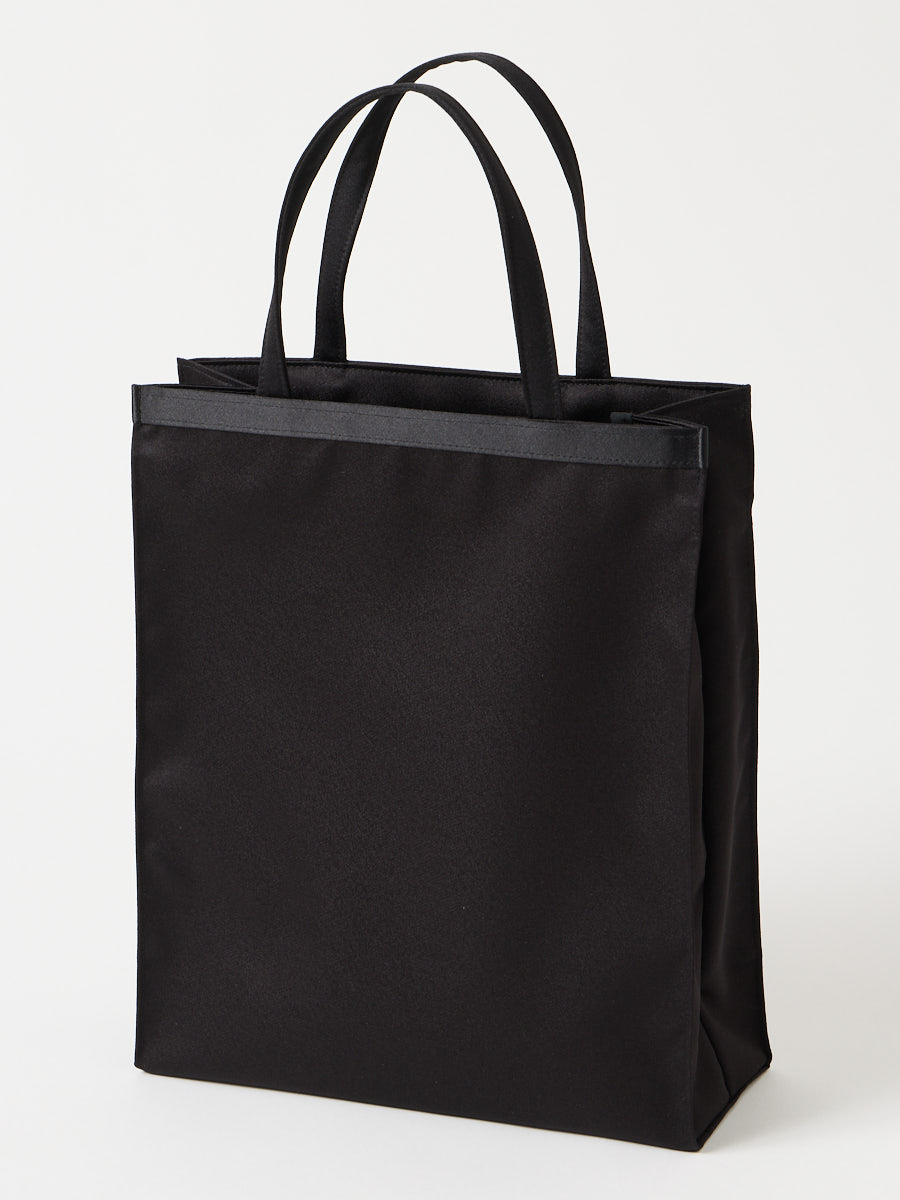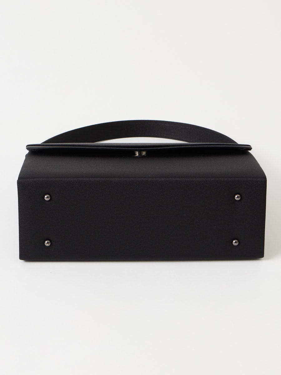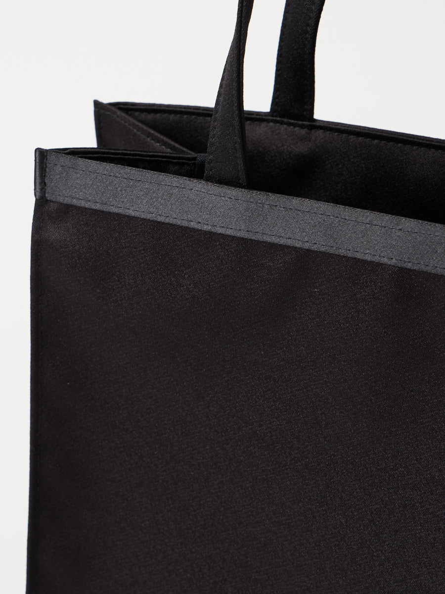 サテン切り替えのすっきりしたデザインが、飽きの来ない長く愛用できるブラックフォーマルバッグ。