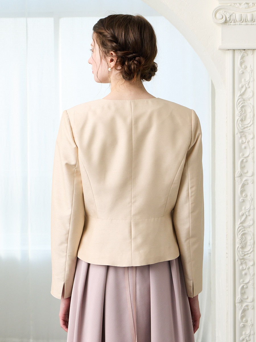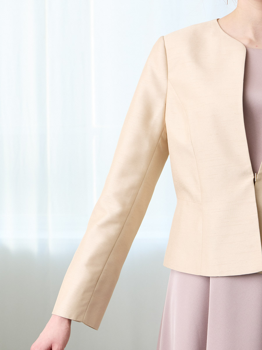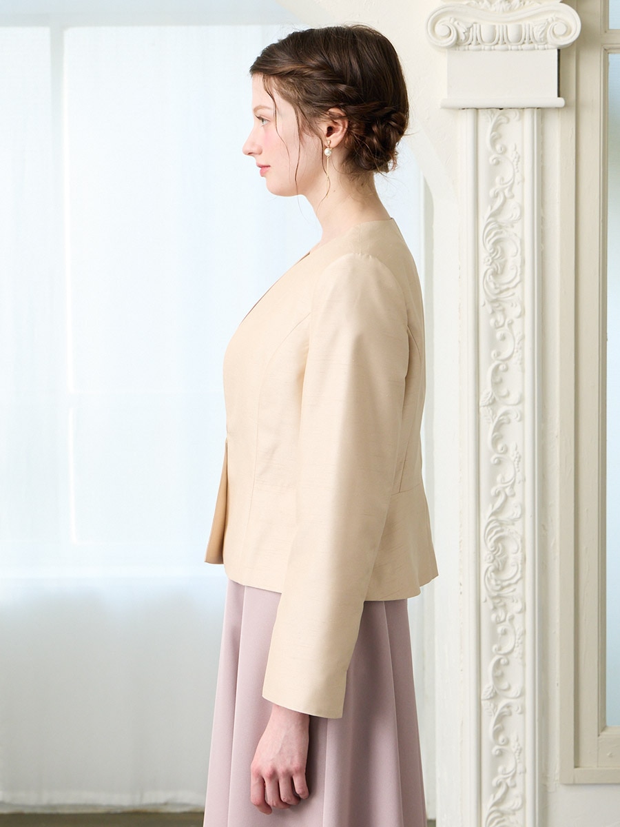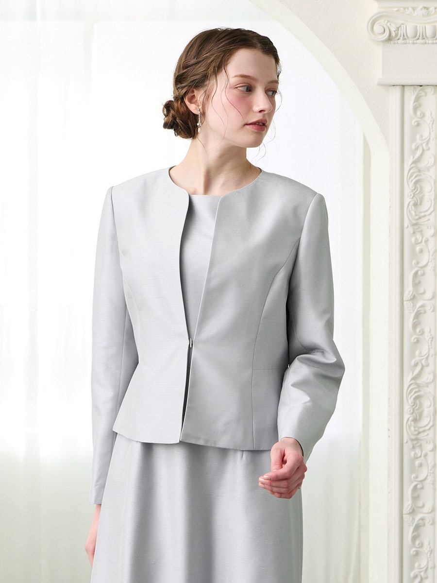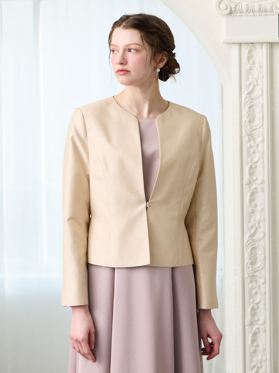 お手持ちのお洋服にはもちろん、同素材のシャンタン素材を使用したドレス(品番:0328-6-00800)(品番:0328-7-01300)と合わせてアンサンブルとしての着用もおすすめです。
