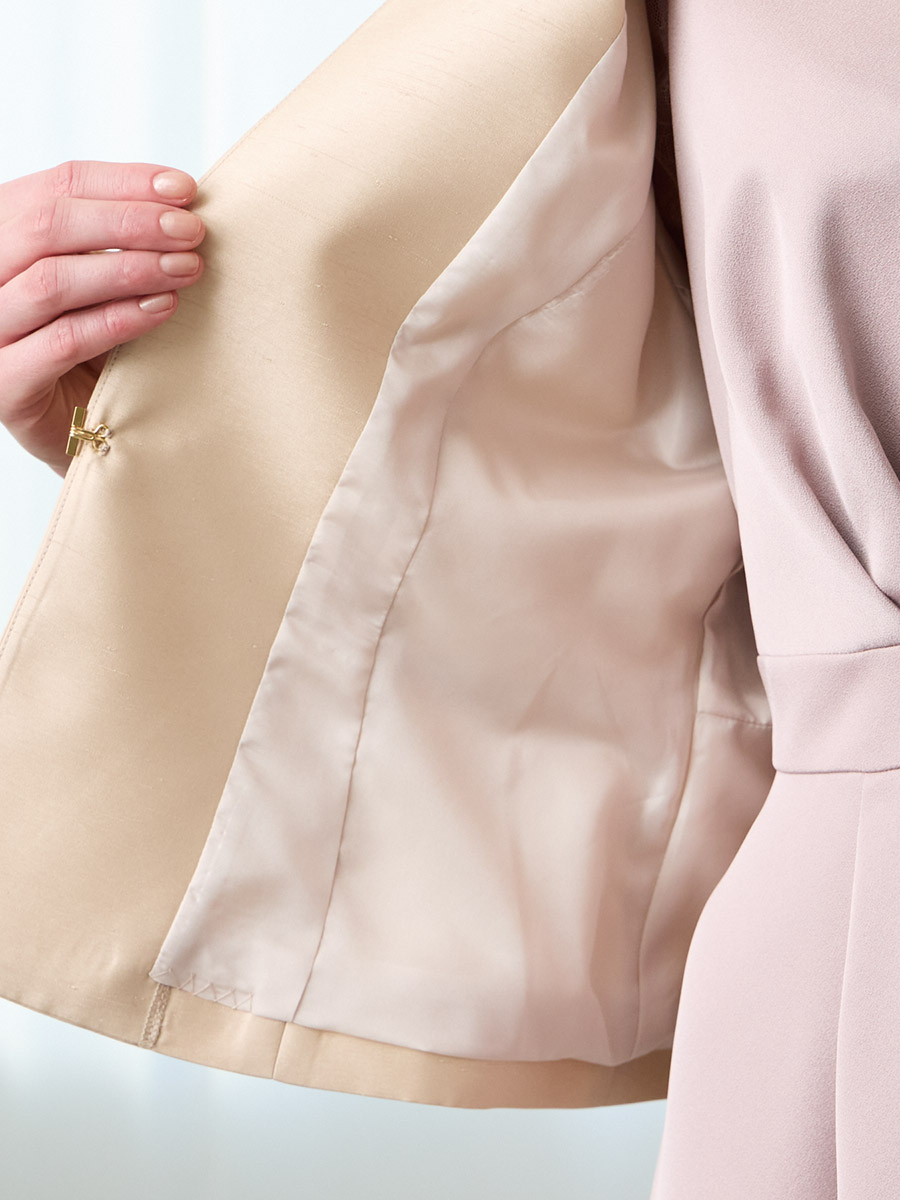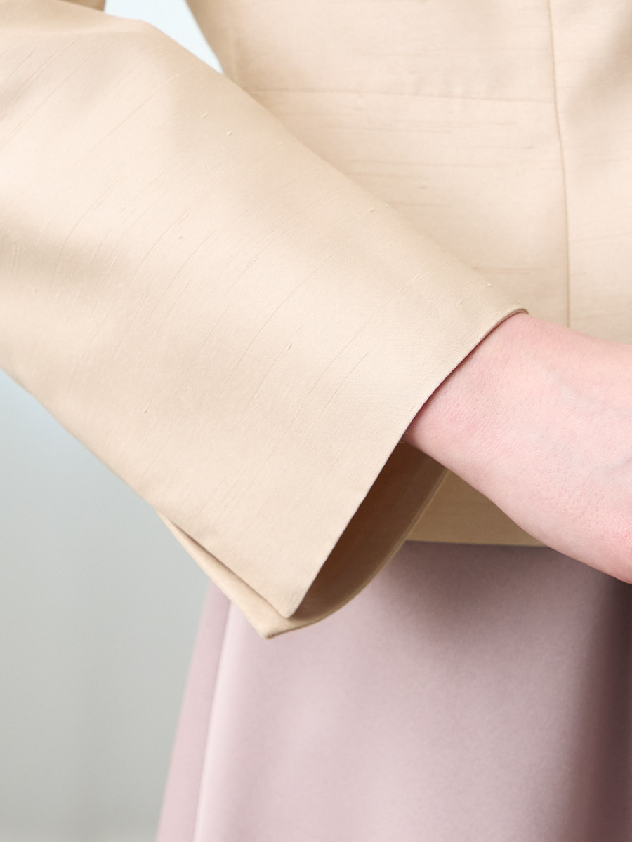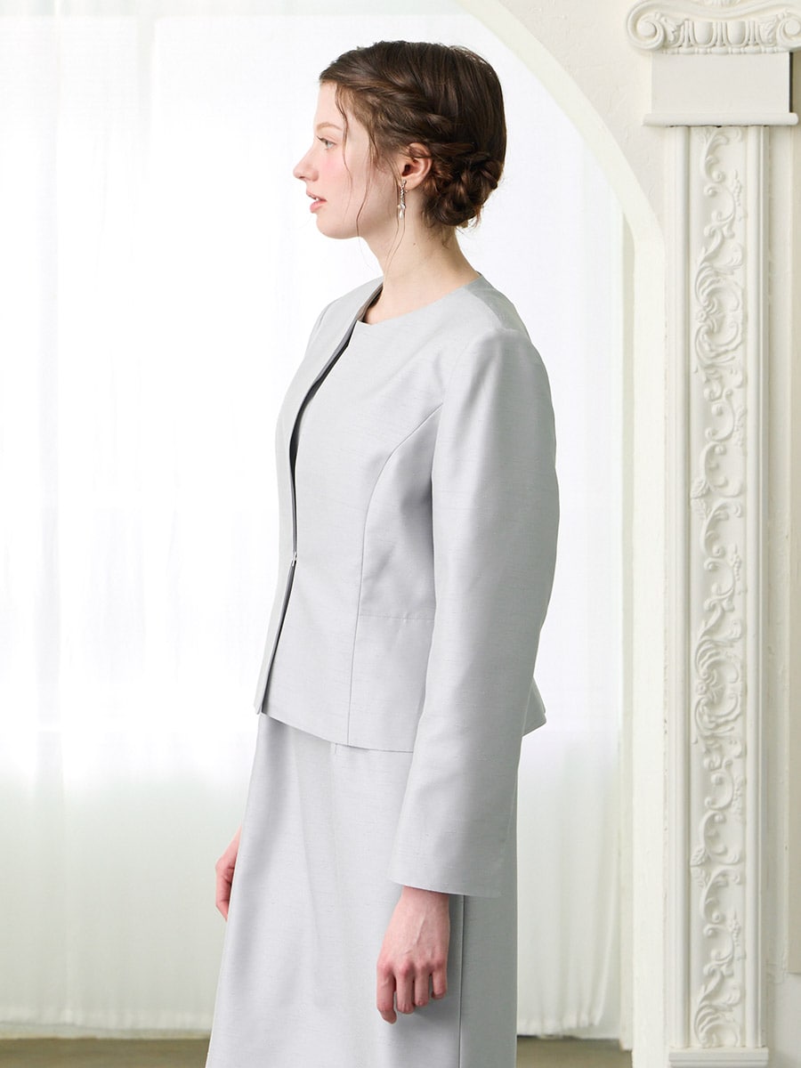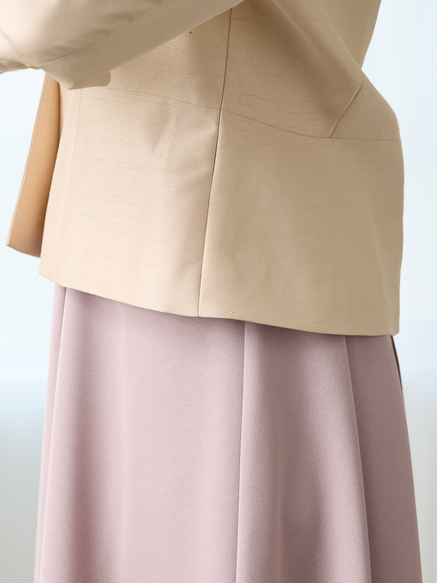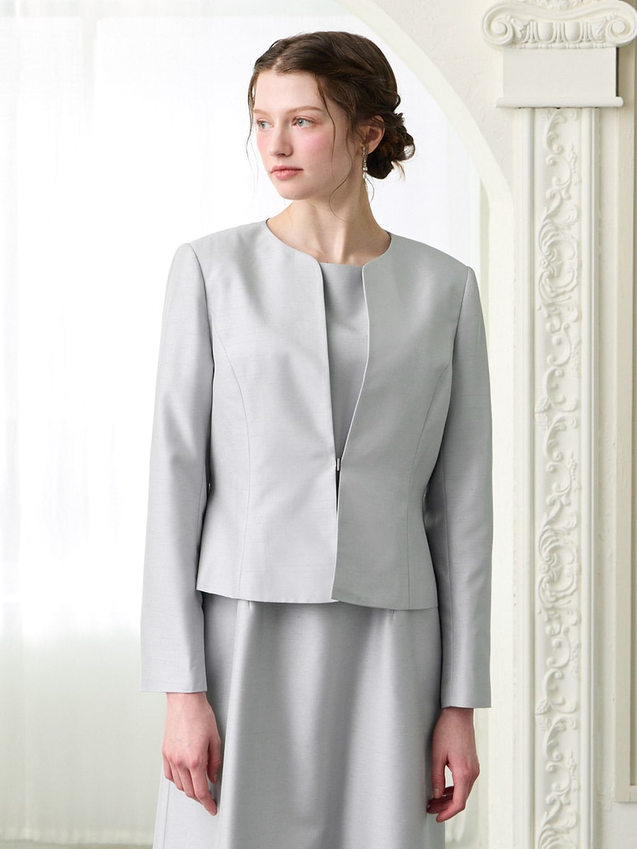 お手持ちのお洋服にはもちろん、同素材のシャンタン素材を使用したドレス(品番:0328-6-00800)(品番:0328-7-01300)と合わせてアンサンブルとしての着用もおすすめです。