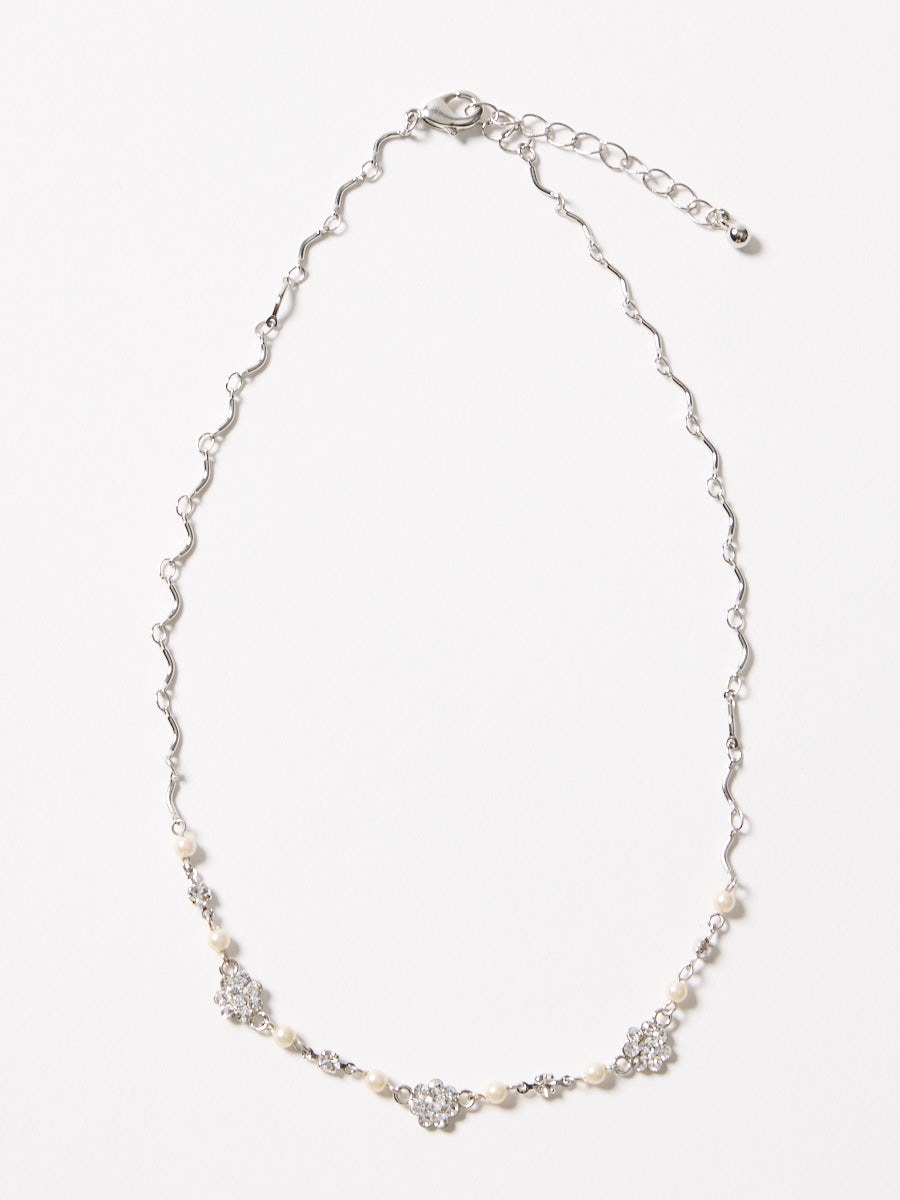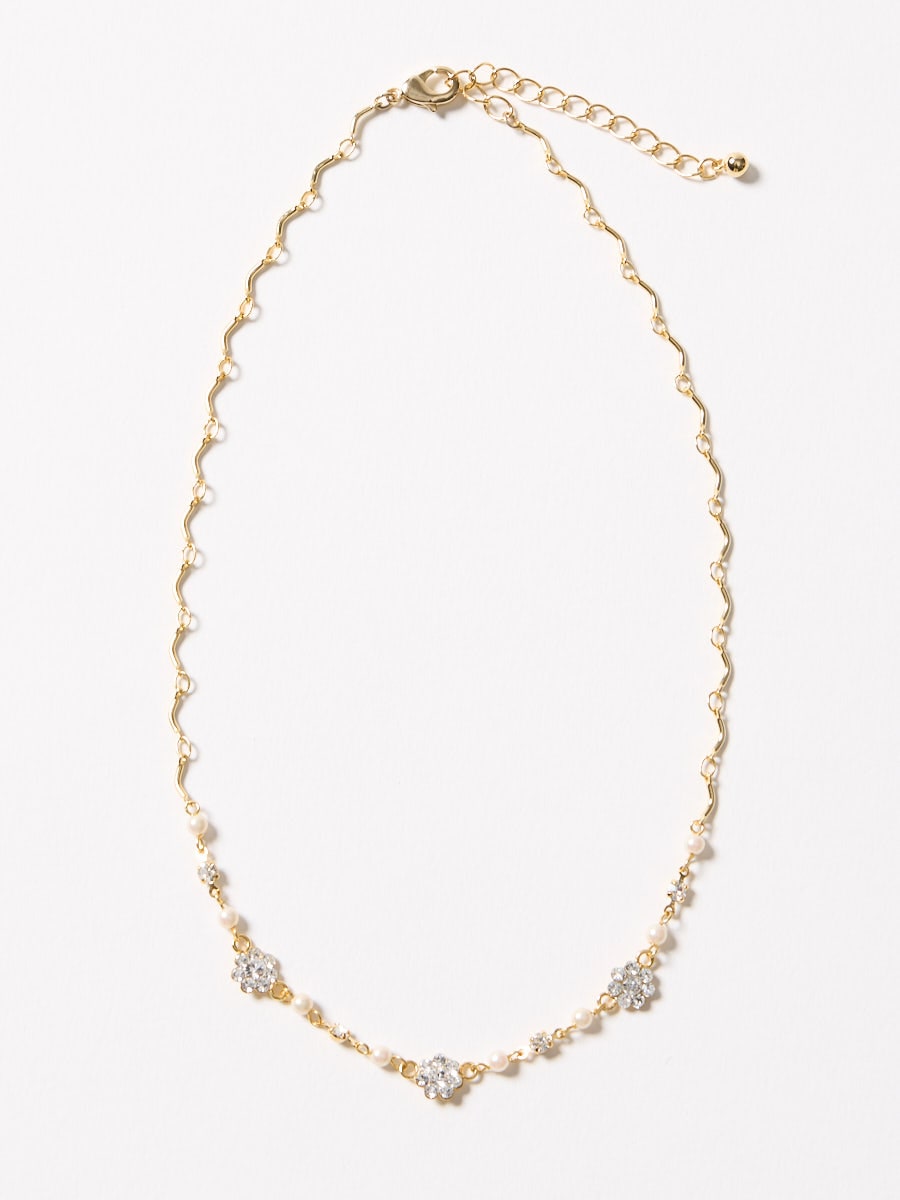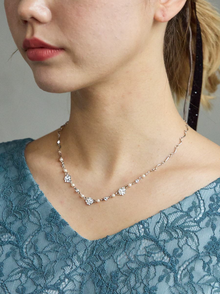 華奢なウェーブチェーンに可愛らしいフラワーモチーフをあしらったネックレス。