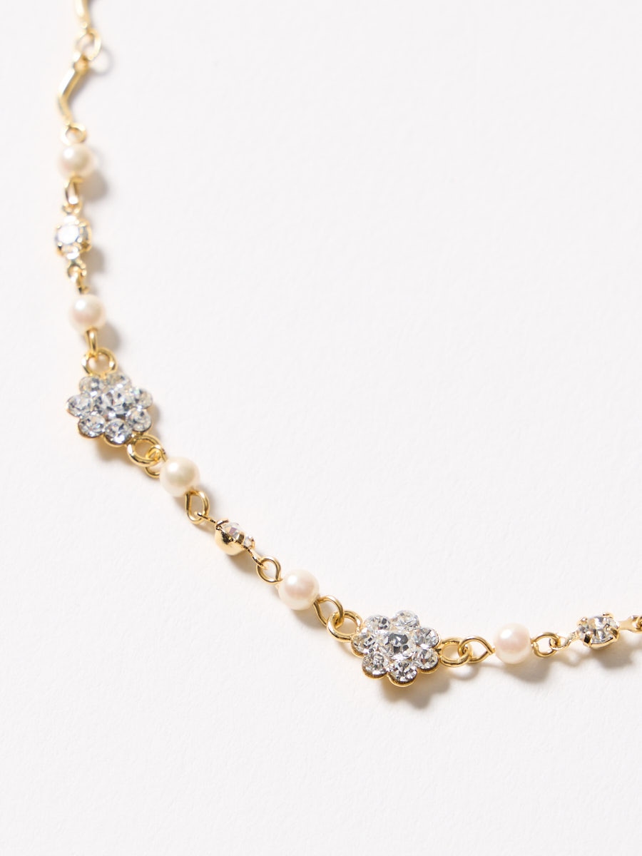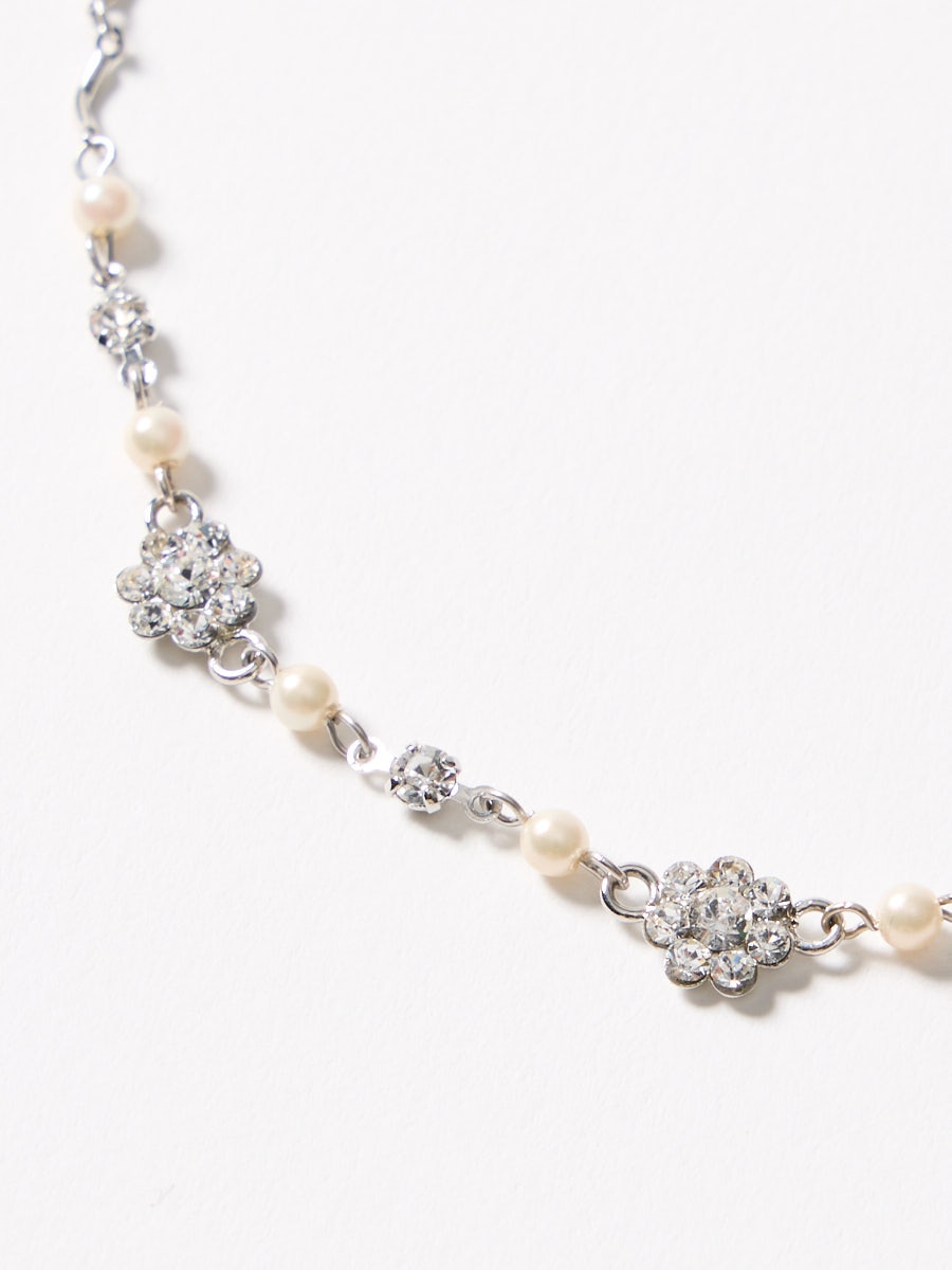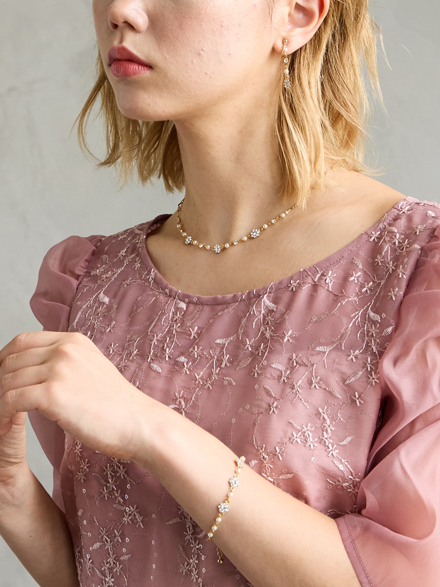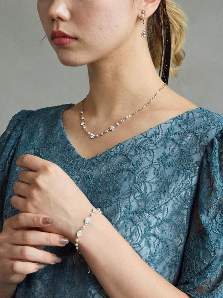 フラワーモチーフがレース使いのドレスとの相性も良く、柔らかさのでるウェーブチェーンがフェミニンさを演出。