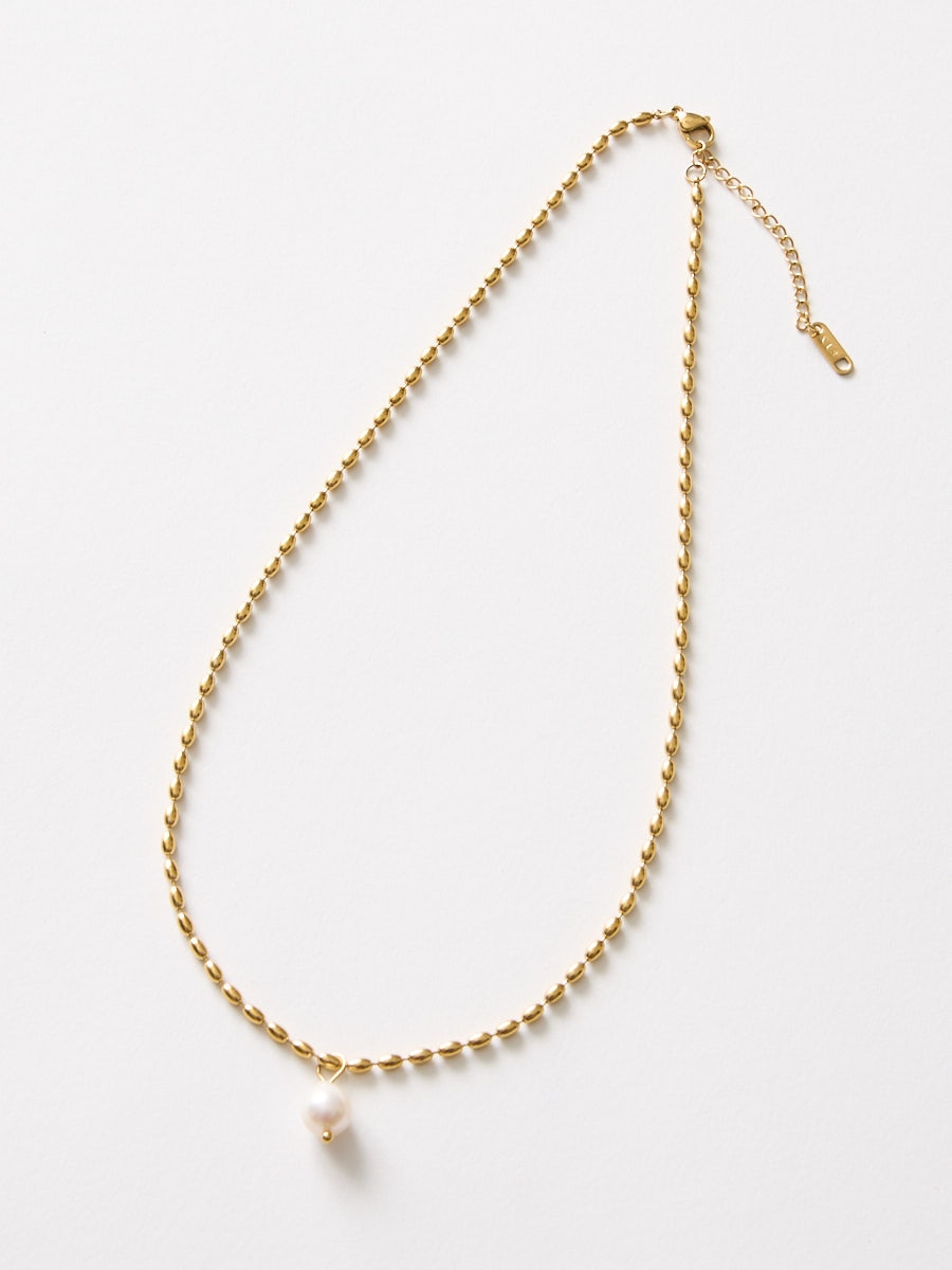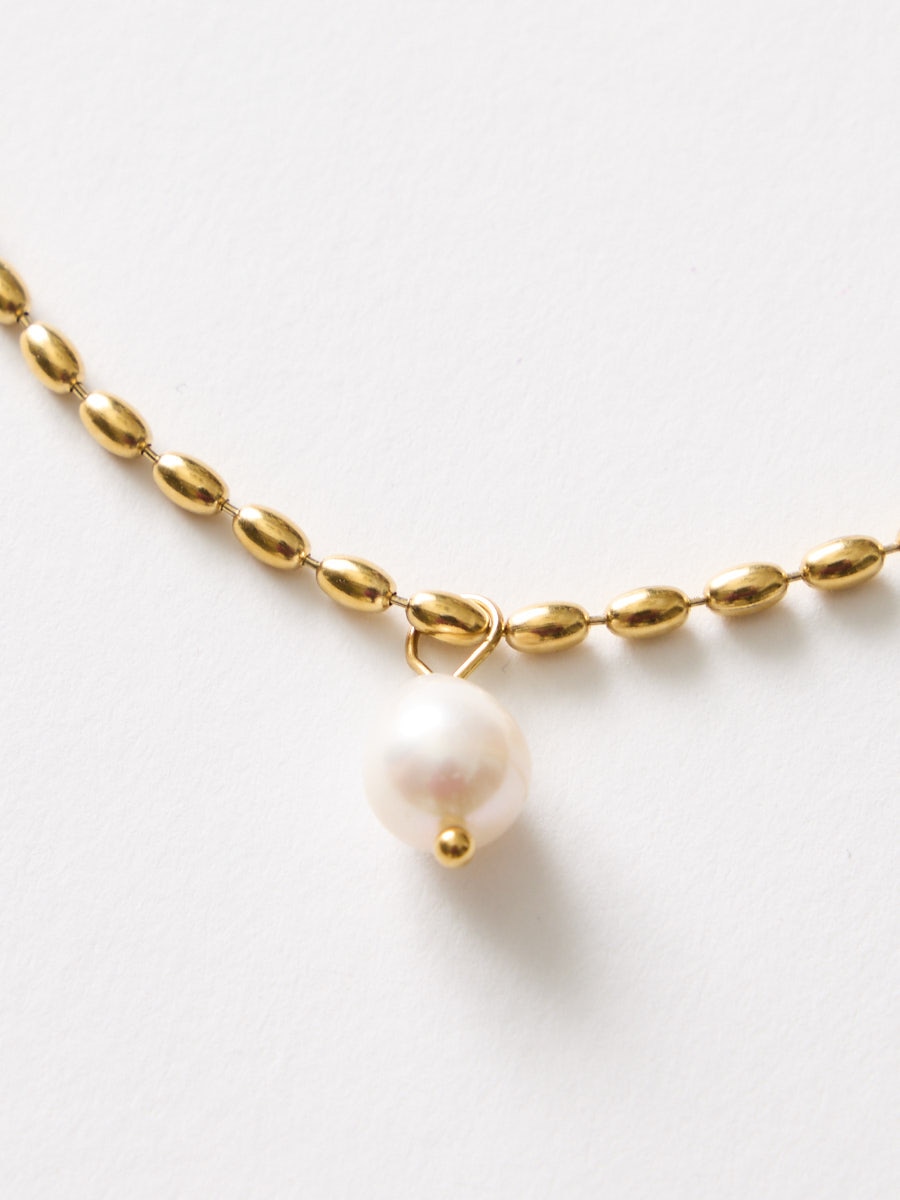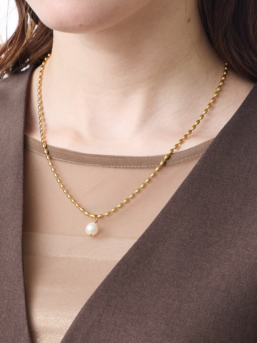 上品な艶の淡水パールと、繊細なボールチェーンを組み合わせたシンプルなネックレス。