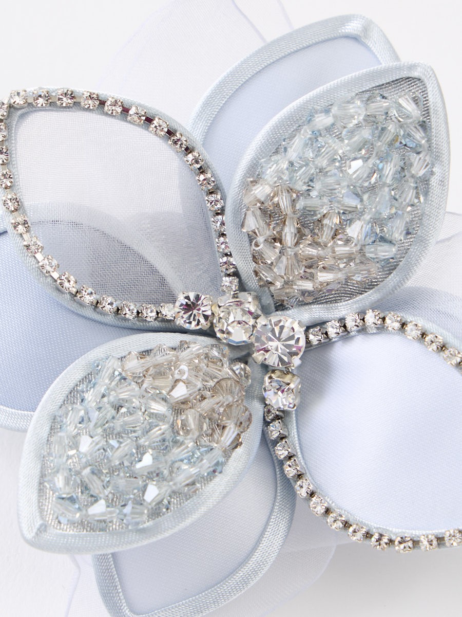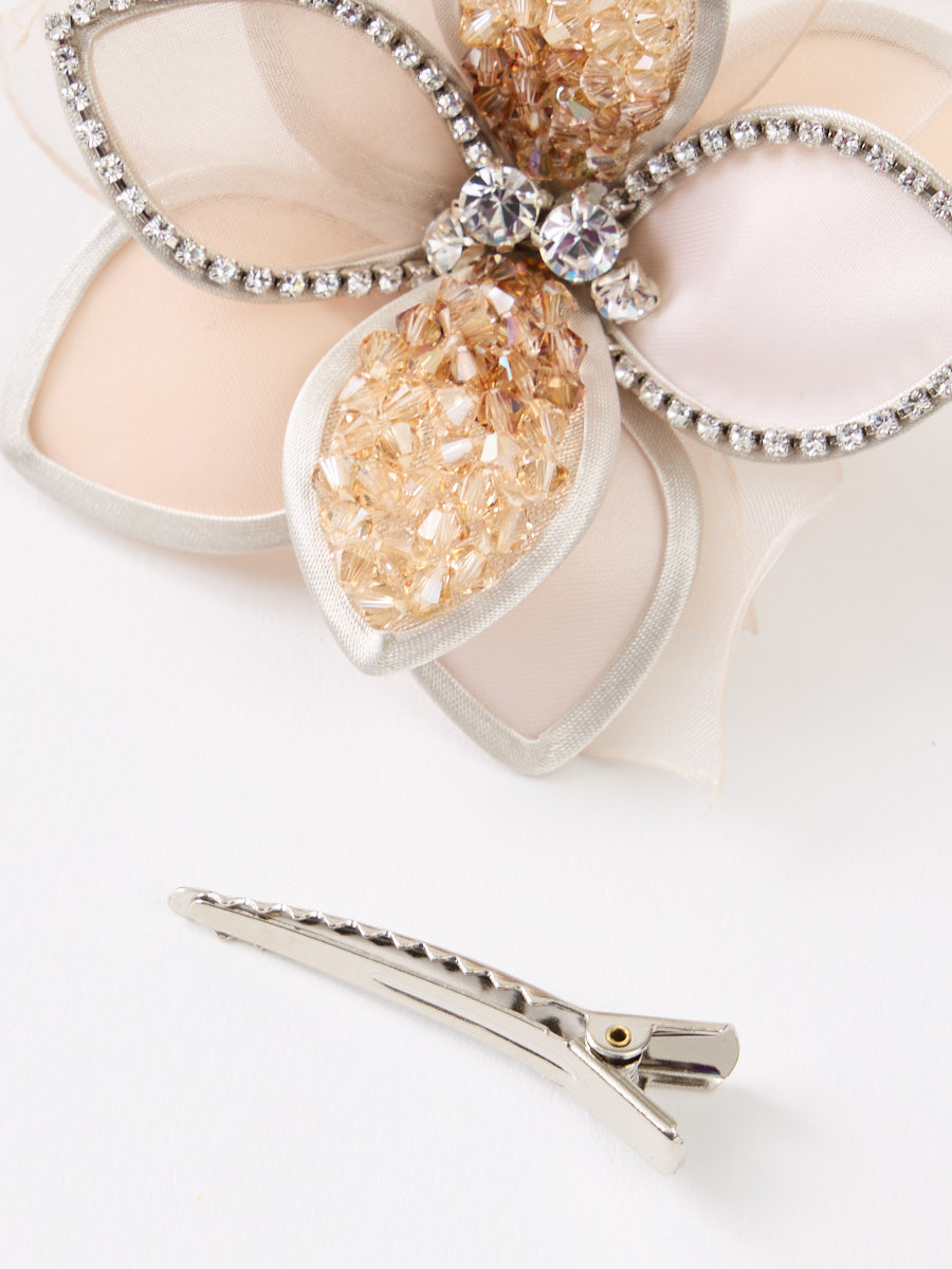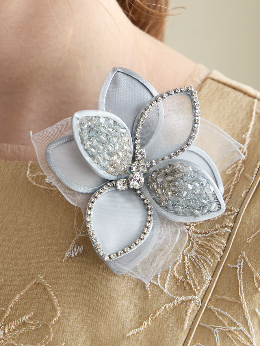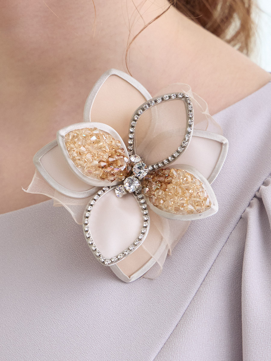 花びらの縁に沿わせたビジューの輝きと花びらをビーズで敷き詰めた繊細なきらめきが、上品で明るい印象にしてくれます。