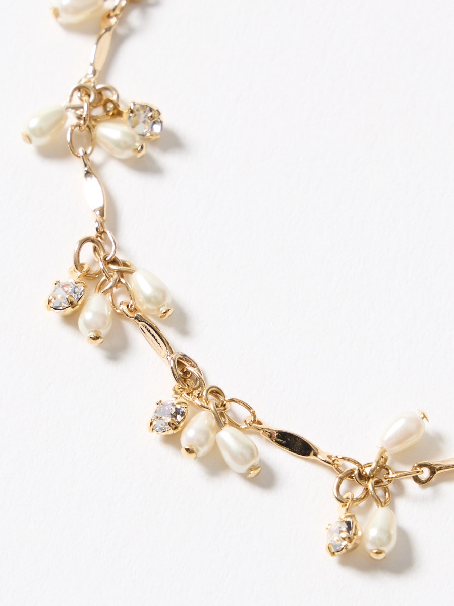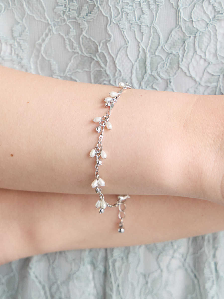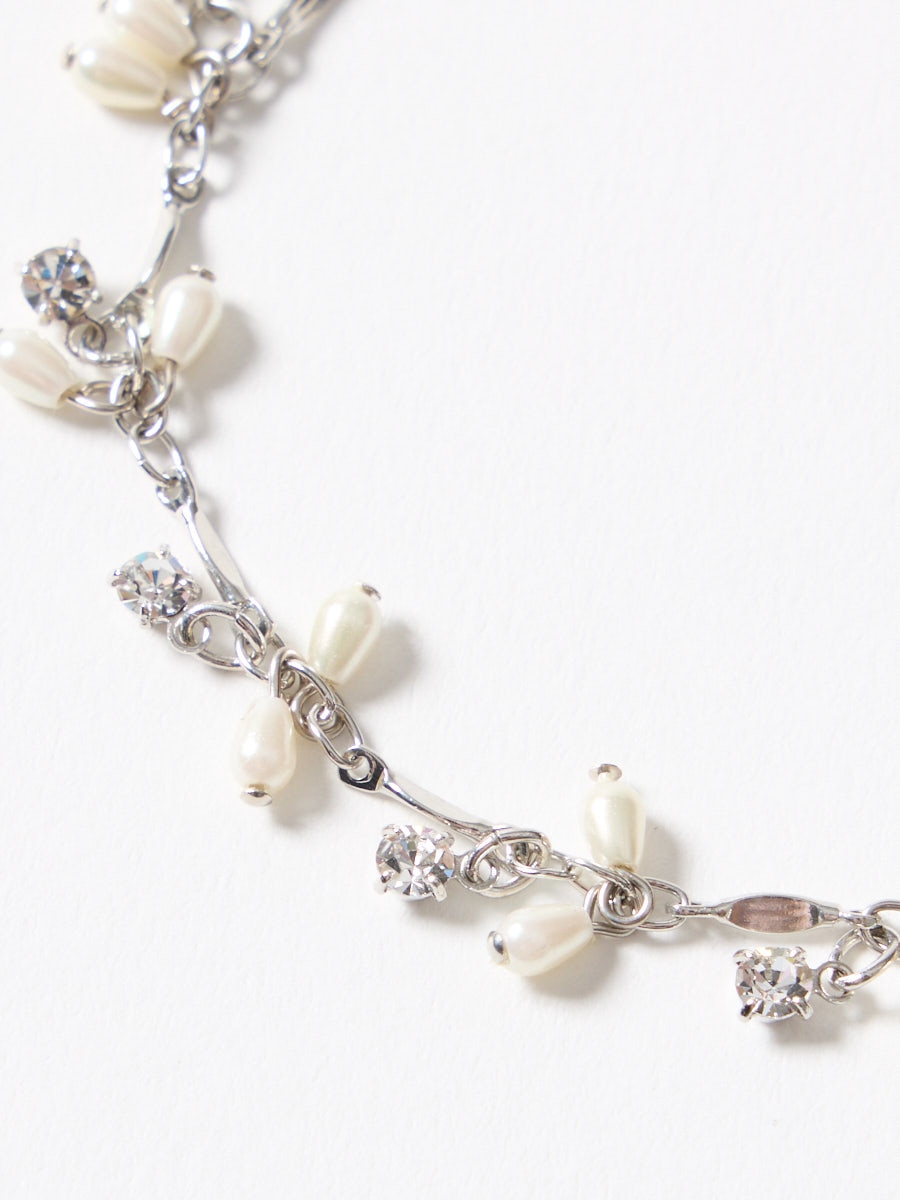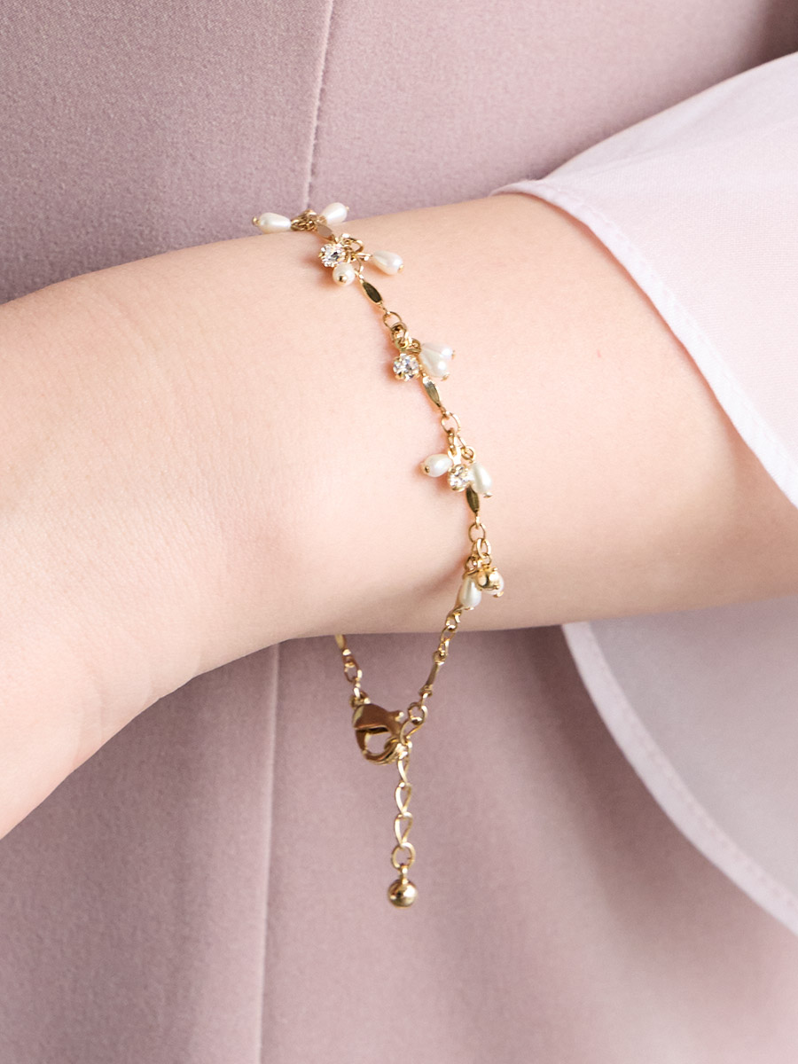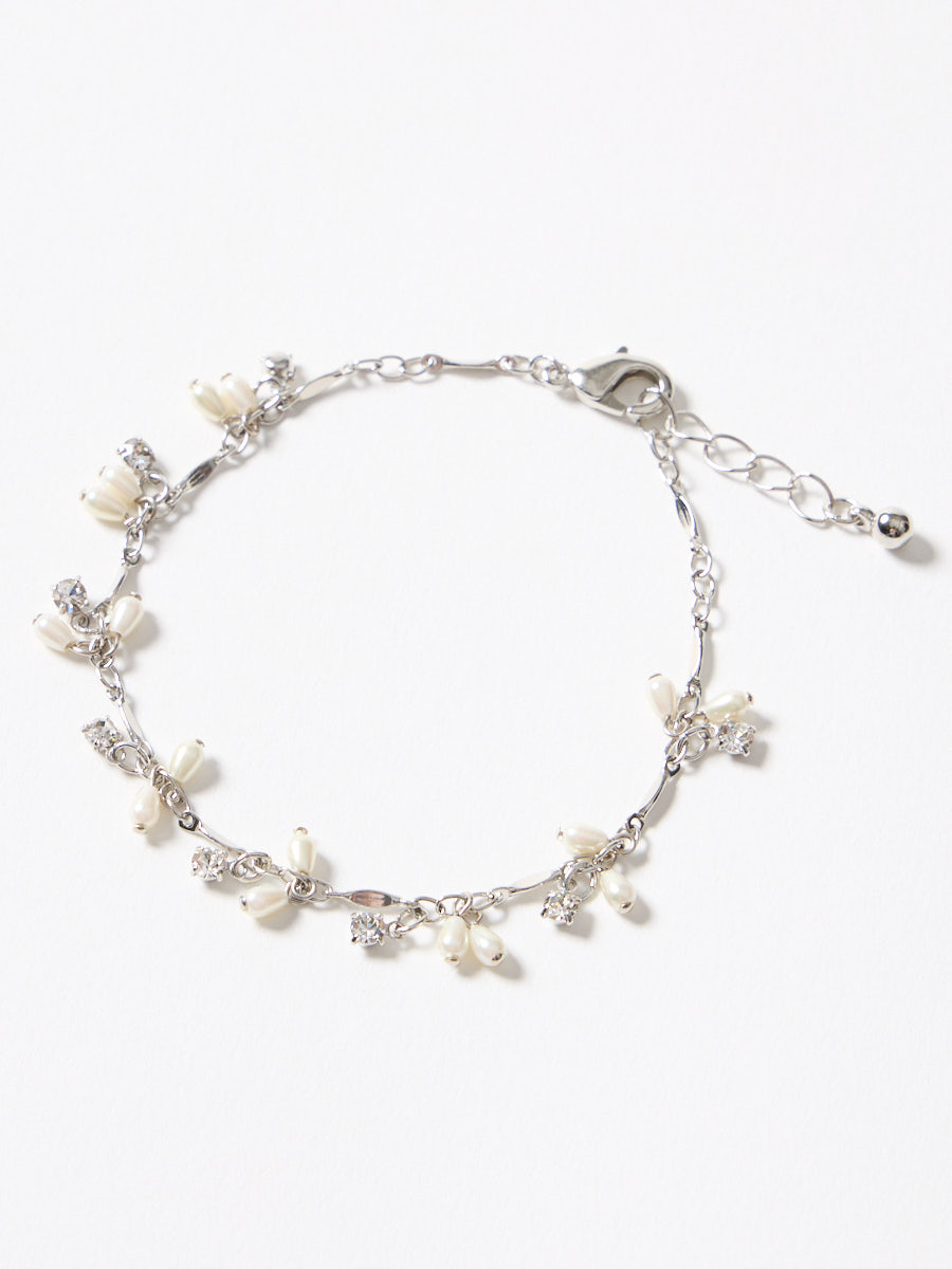 華奢なチェーンにツユ型パールとラインストーンが等間隔にデザインされたブレスレットになります。