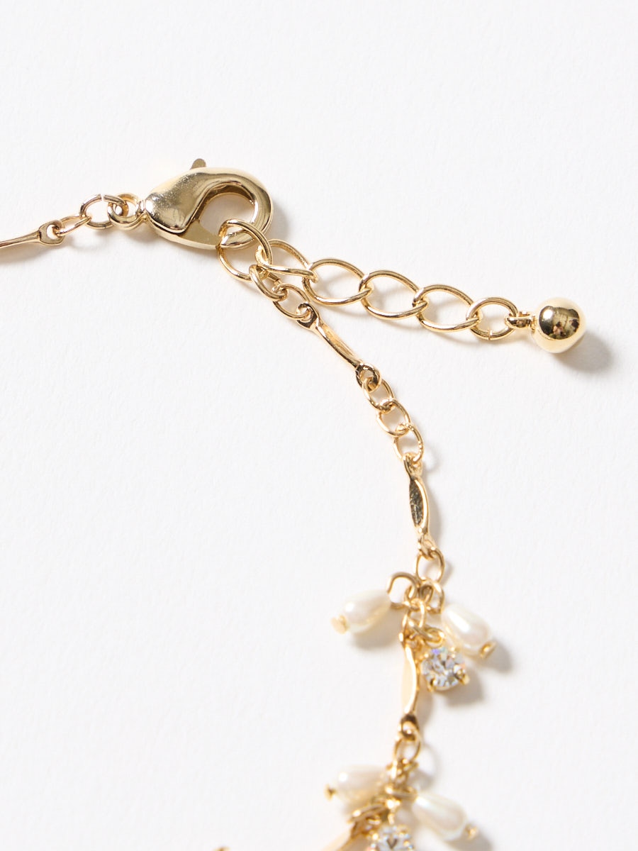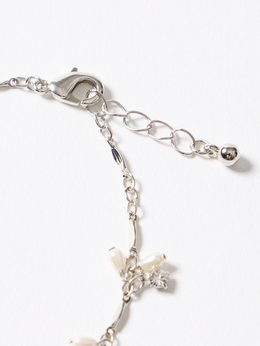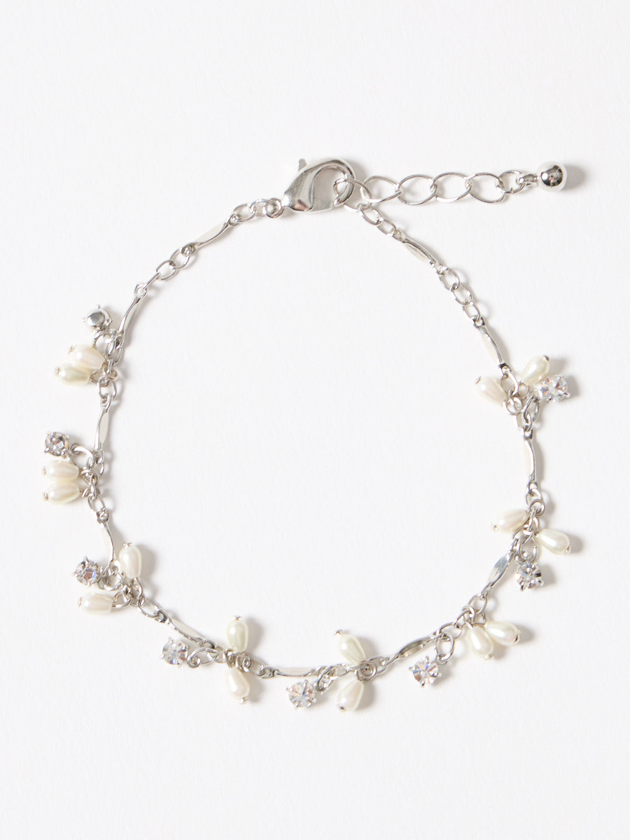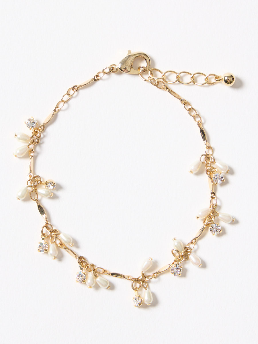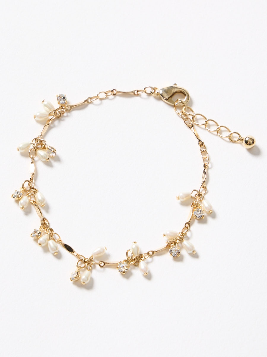 華奢なチェーンにツユ型パールとラインストーンが等間隔にデザインされたブレスレットになります。