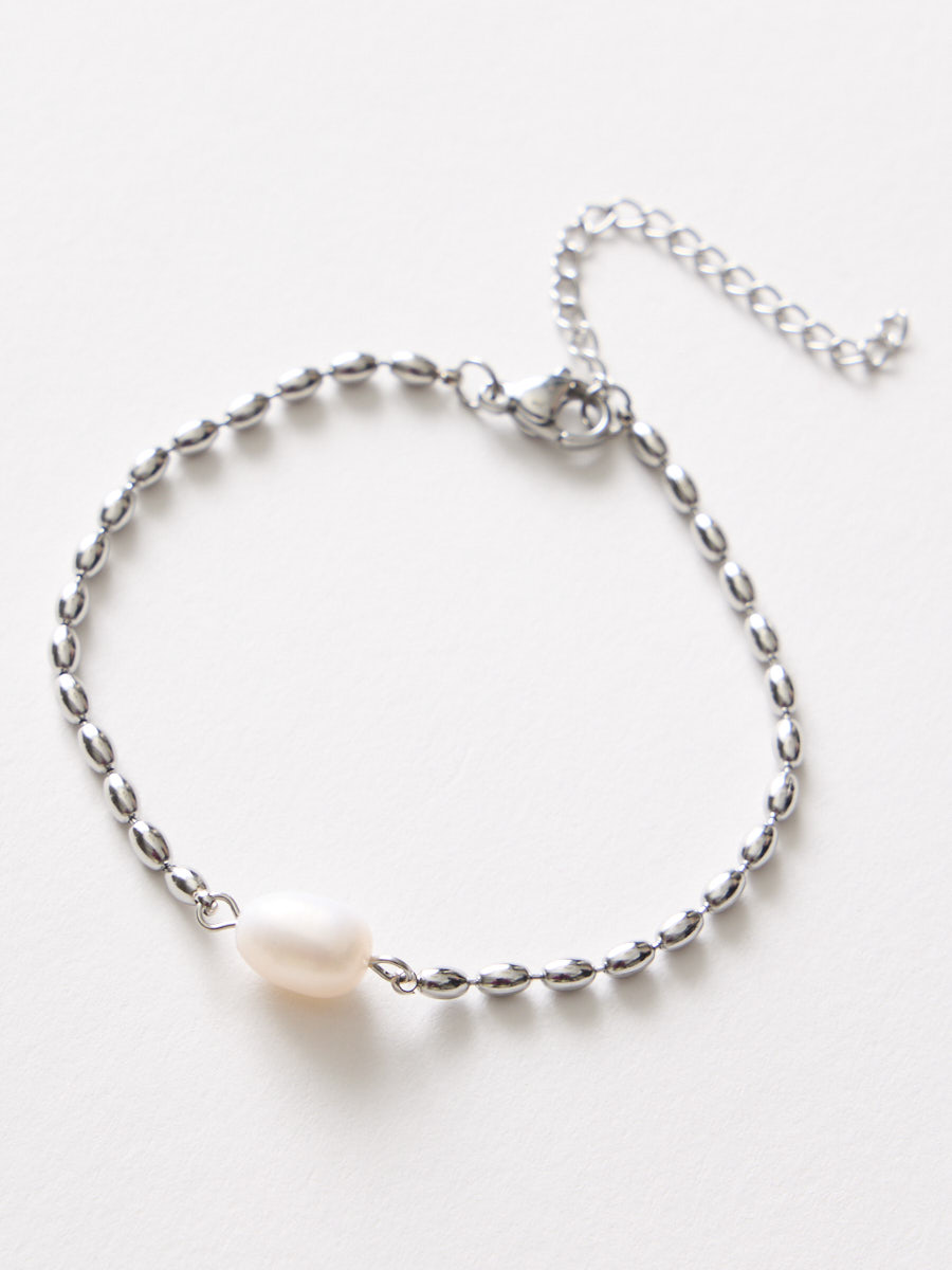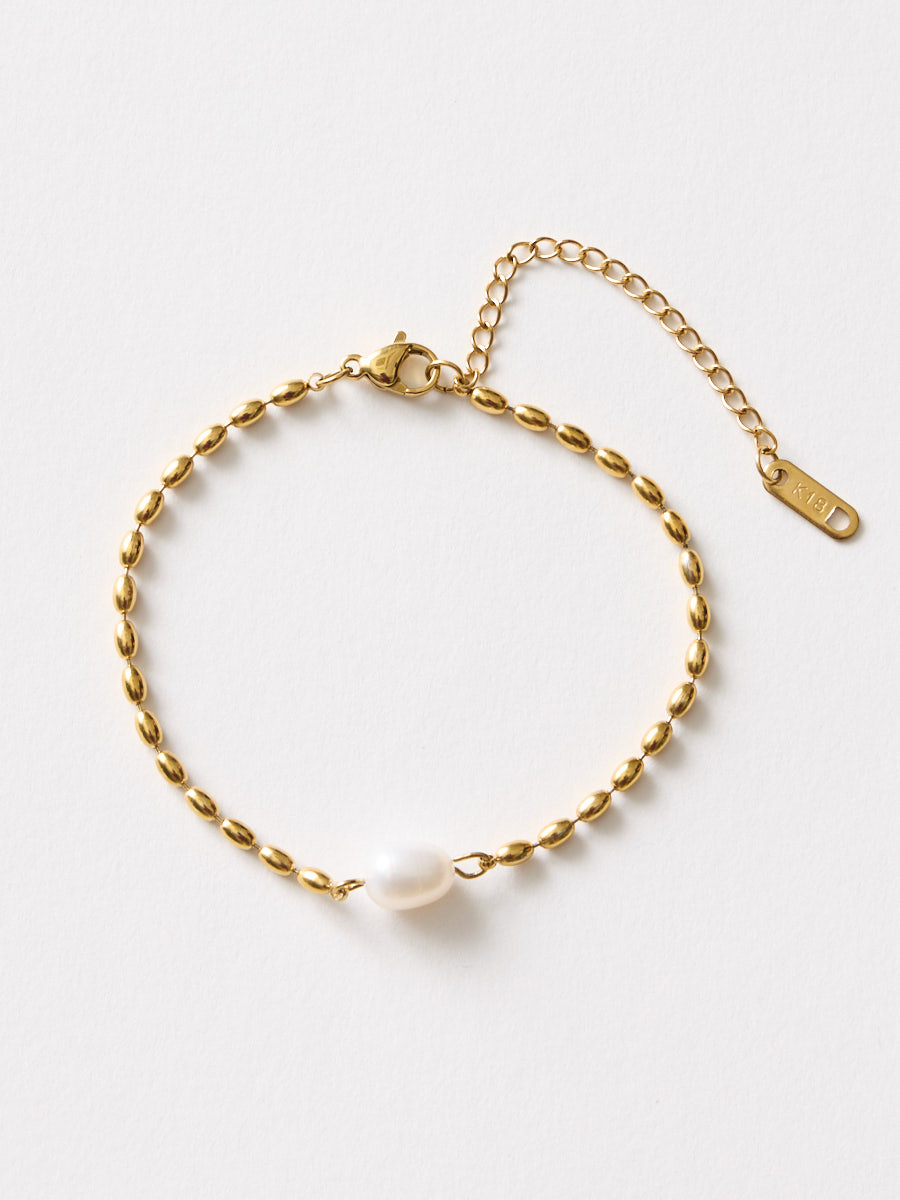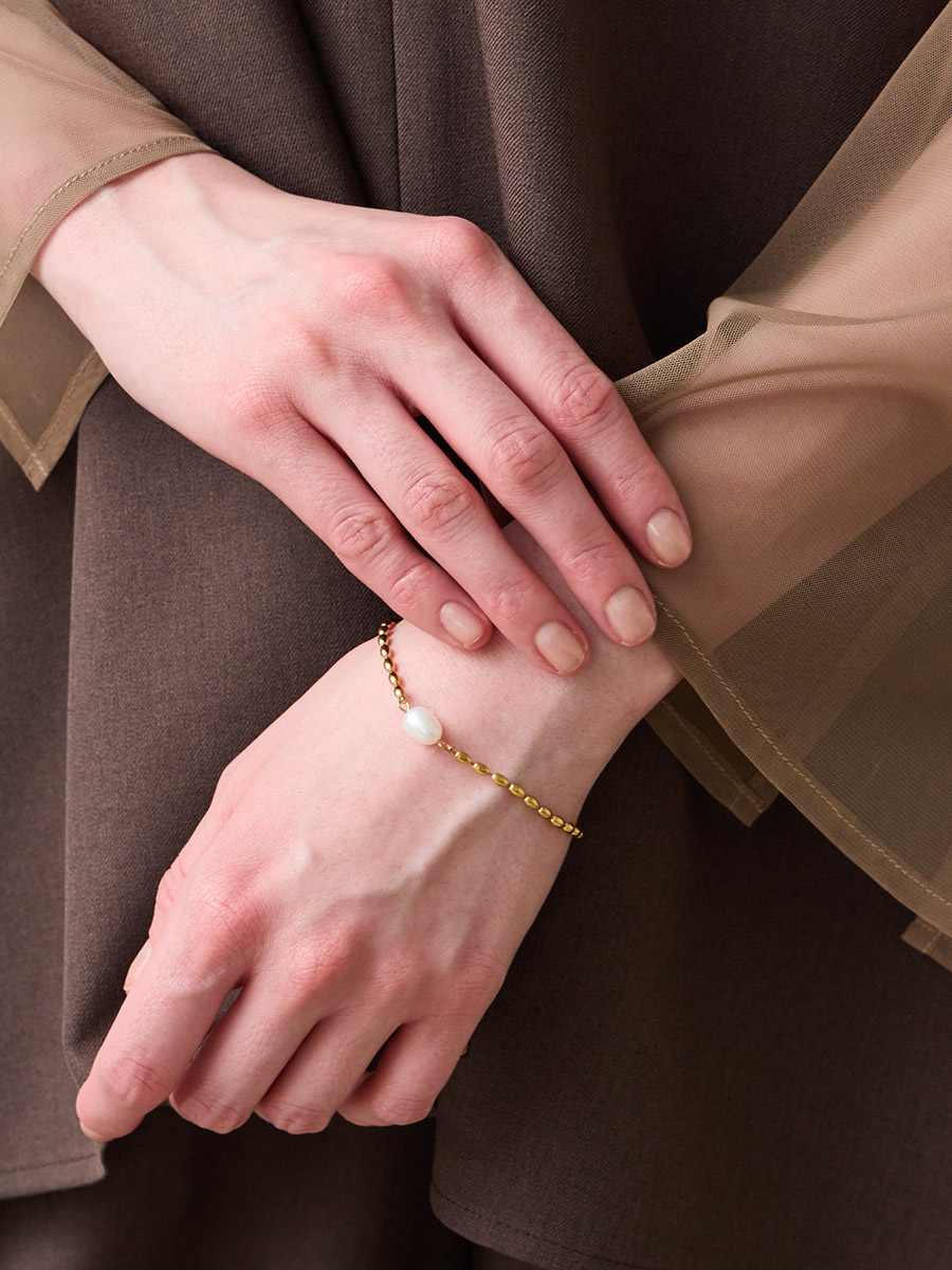 上品な艶の淡水パールと、繊細なボールチェーンを組み合わせたシンプルなブレスレット。