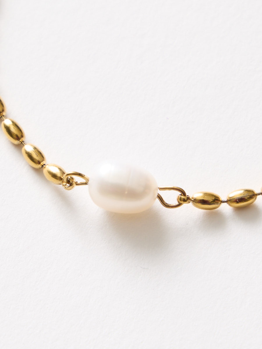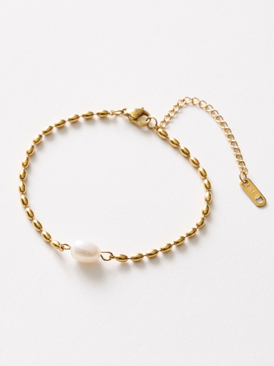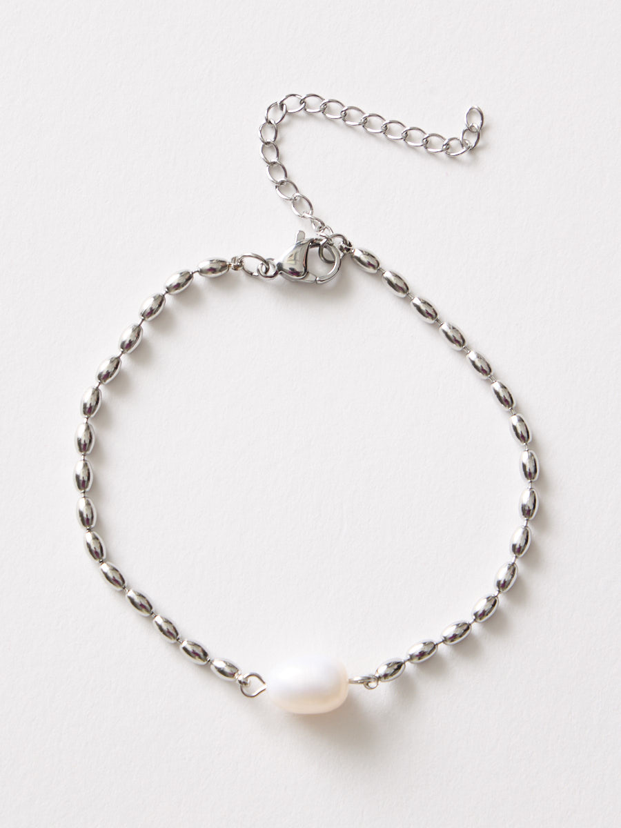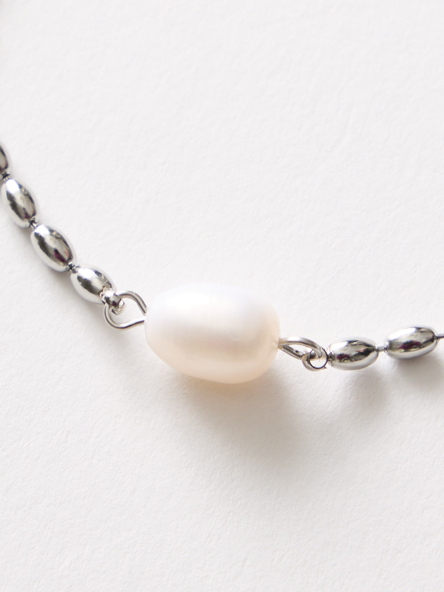 上品な艶の淡水パールと、繊細なボールチェーンを組み合わせたシンプルなブレスレット。
