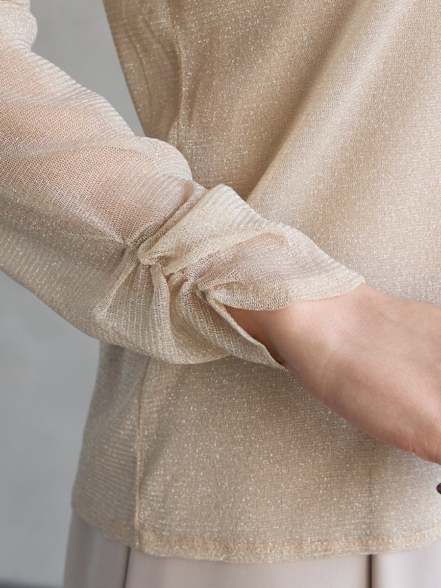 袖のシャーリングがおしゃれなので1枚で着ても良いですし、ジャケットなどのインナーにもぴったりです。光沢があるので、華やかに着こなせます。