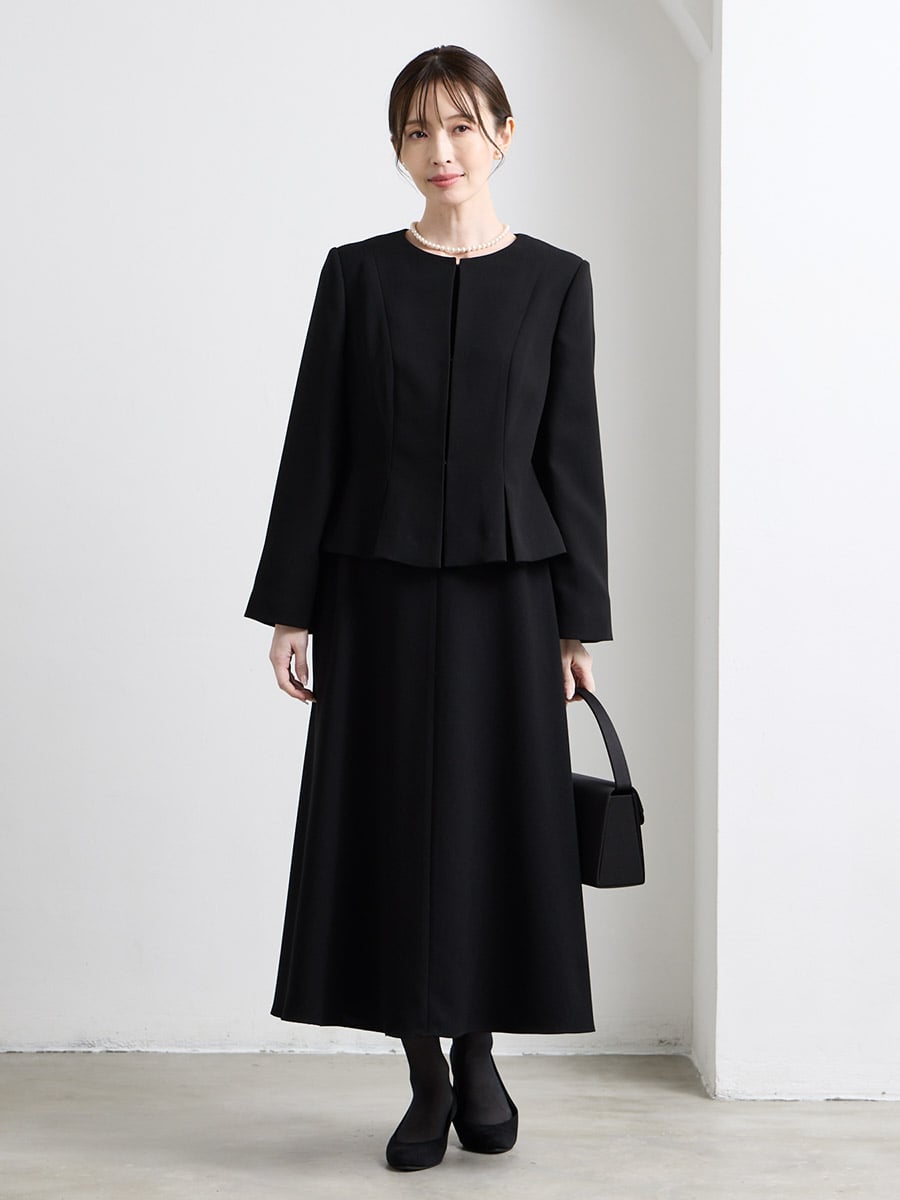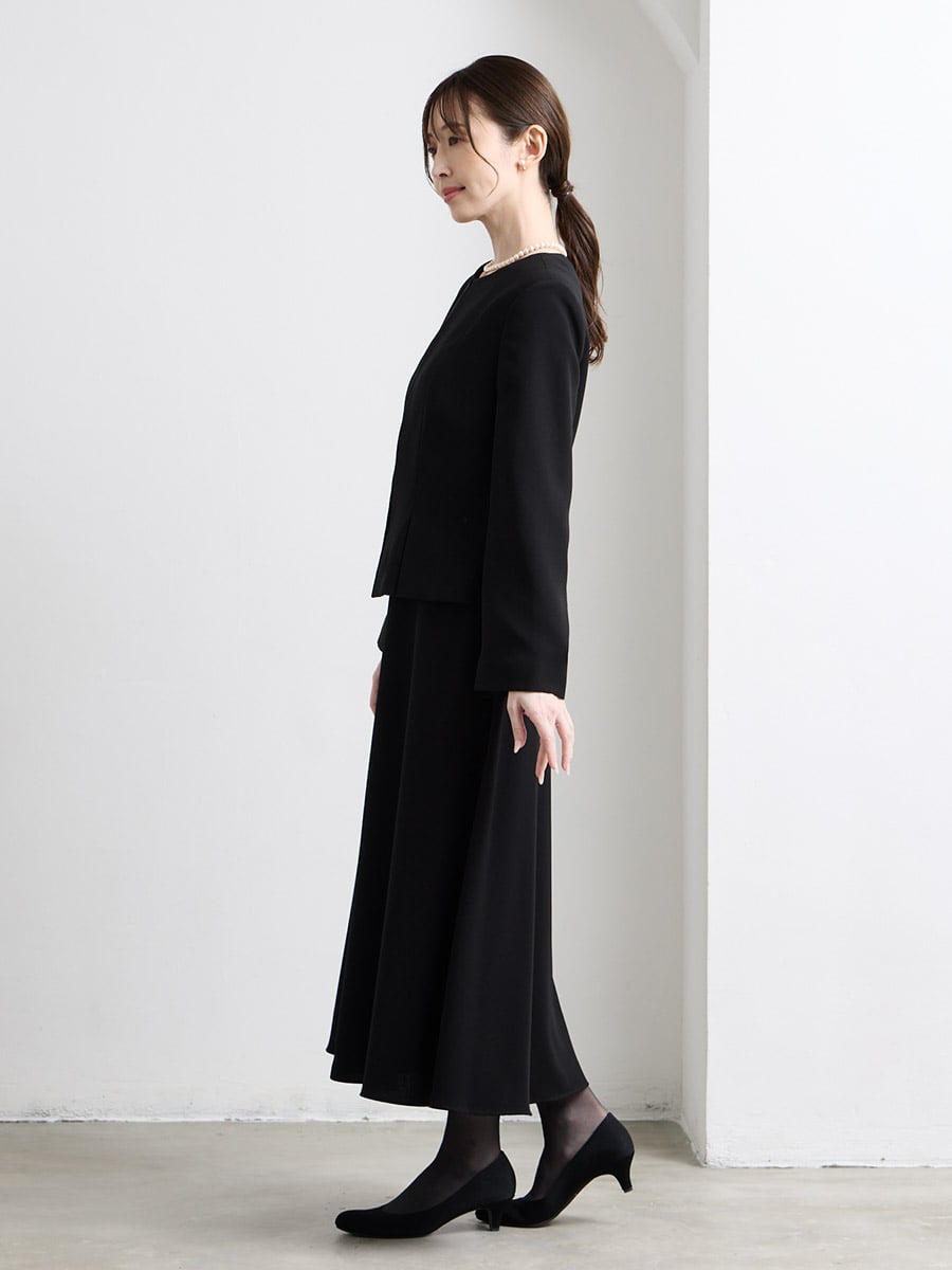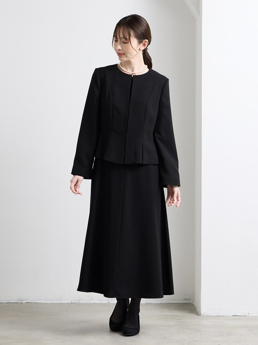 【喪服・礼服】カフススリーブAラインフレアブラックワンピース×ノーカラーボックスタックジャケット2点セット