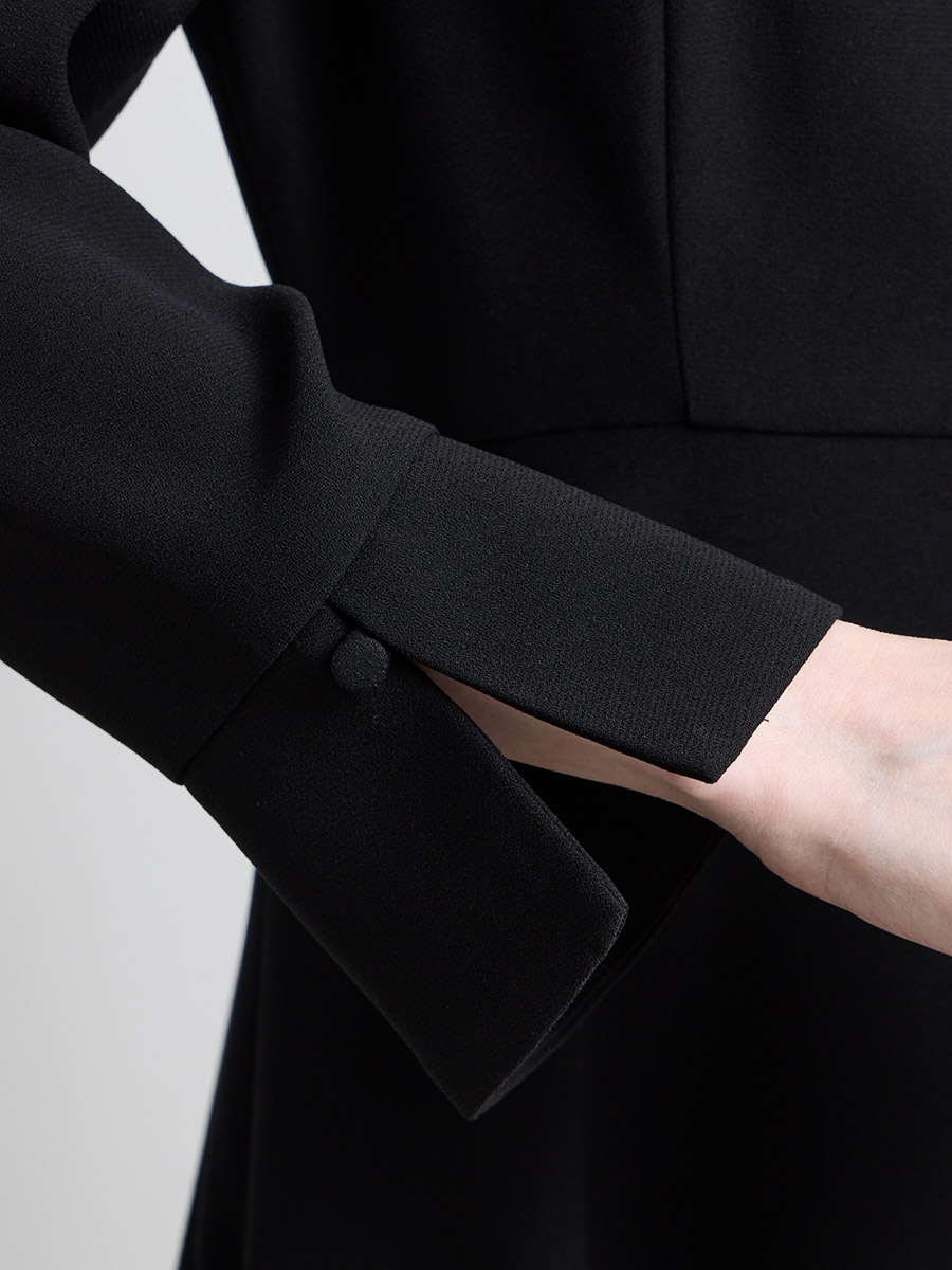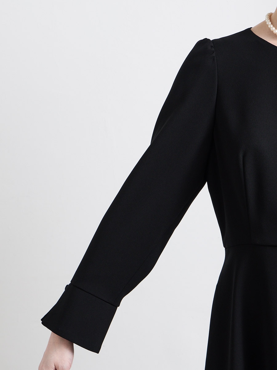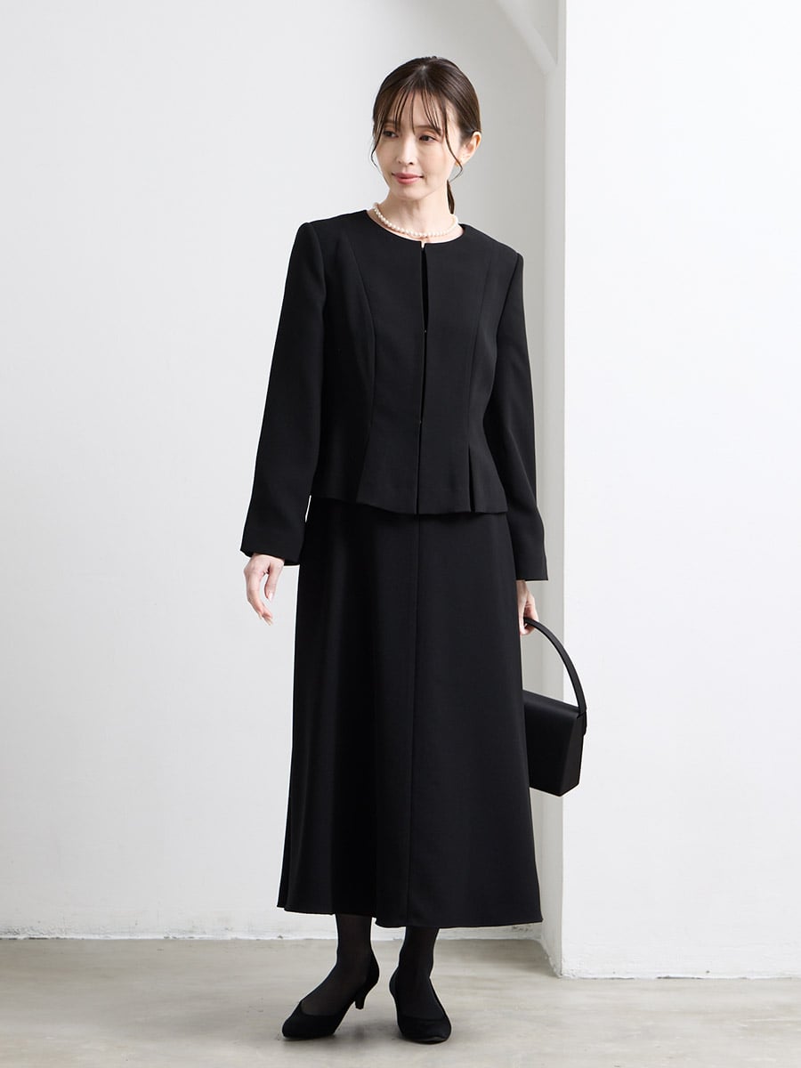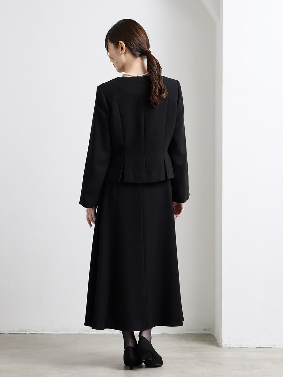 【喪服・礼服】カフススリーブAラインフレアブラックワンピース×ノーカラーボックスタックジャケット2点セット