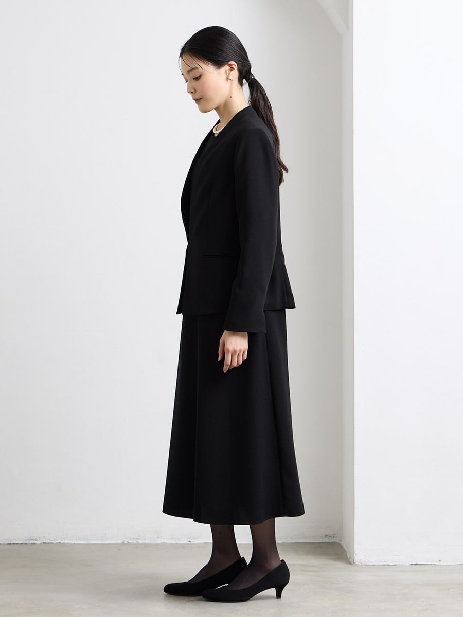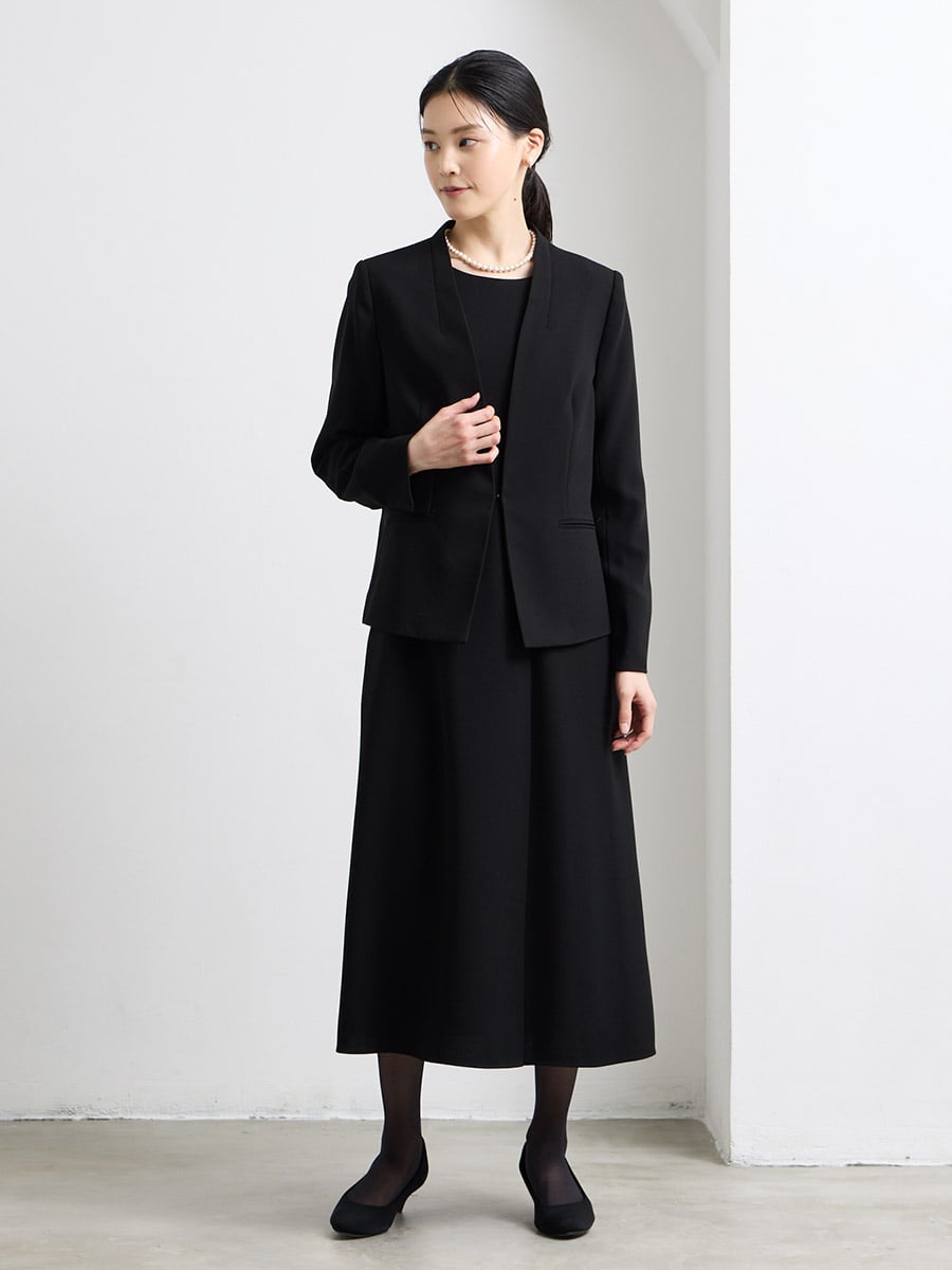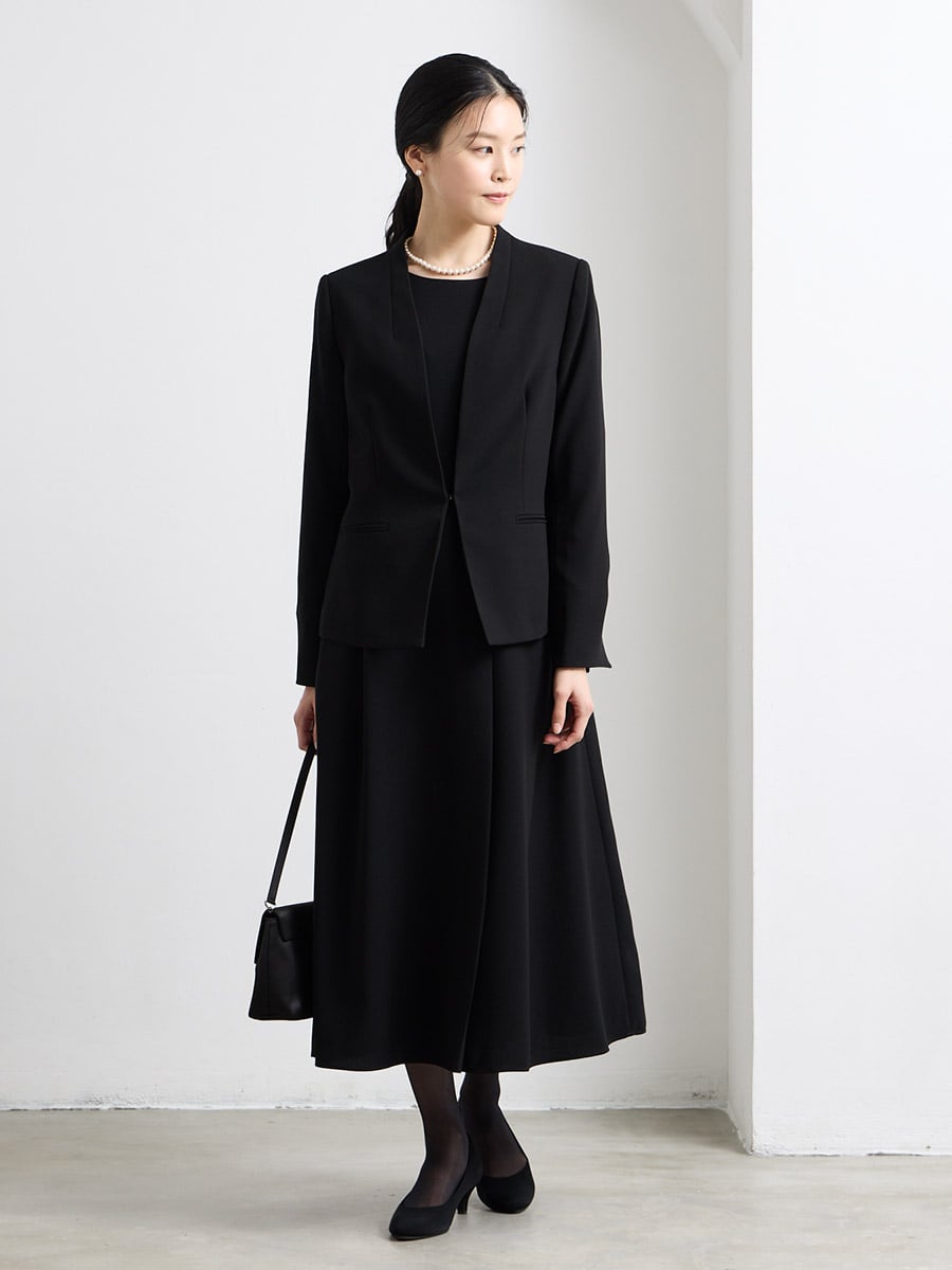 【喪服・礼服】【ウォッシャブル】アシンメトリータックテントラインブラックワンピース×Vネックノーカラージャケット2点セット