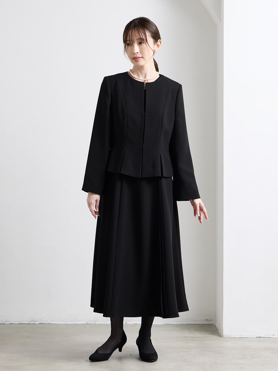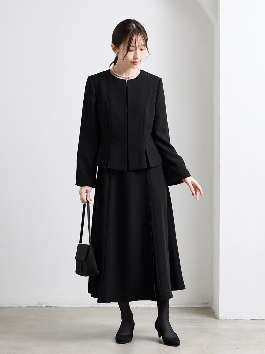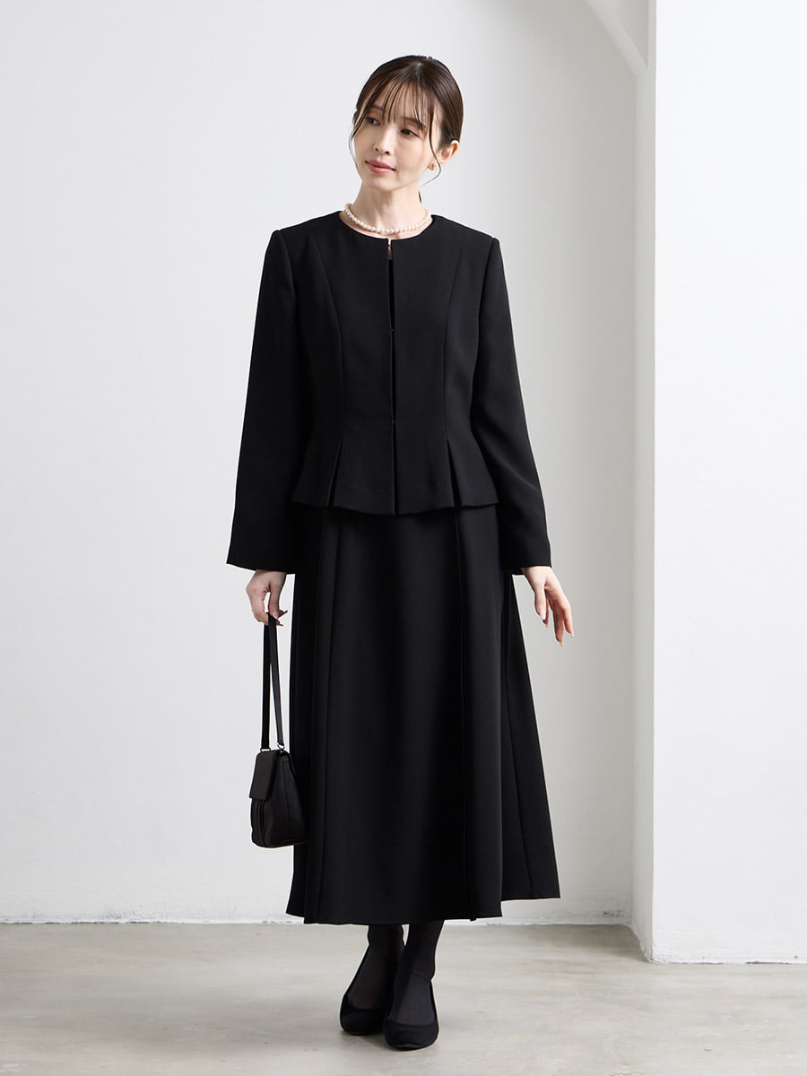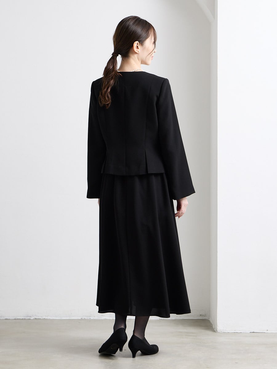 【喪服・礼服】Vネック前開きAラインブラックワンピース×ノーカラーボックスタックジャケット2点セット