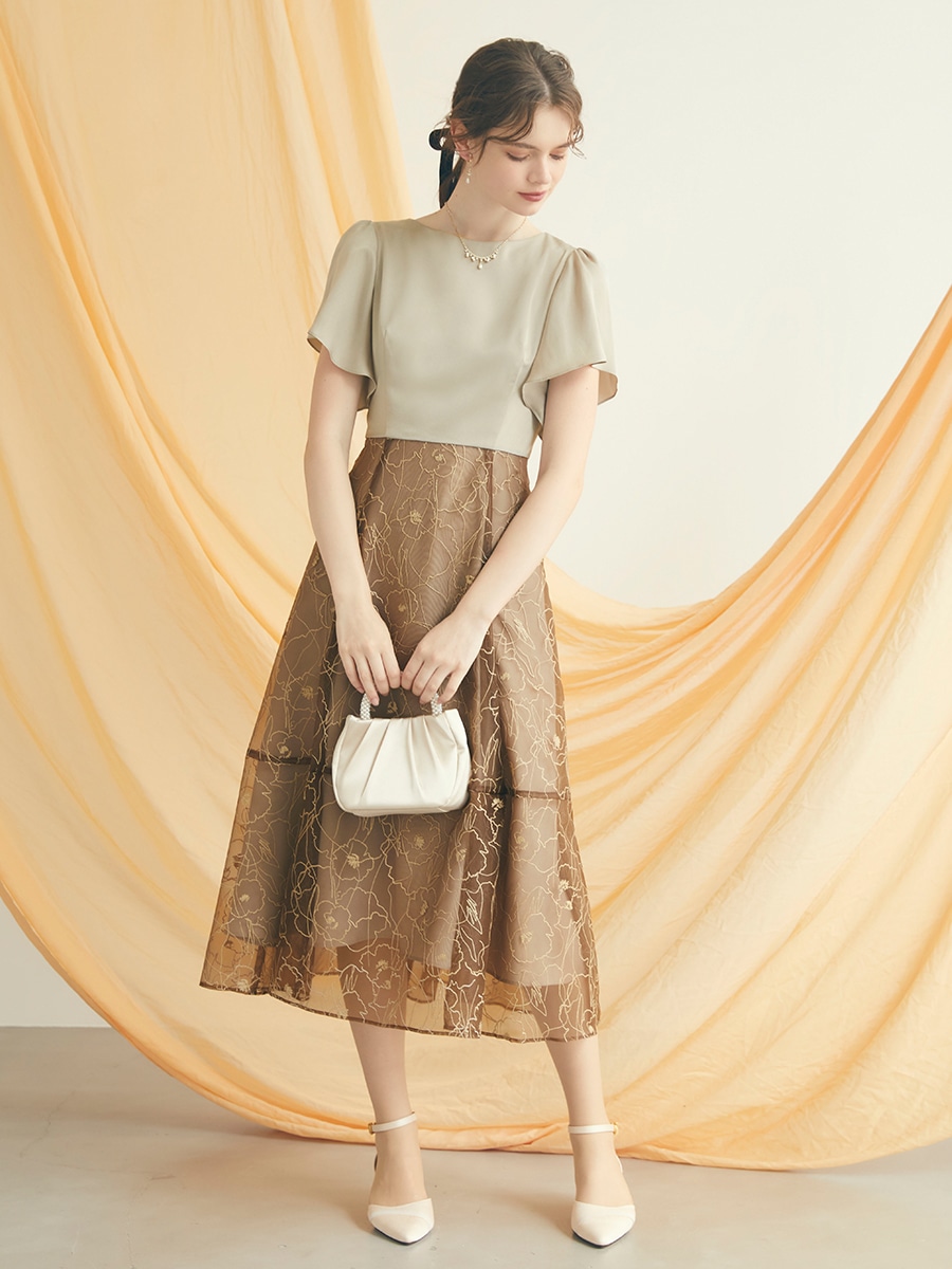 フラワー刺繍レイヤードハイウエストドレス