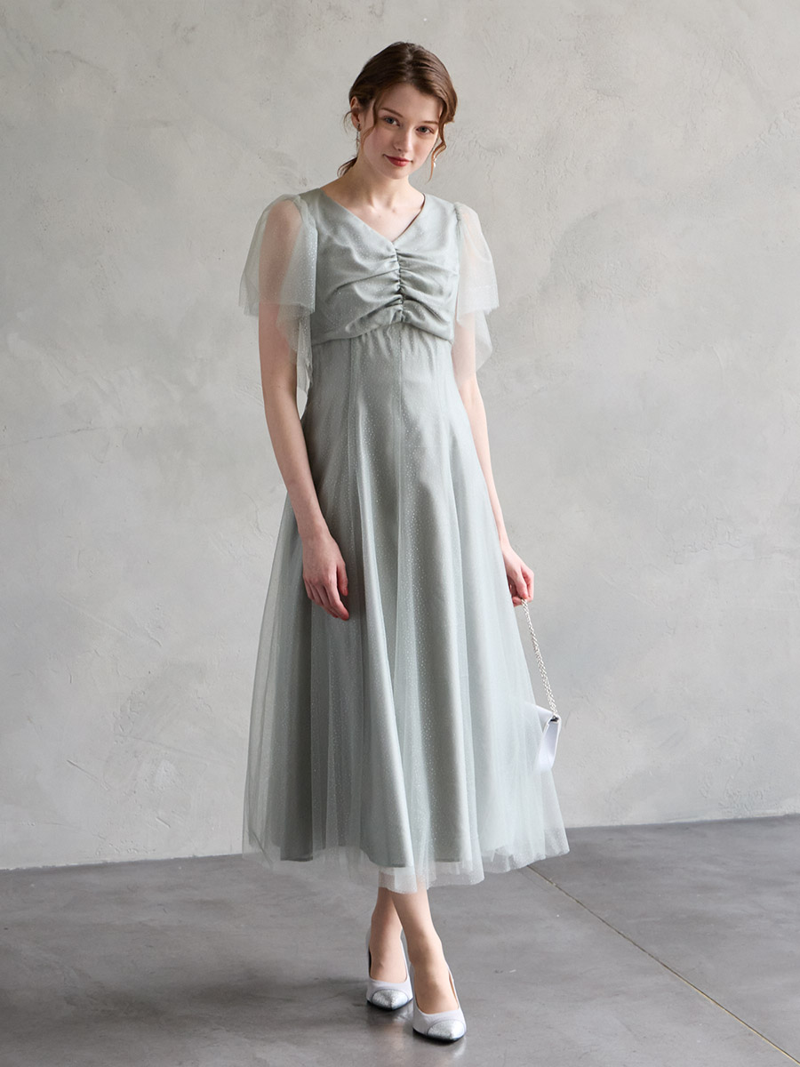 ベロアVネックラメフロッキーチュールギャザーフレアドレス