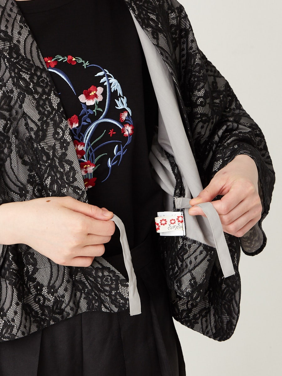 2.上着を羽織り、内側の紐と、左見頃に付いている紐を結びます。