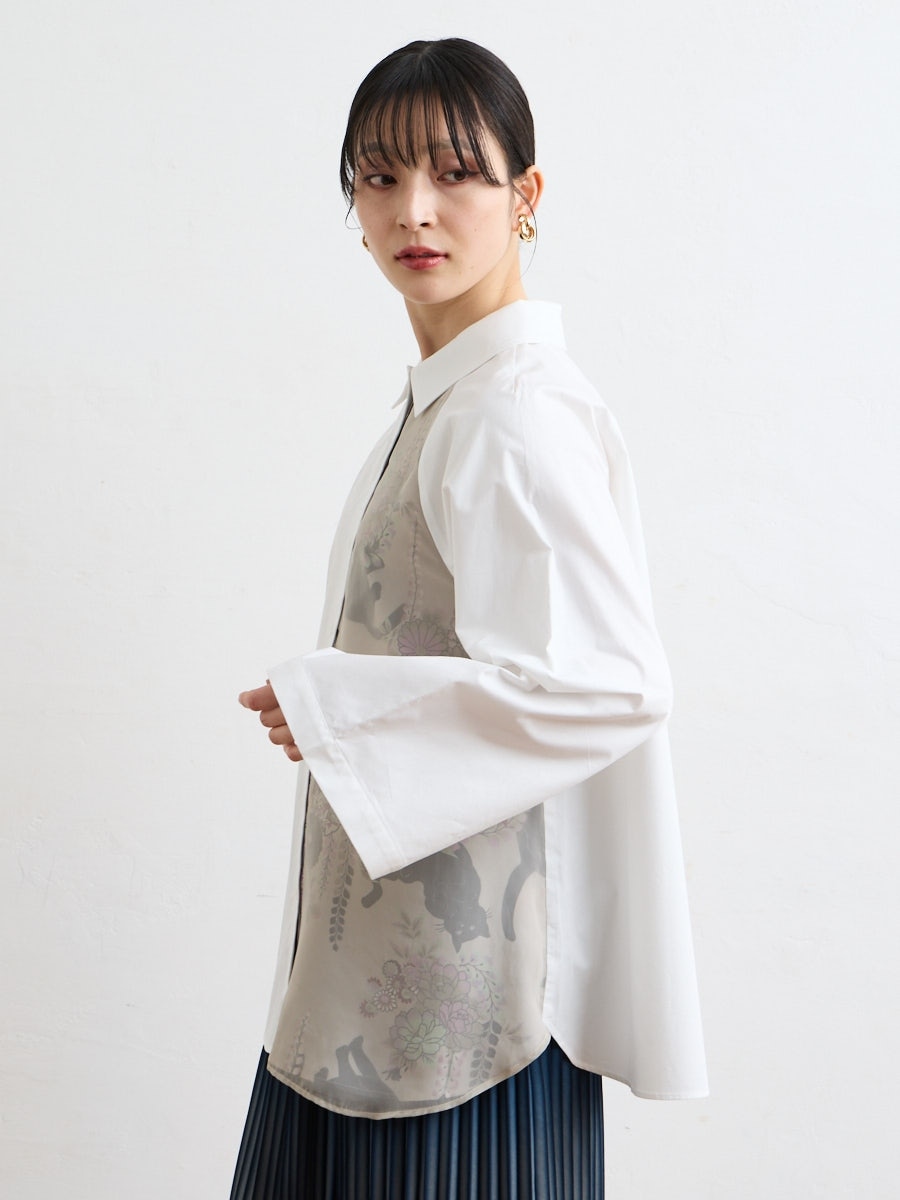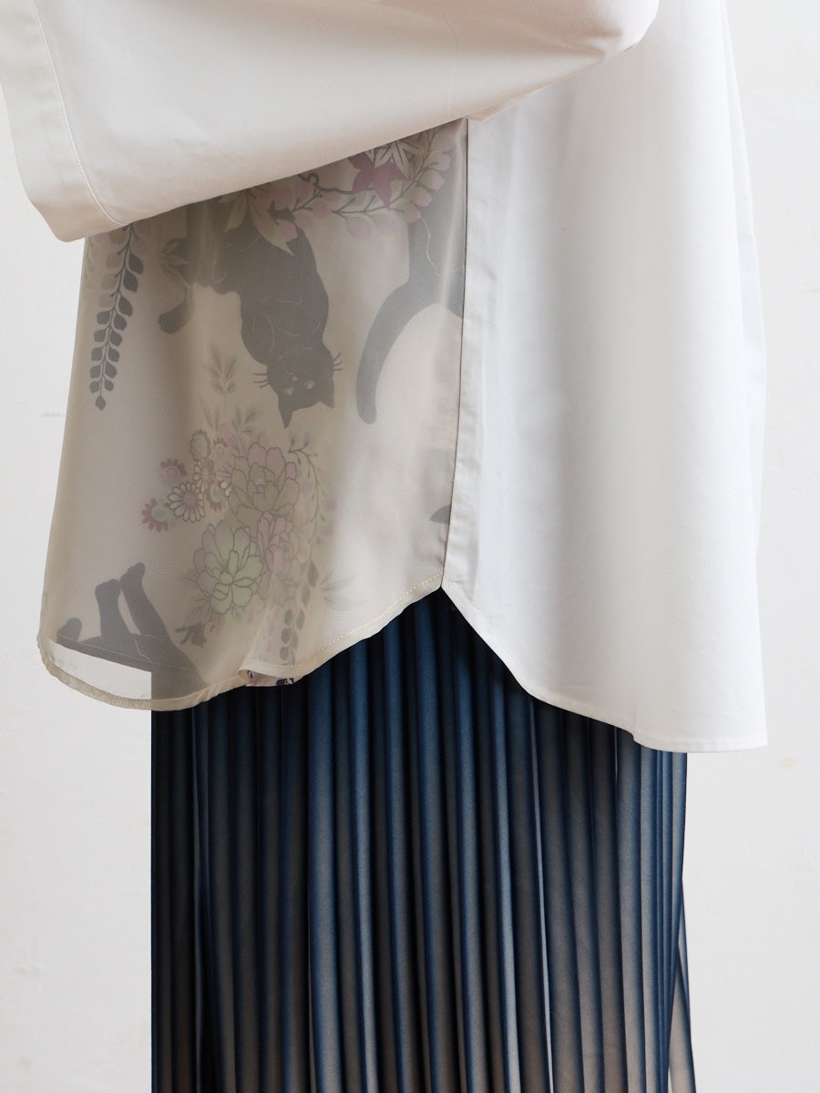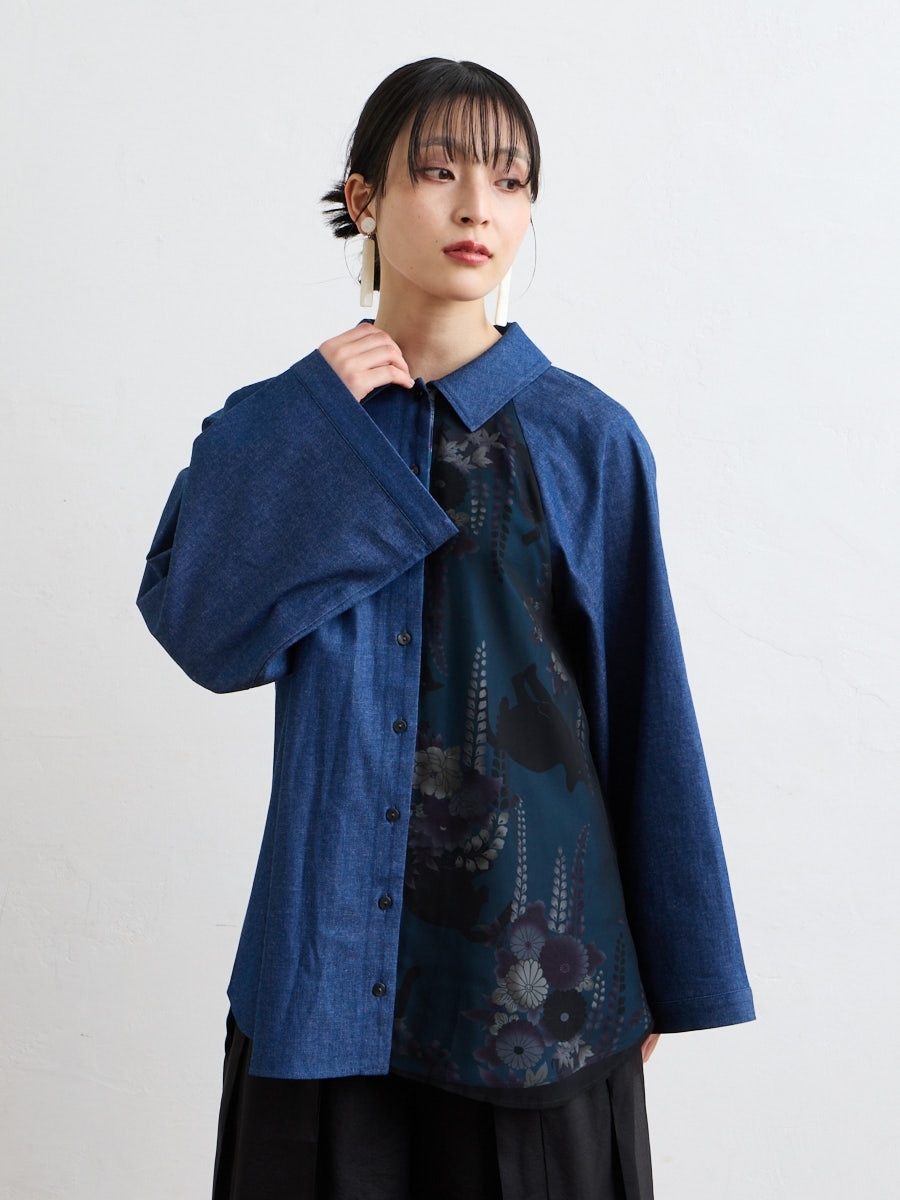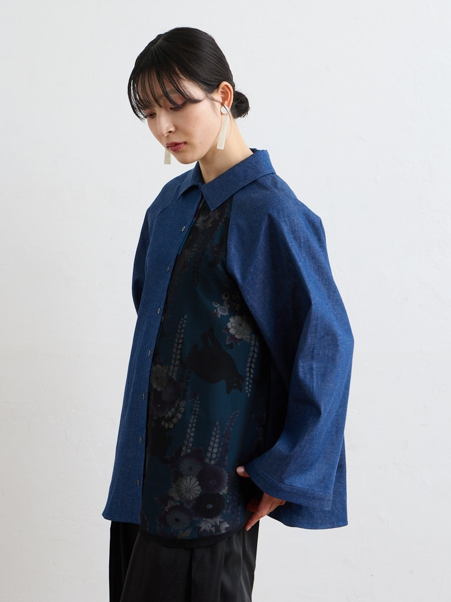 テキスタイル「夜空猫」の新色を使用した、シャツブラウスです。