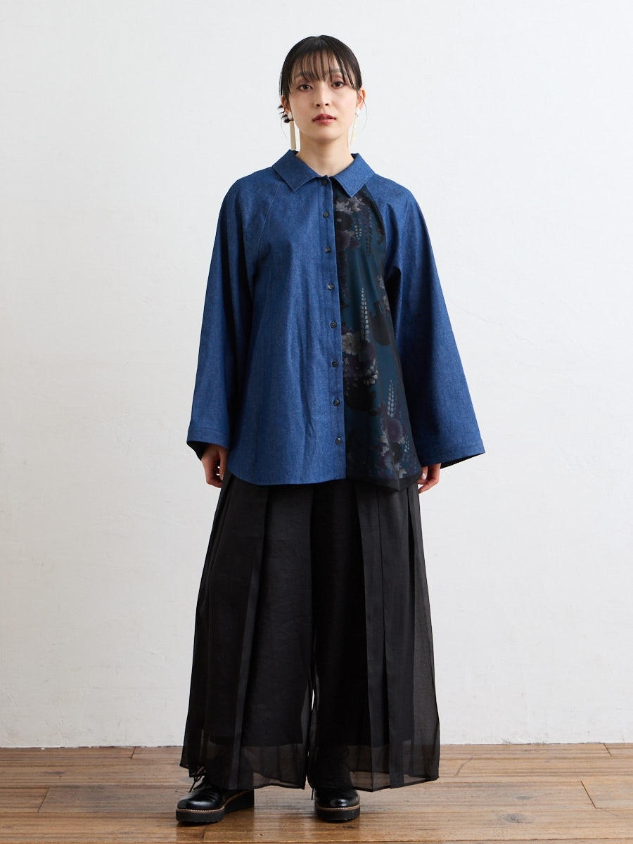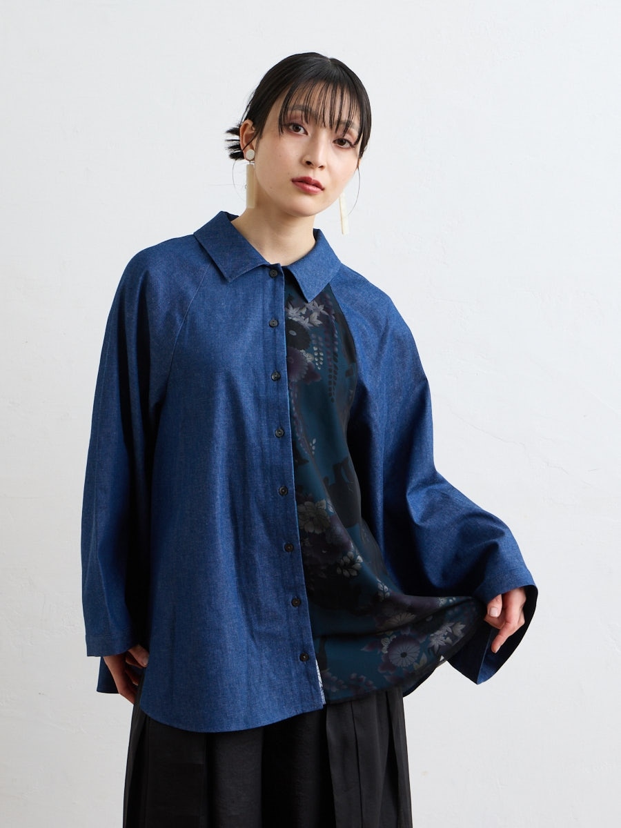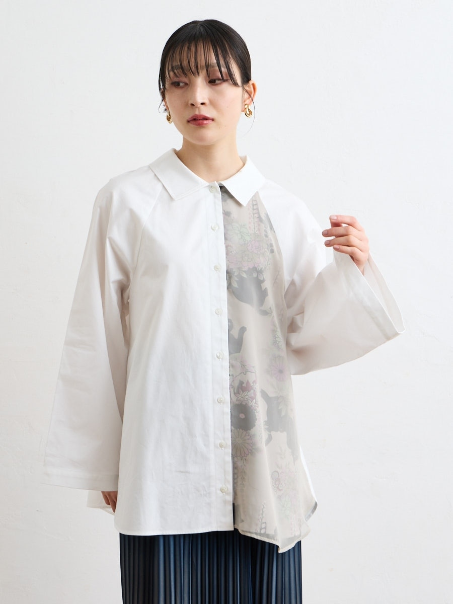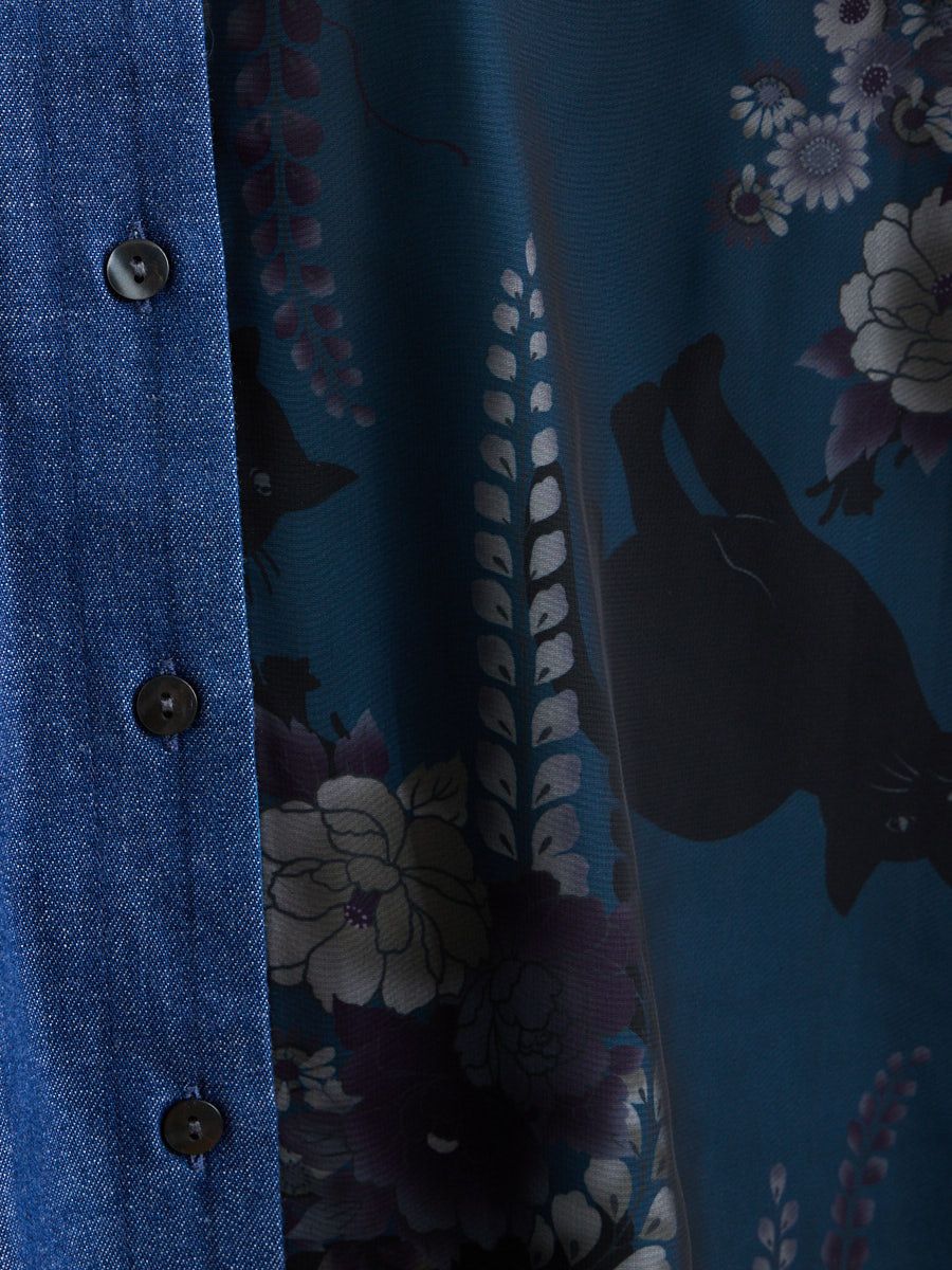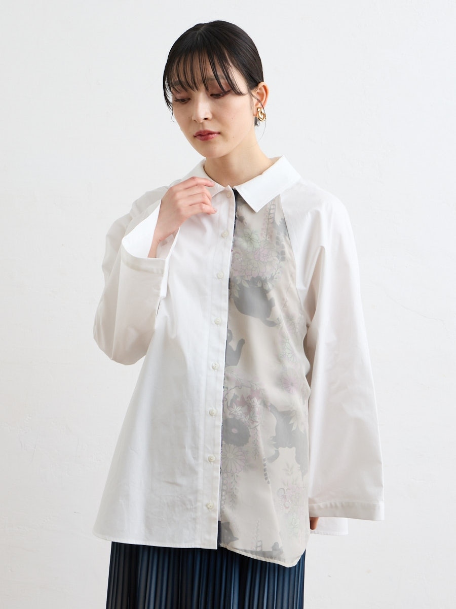 テキスタイル「夜空猫」の新色を使用した、シャツブラウスです。