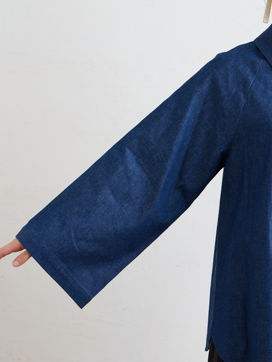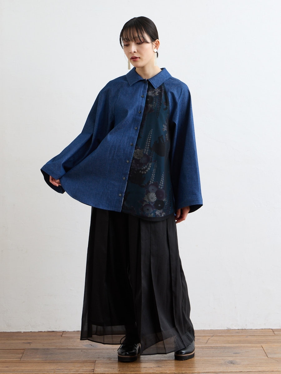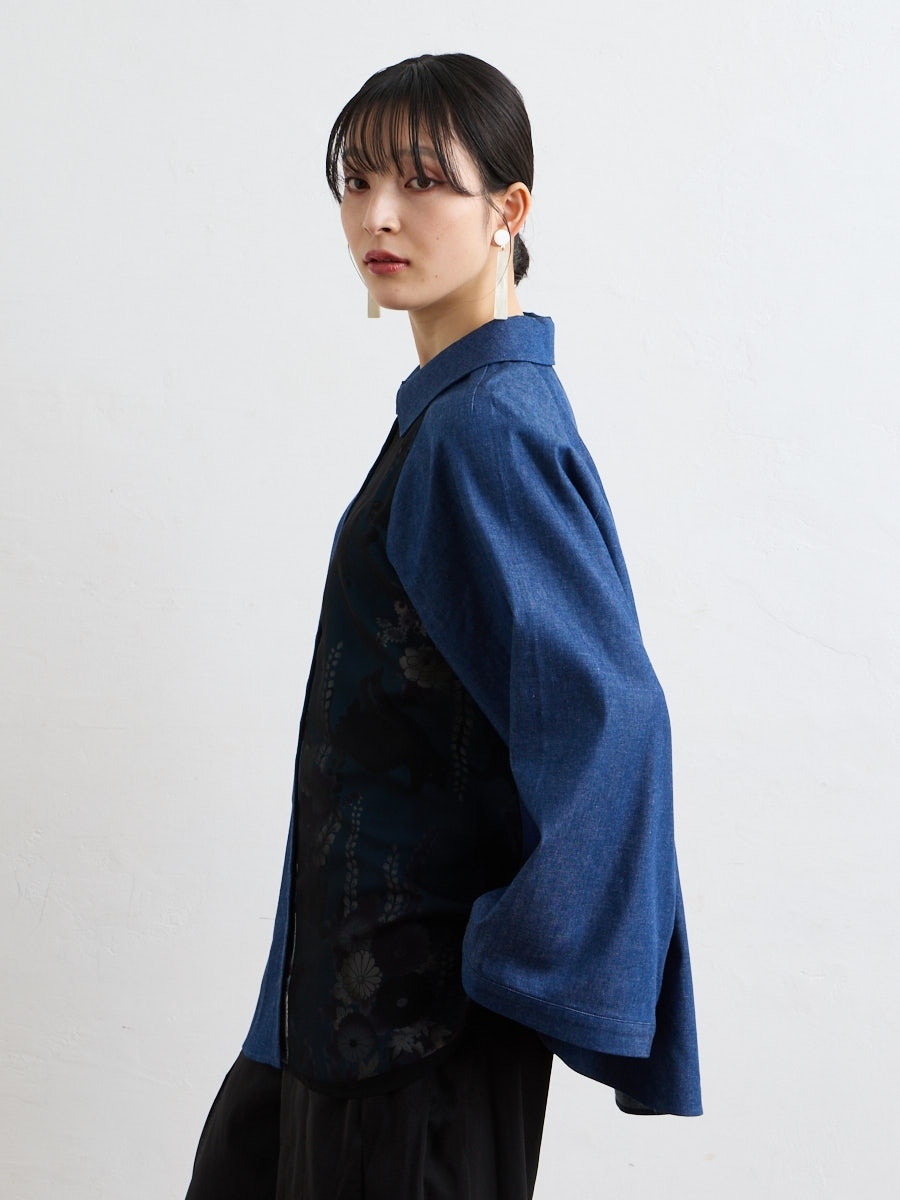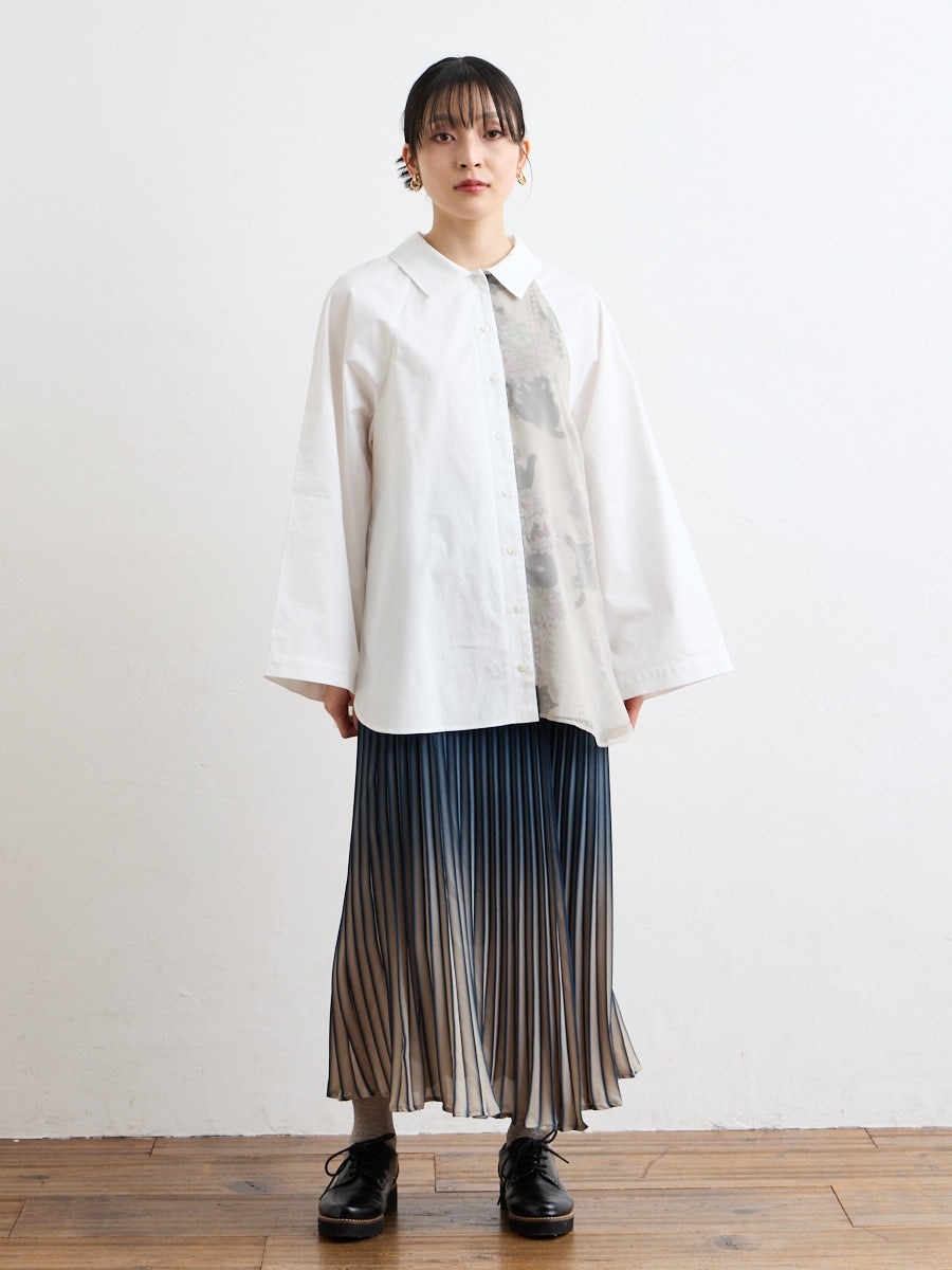 テキスタイル「夜空猫」の新色を使用した、シャツブラウスです。