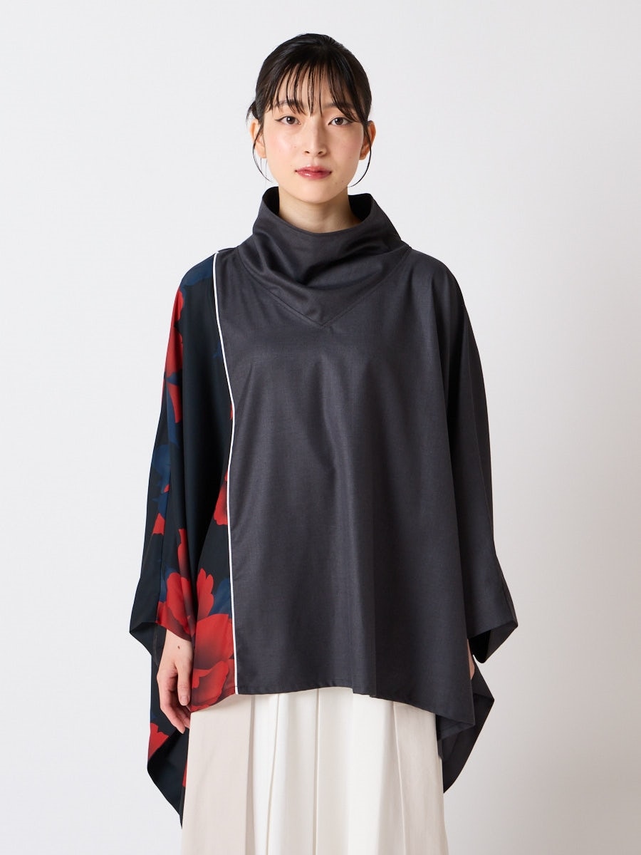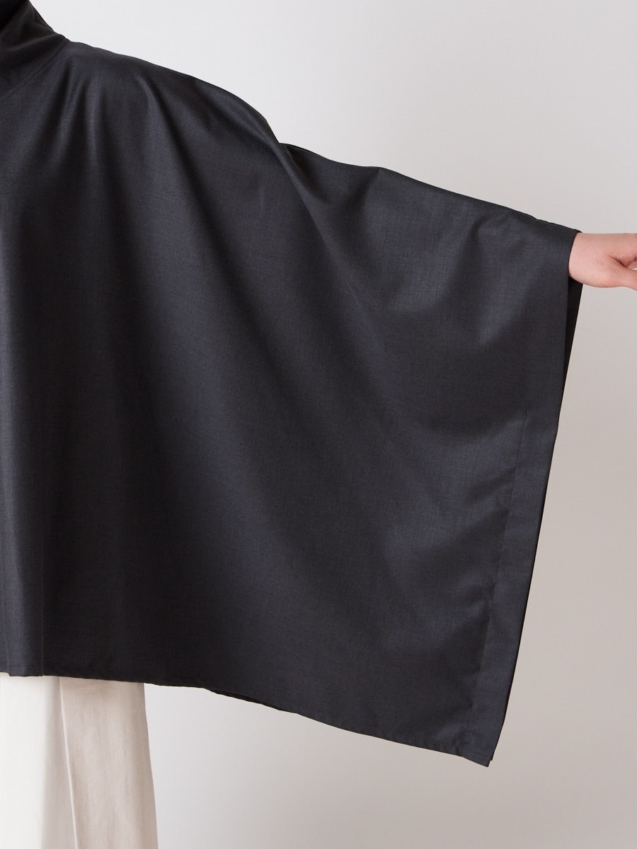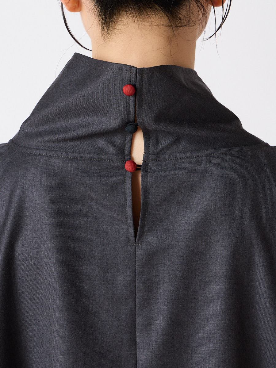 ゆったりとした衿元、たっぷりと生地を使用した体のラインを拾わないデザイン。
