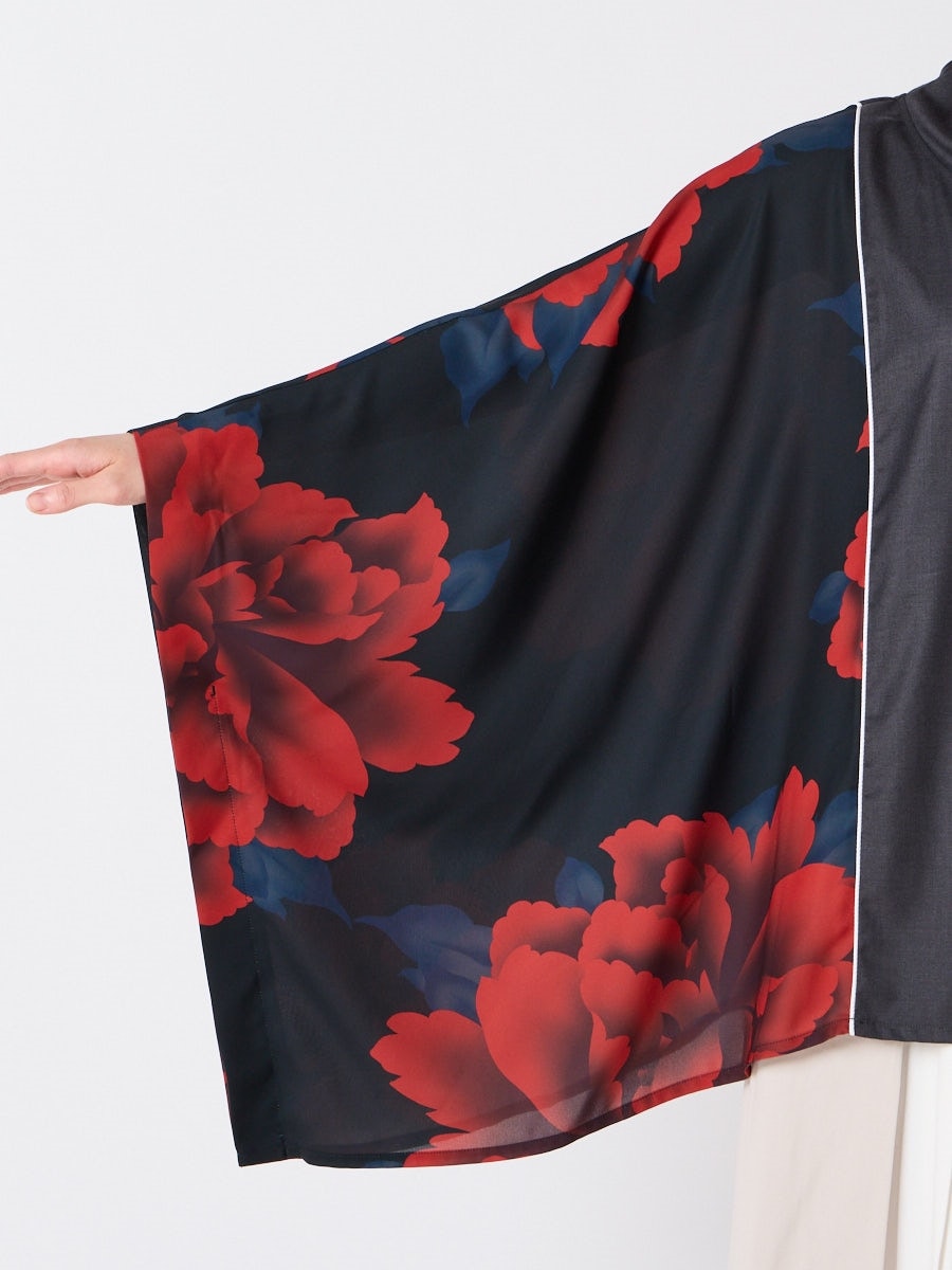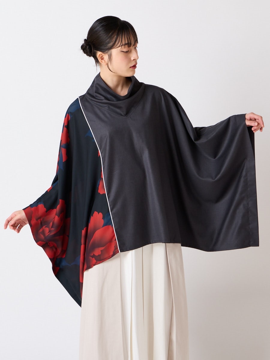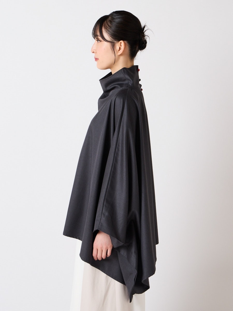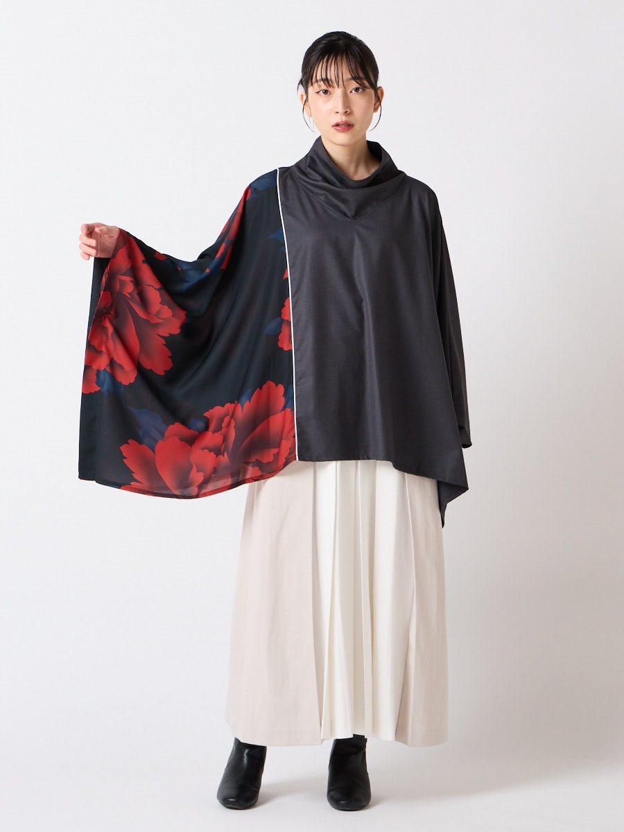 ゆったりとした衿元、たっぷりと生地を使用した体のラインを拾わないデザイン。