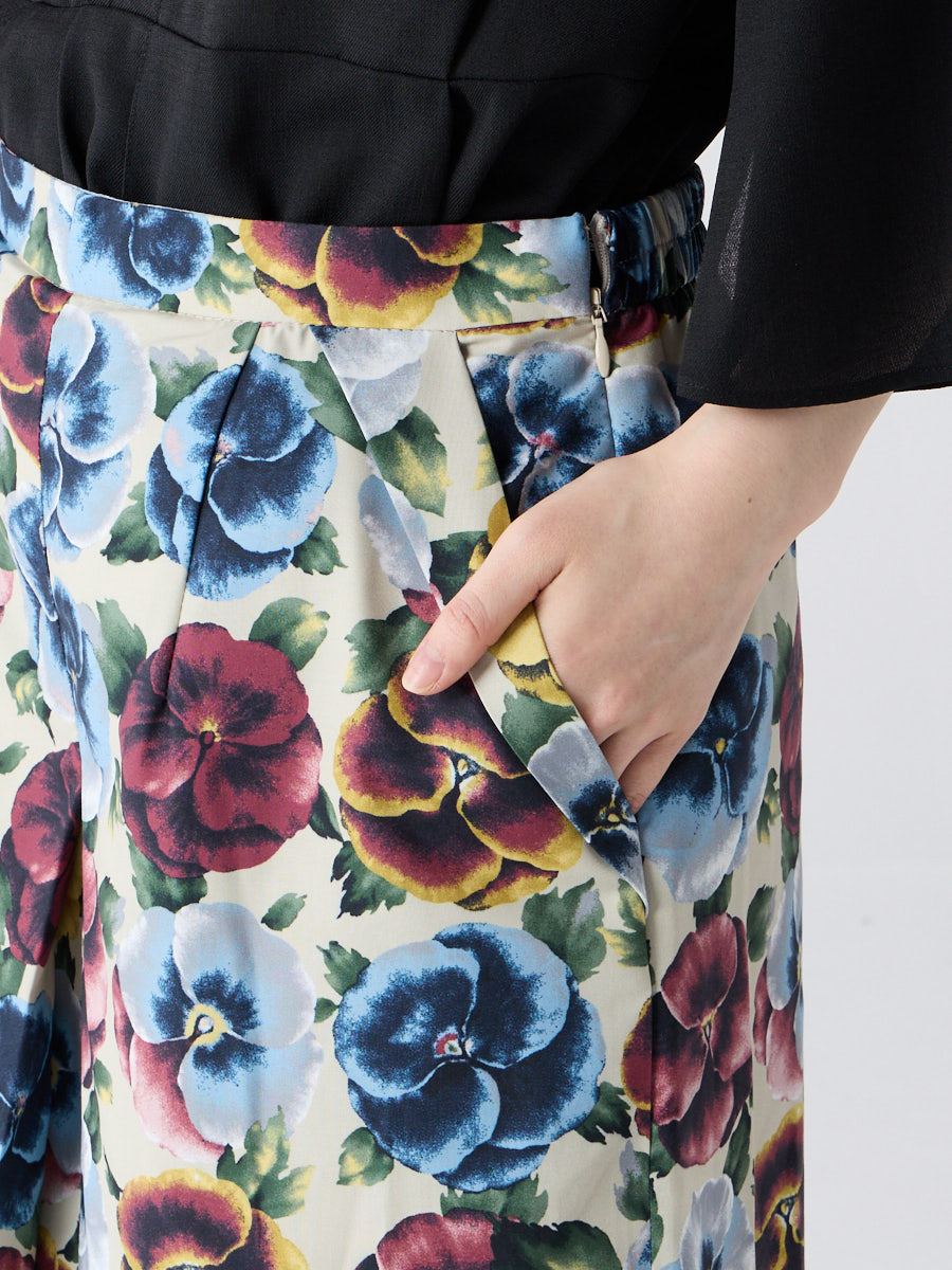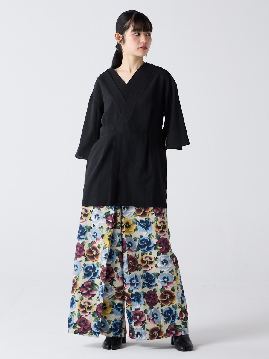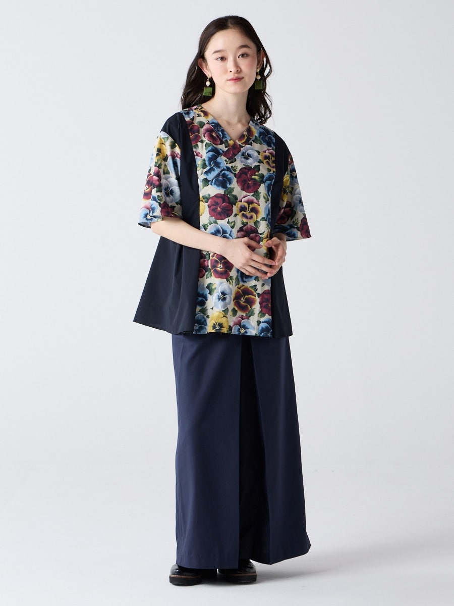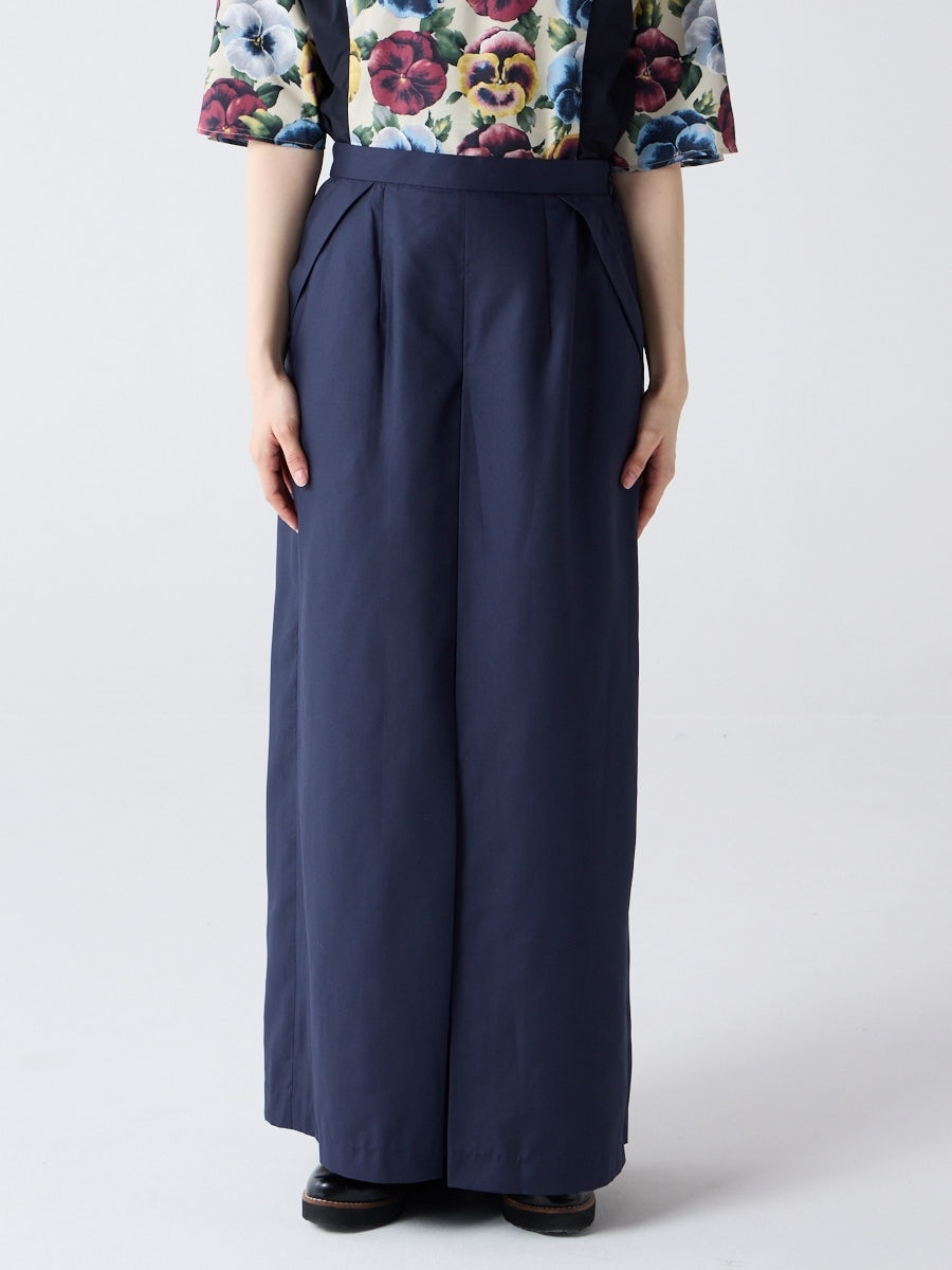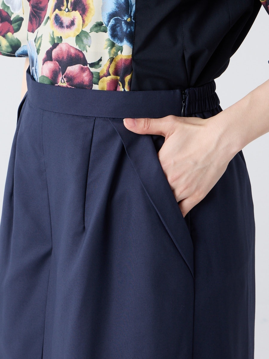 フロントの大胆なタックやポケットディテールに和装のエッセンスを忍ばせ、一見シンプルなシルエットながらも洗練されたモード感を演出。ふりふの人気テキスタイル「パンジー」を大胆に敷き詰めた総柄タイプと、どんなトップスにも合わせやすいネイビー単色の2配色をご用意しました。