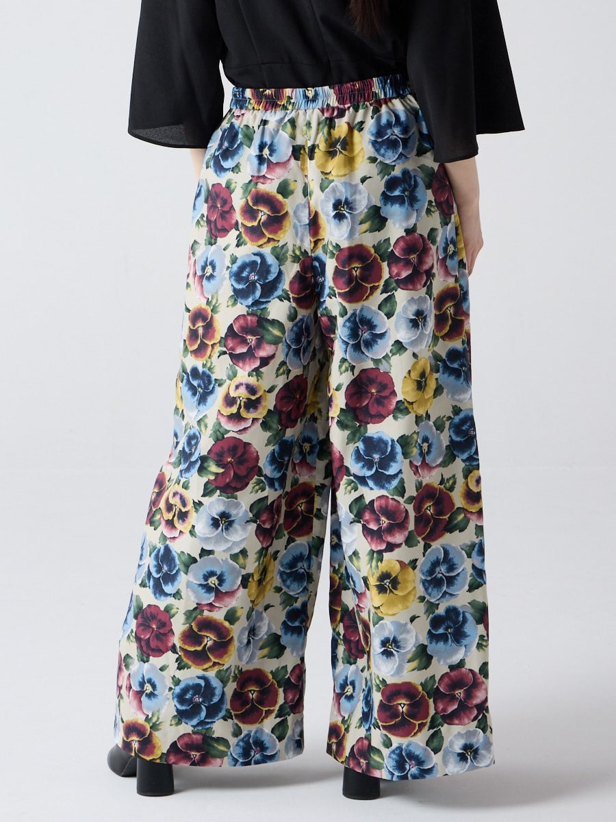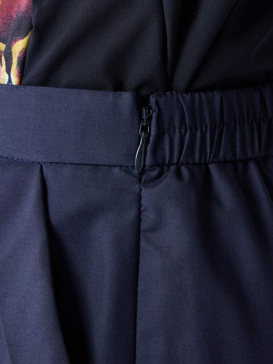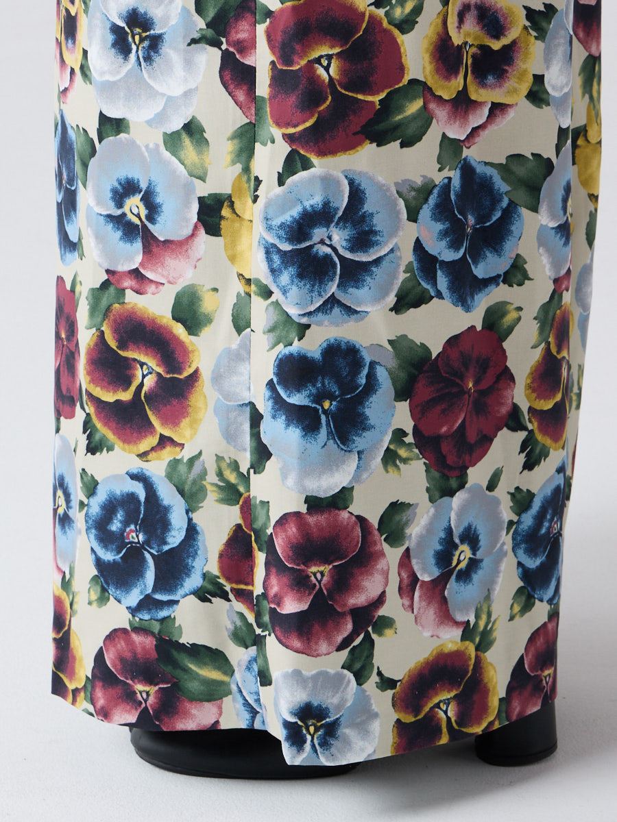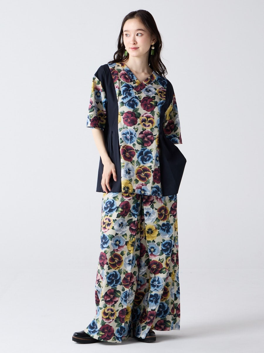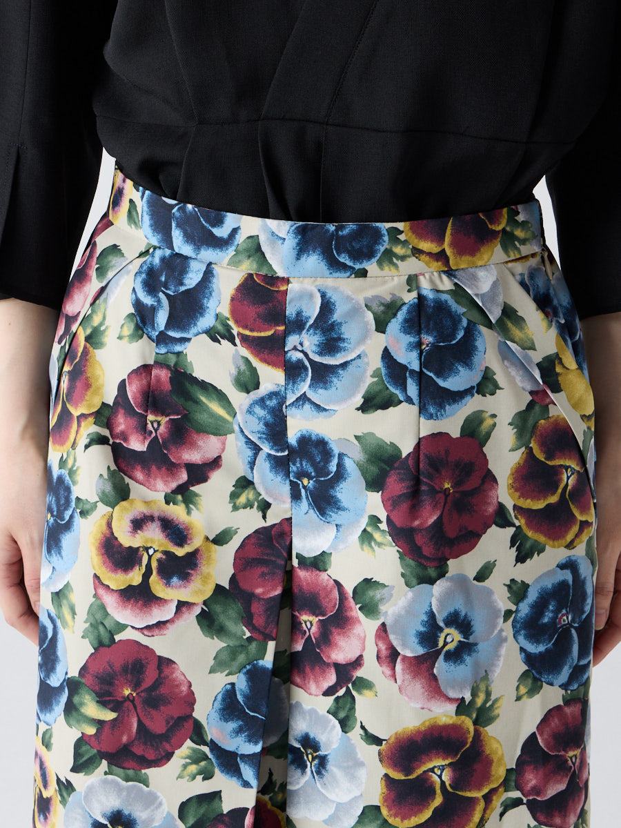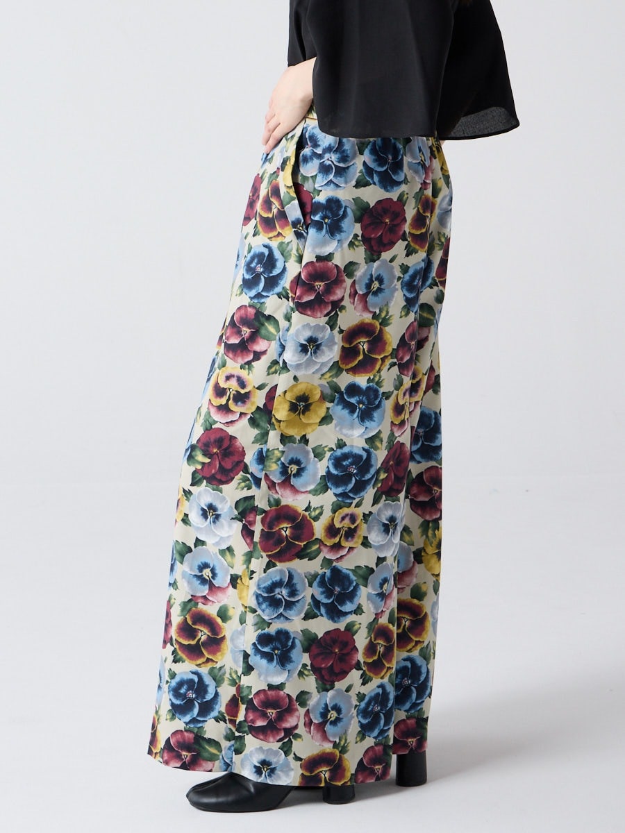 フロントの大胆なタックやポケットディテールに和装のエッセンスを忍ばせ、一見シンプルなシルエットながらも洗練されたモード感を演出。ふりふの人気テキスタイル「パンジー」を大胆に敷き詰めた総柄タイプと、どんなトップスにも合わせやすいネイビー単色の2配色をご用意しました。