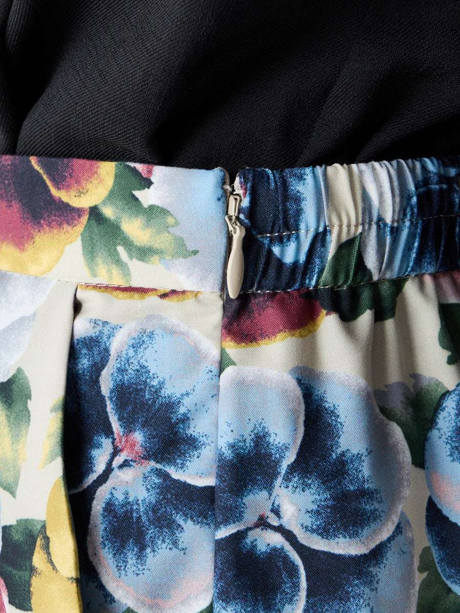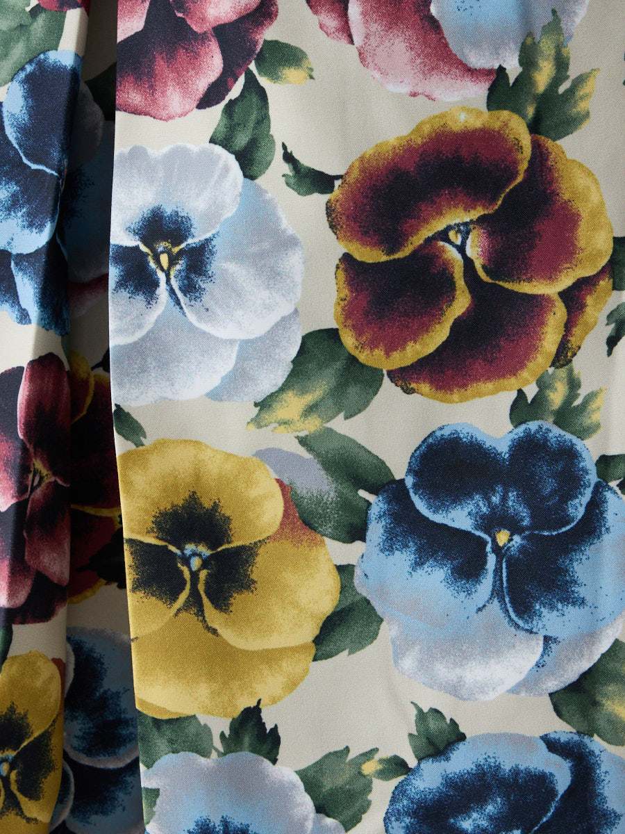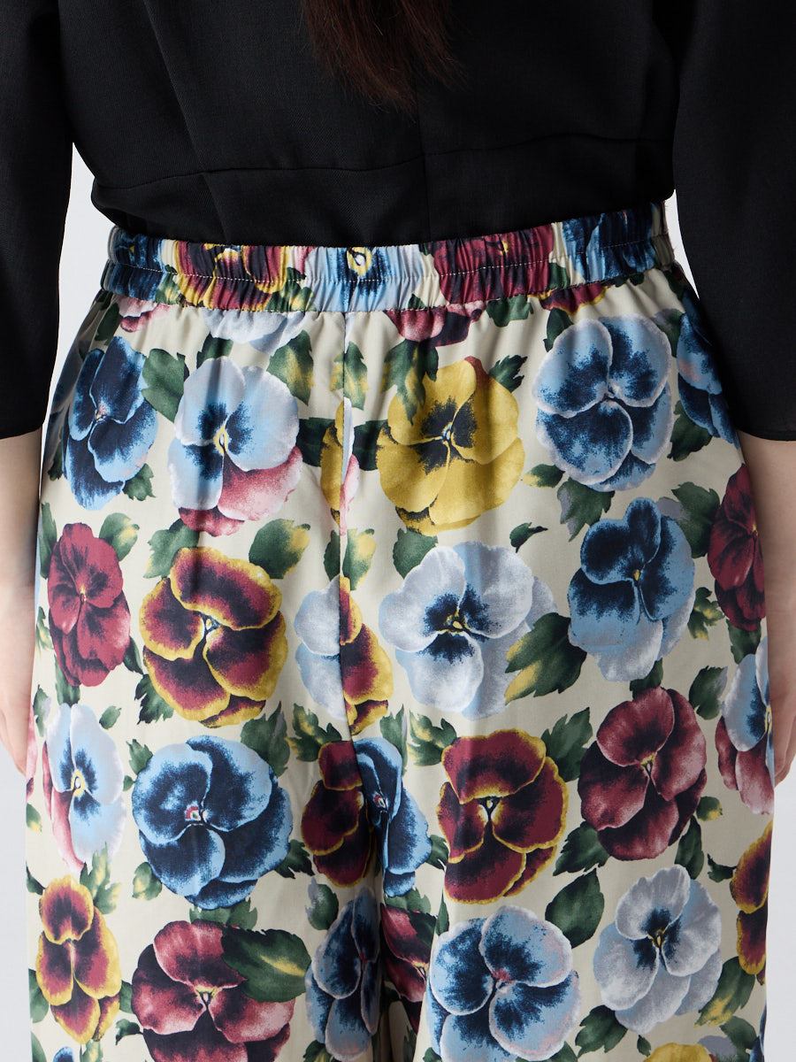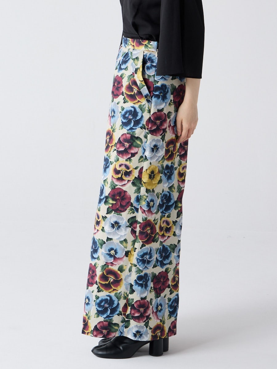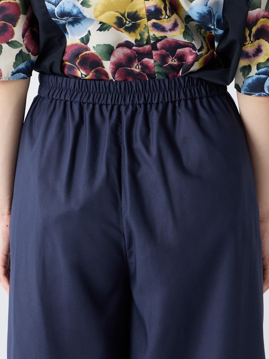 フロントの大胆なタックやポケットディテールに和装のエッセンスを忍ばせ、一見シンプルなシルエットながらも洗練されたモード感を演出。ふりふの人気テキスタイル「パンジー」を大胆に敷き詰めた総柄タイプと、どんなトップスにも合わせやすいネイビー単色の2配色をご用意しました。