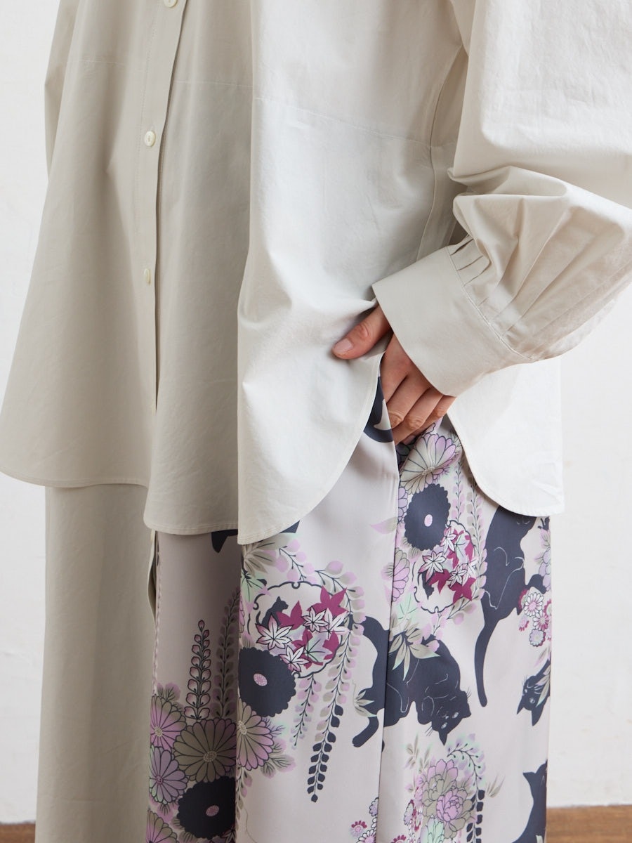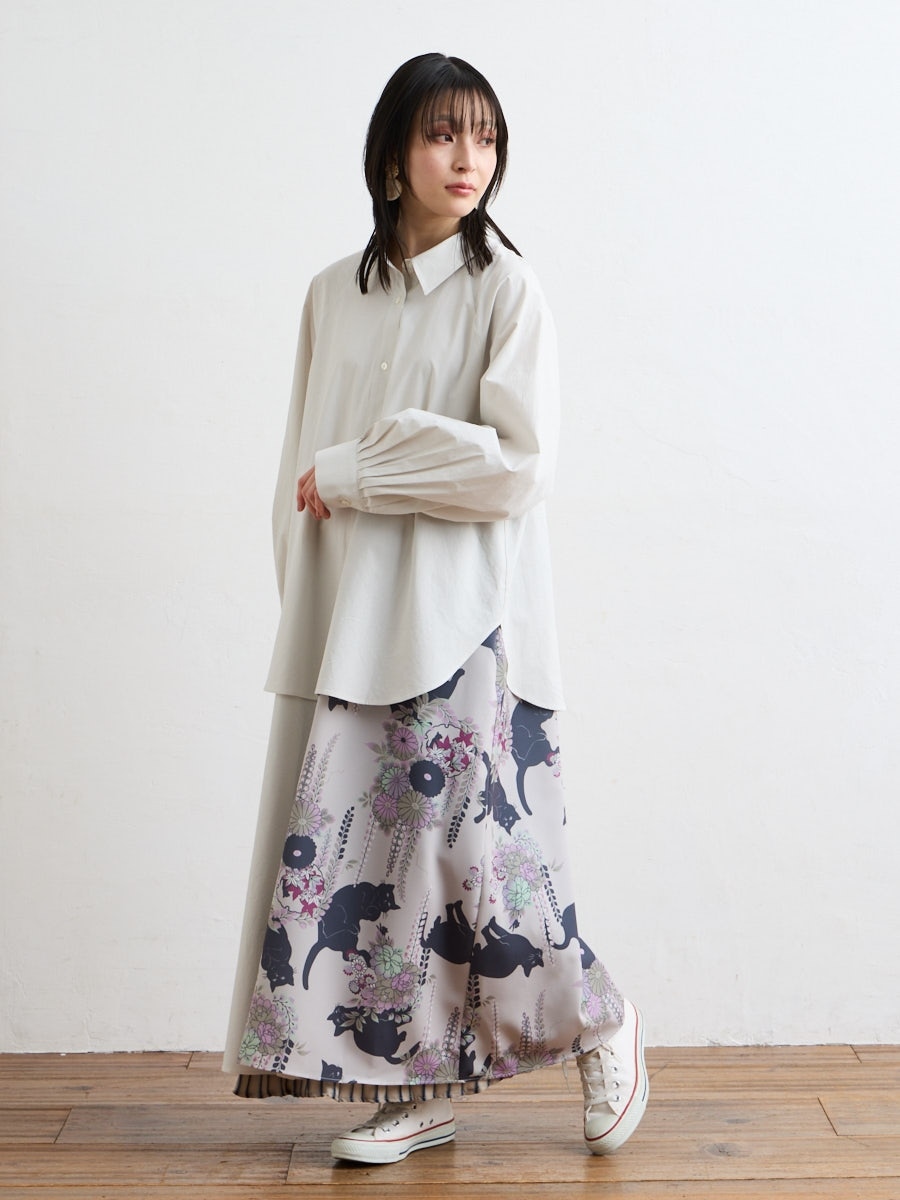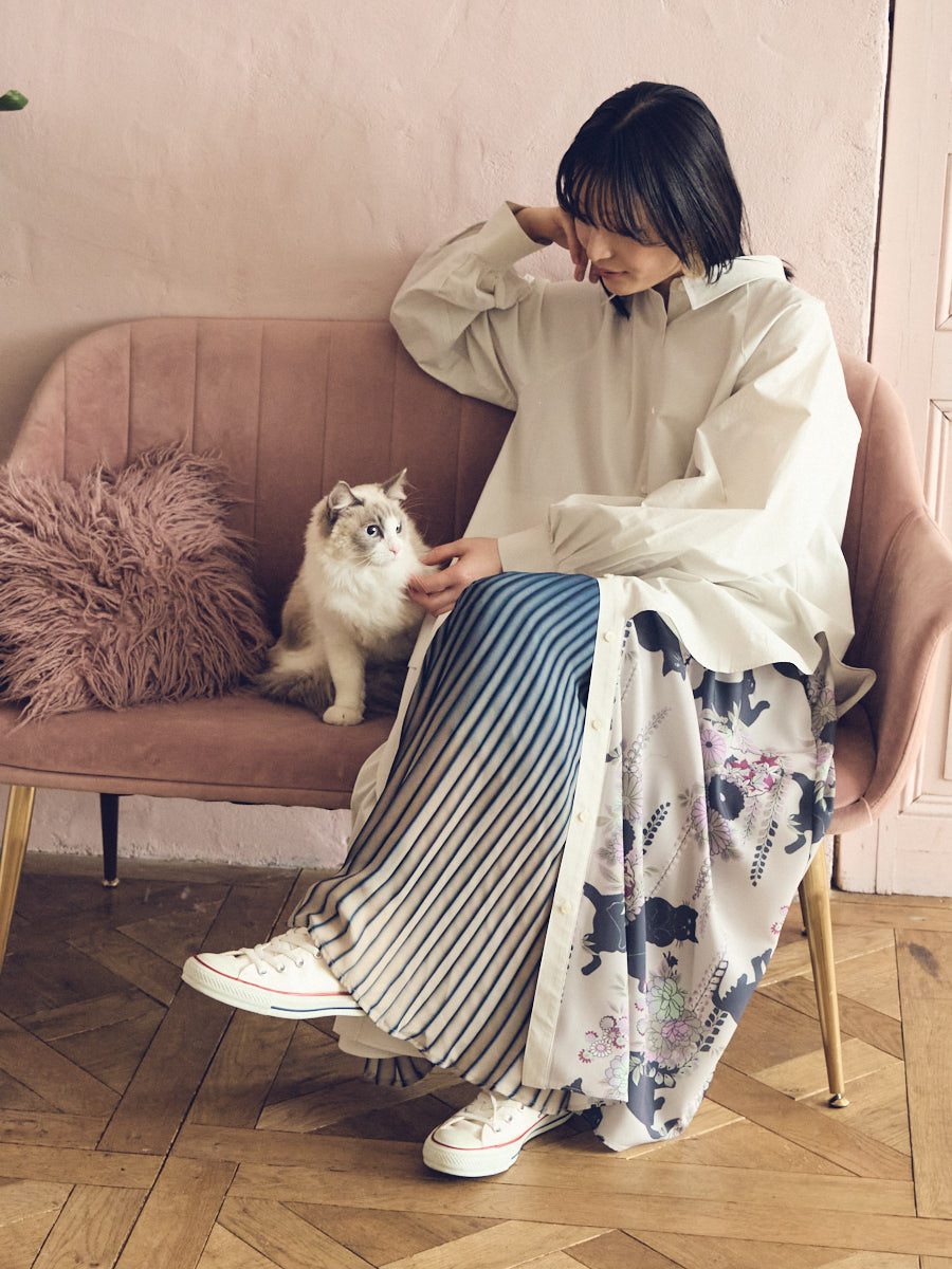 ふりふの大人気テキスタイル「夜空猫」の新色を使用した、レイヤードデザインが印象的なシャツワンピースです。