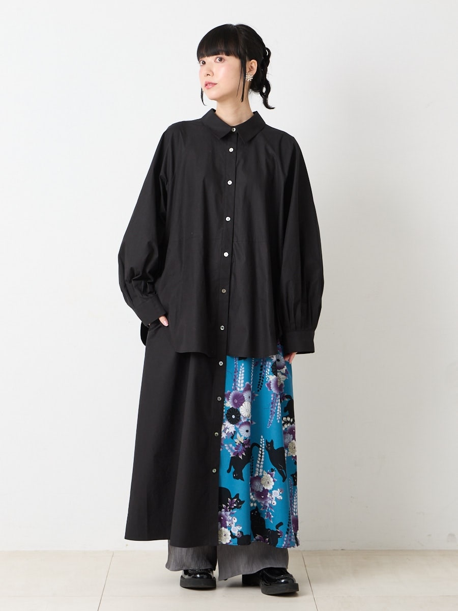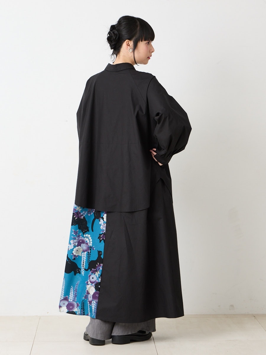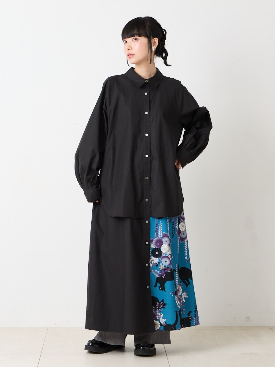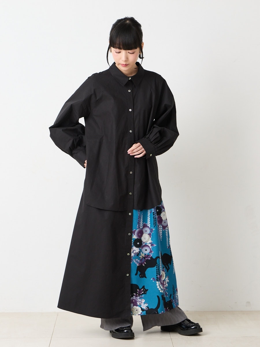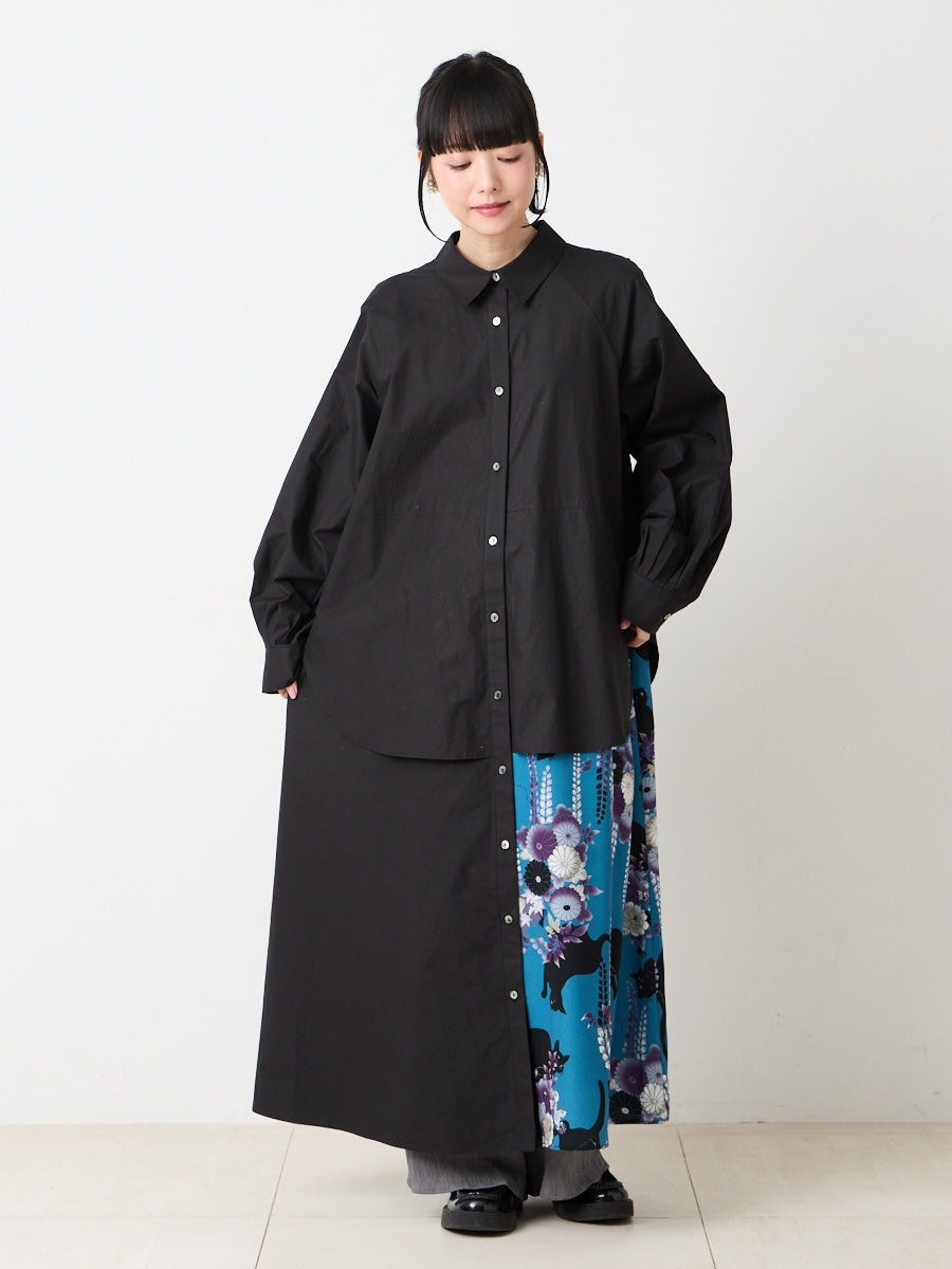 ふりふの大人気テキスタイル「夜空猫」の新色を使用した、レイヤードデザインが印象的なシャツワンピースです。