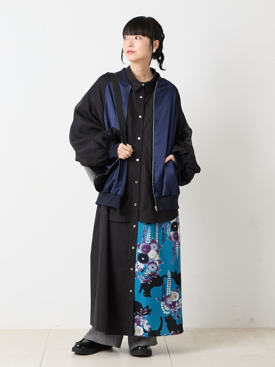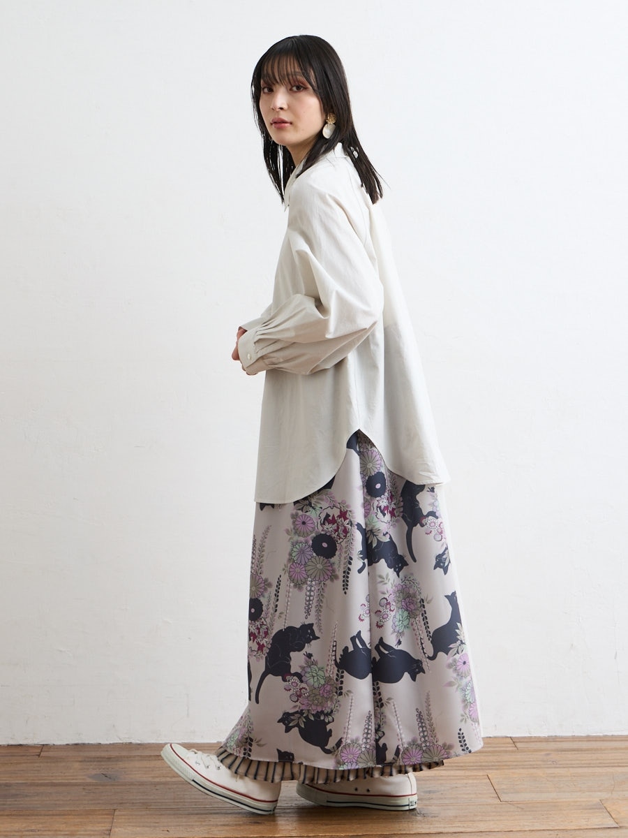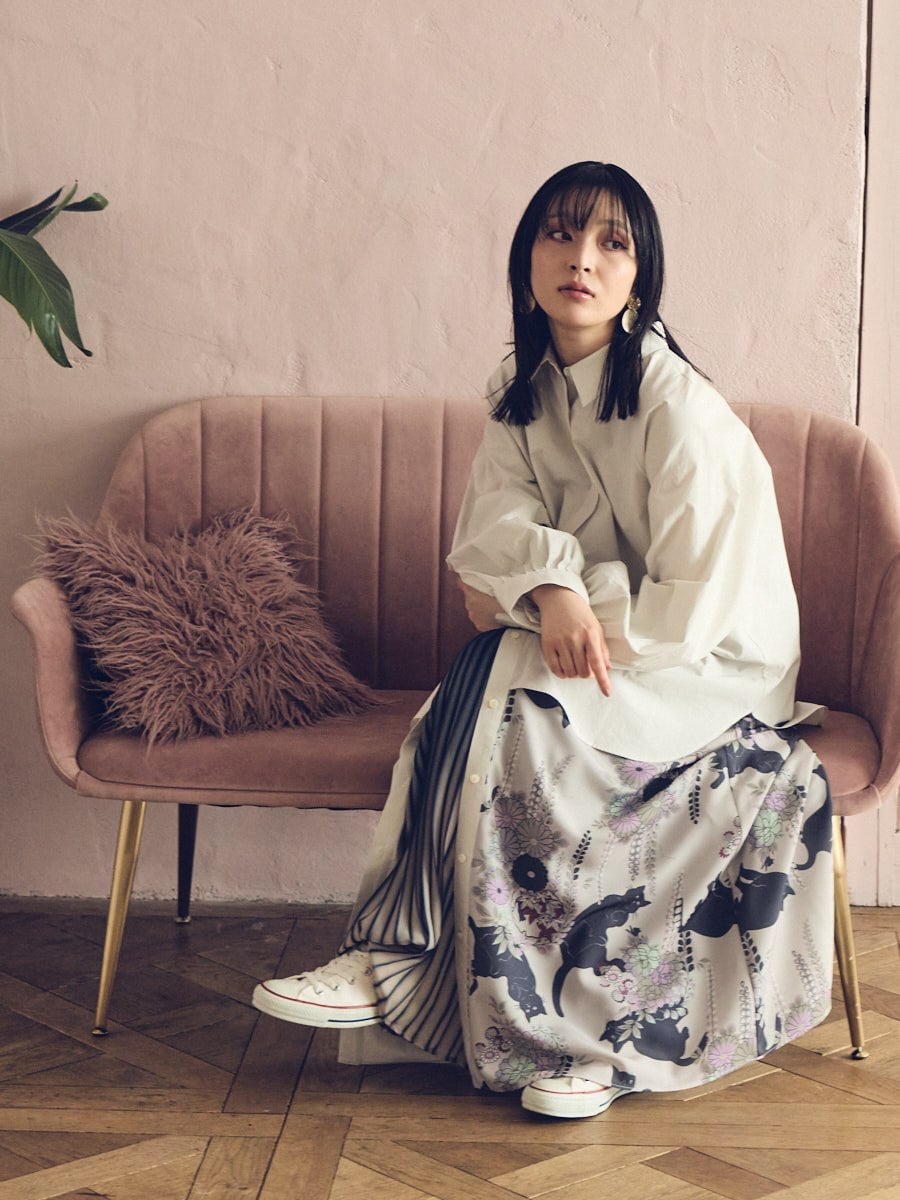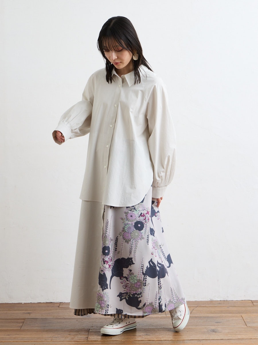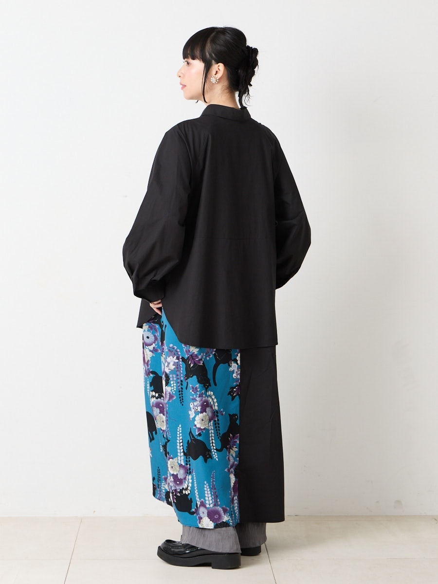 ふりふの大人気テキスタイル「夜空猫」の新色を使用した、レイヤードデザインが印象的なシャツワンピースです。
