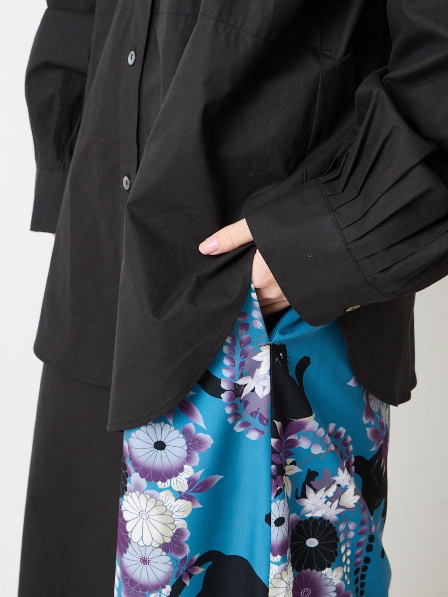 テキスタイルは片身に配置し、主張しすぎないデザインながら、さりげなくふりふらしさを感じられる一枚です。