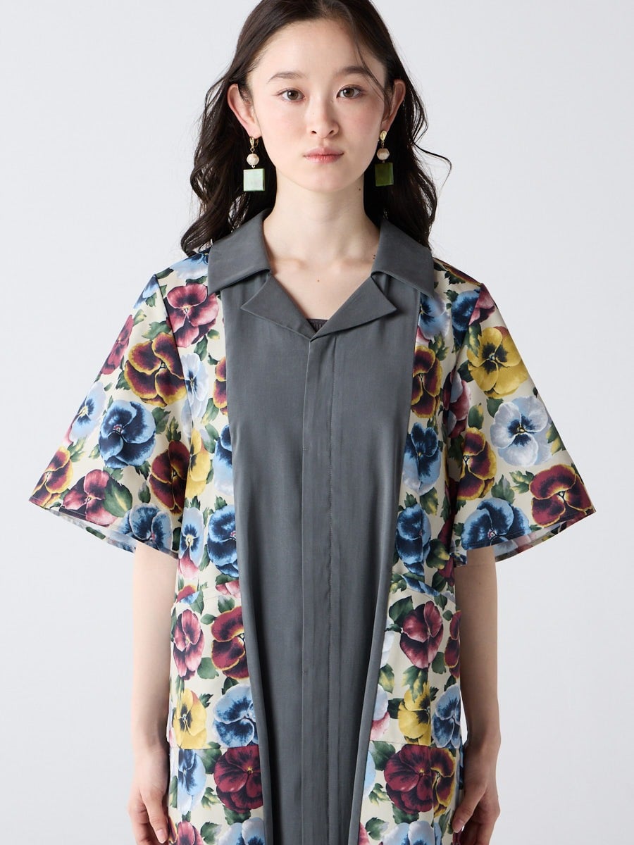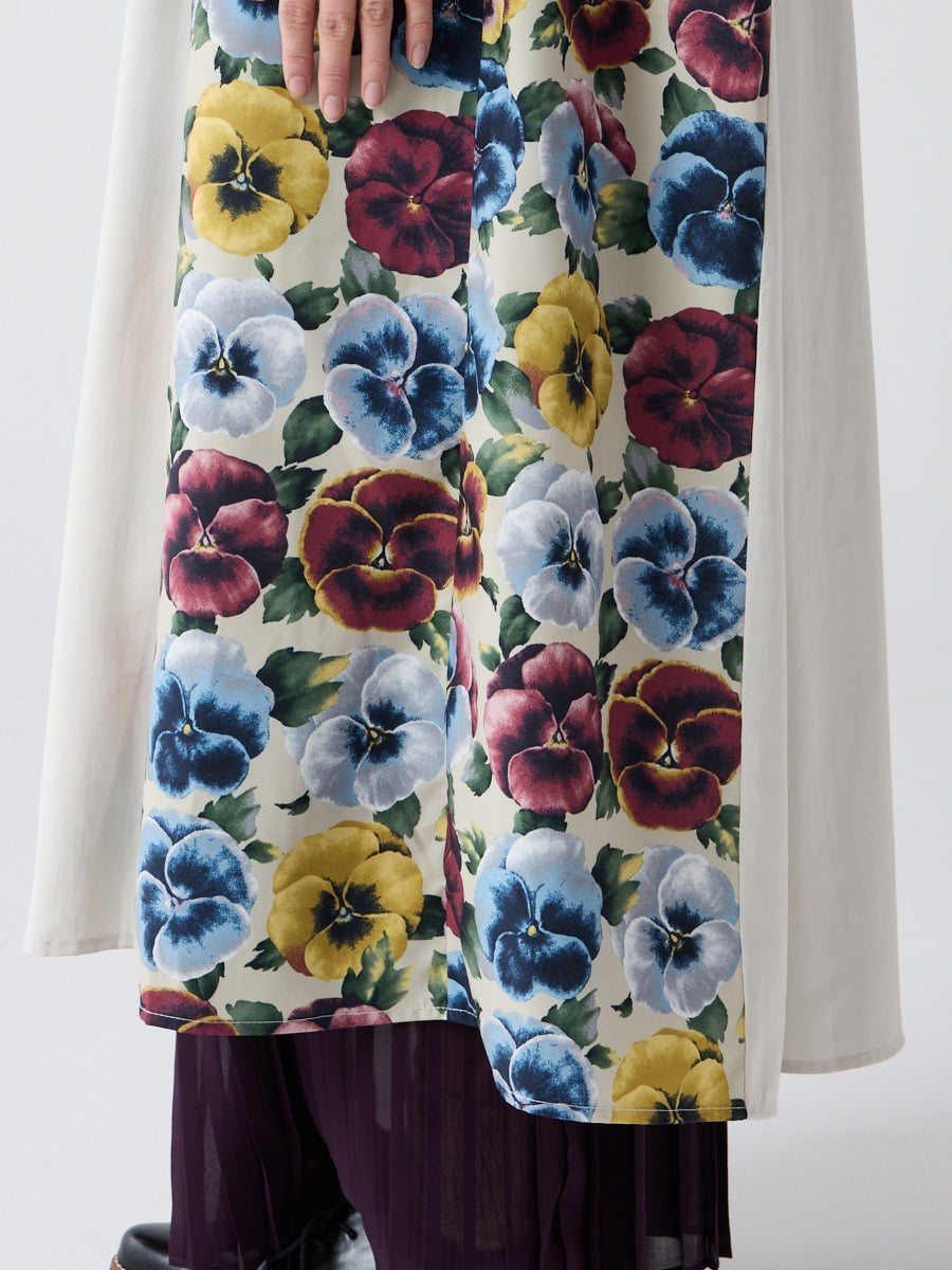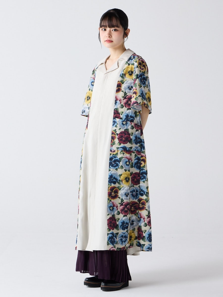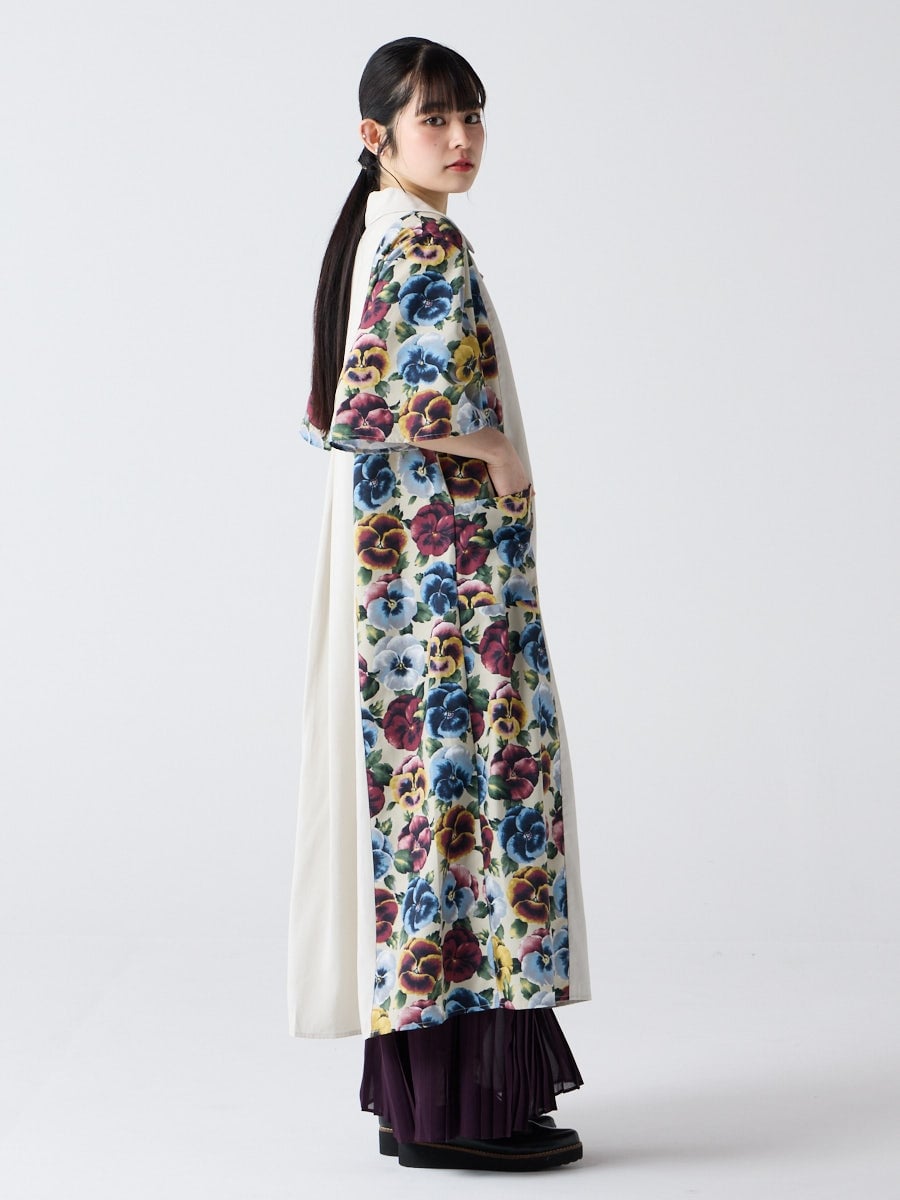 ふりふ人気テキスタイル「パンジー」を規則的に敷き詰めたシャツワンピース。台形シルエットは広がりすぎずシュッとしたラインで、開衿と回顧的ディテールがノスタルジックな趣を添えます。柄の存在感とシルエットの軽やかさが、モード感と遊び心を両立します。