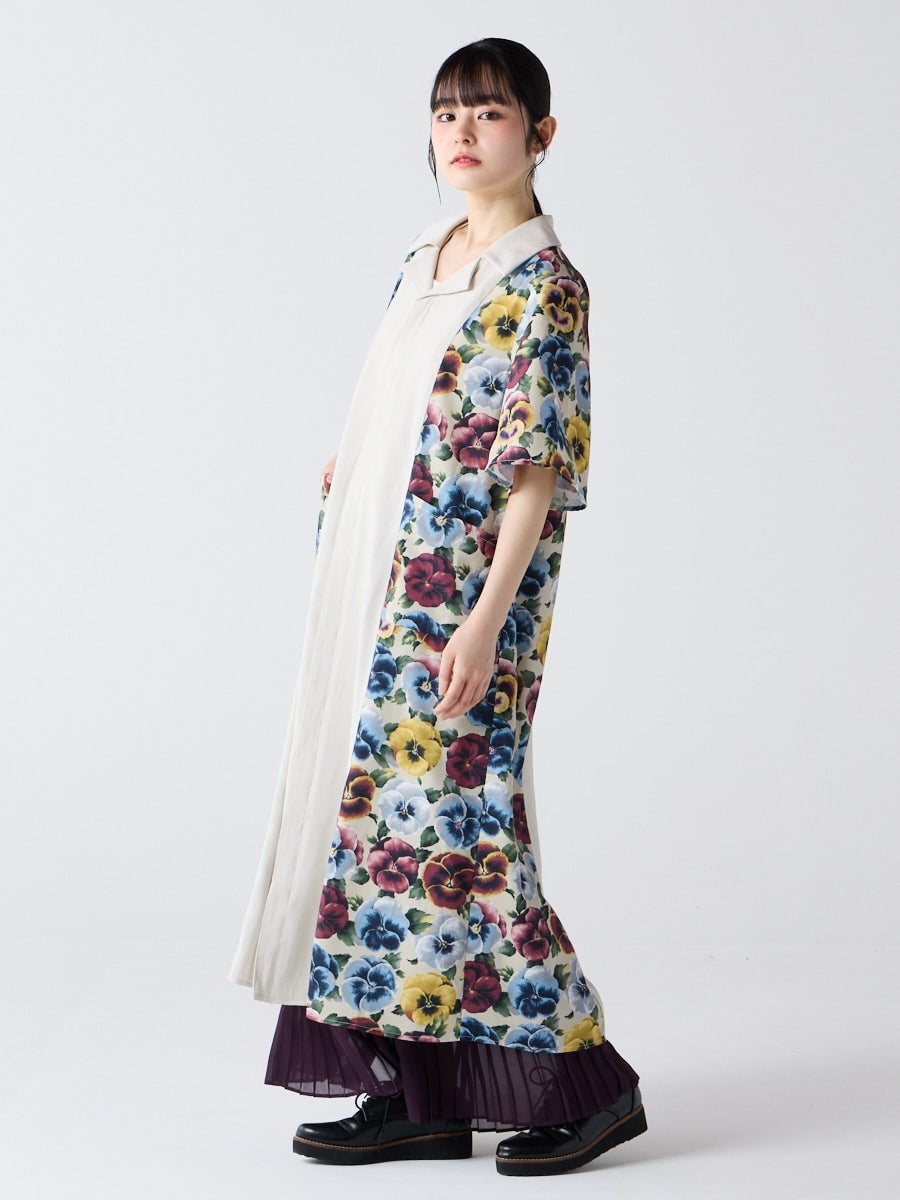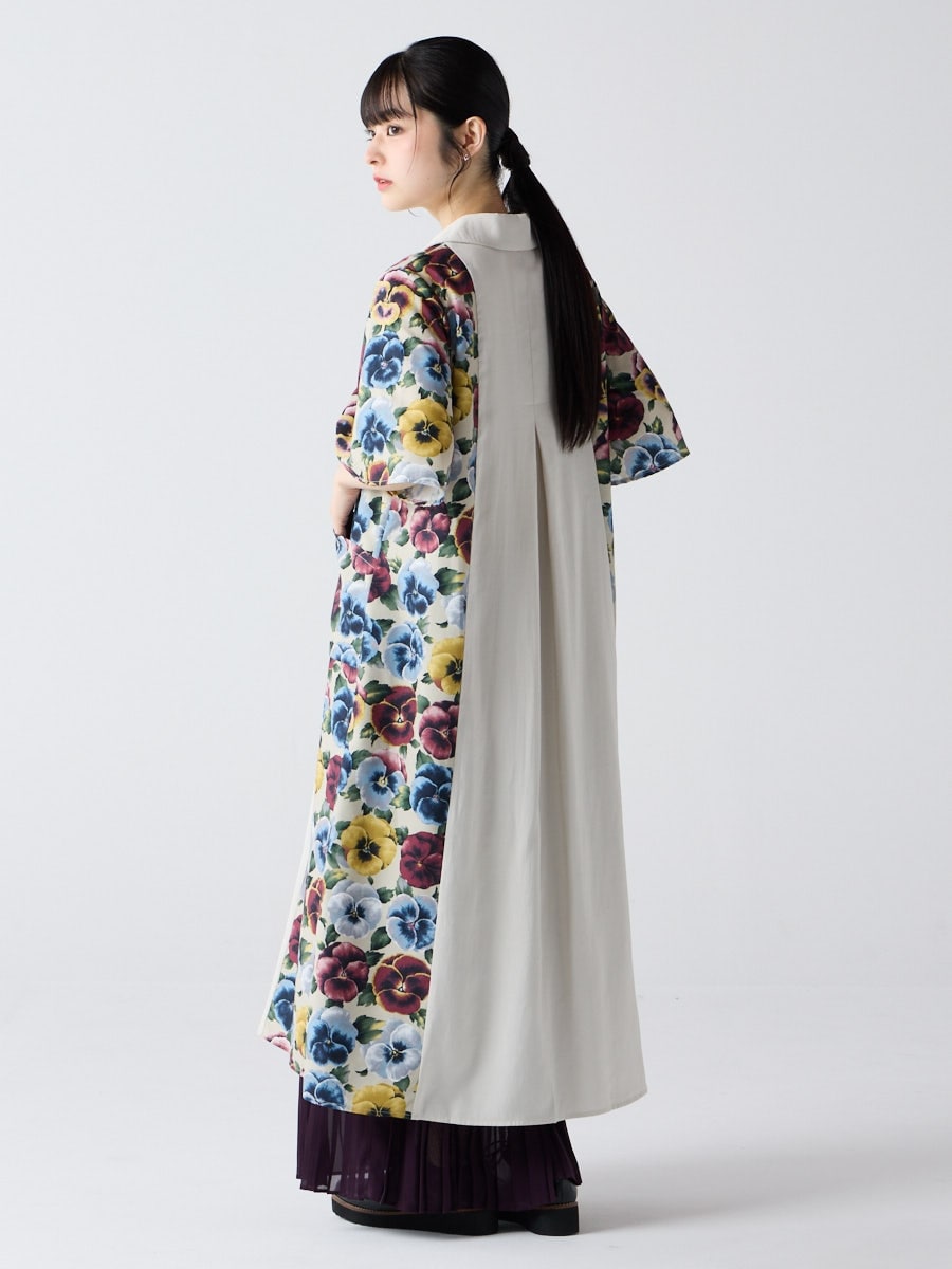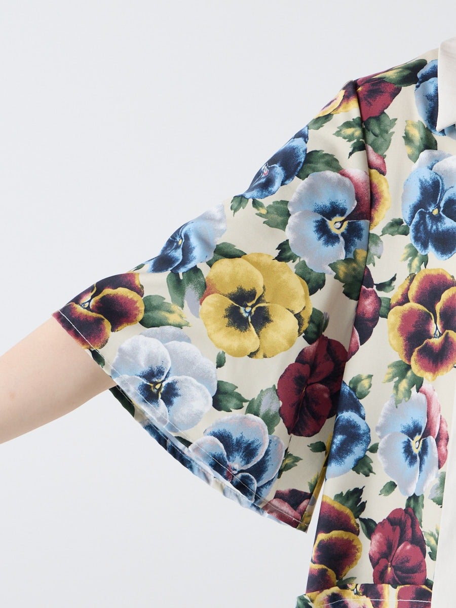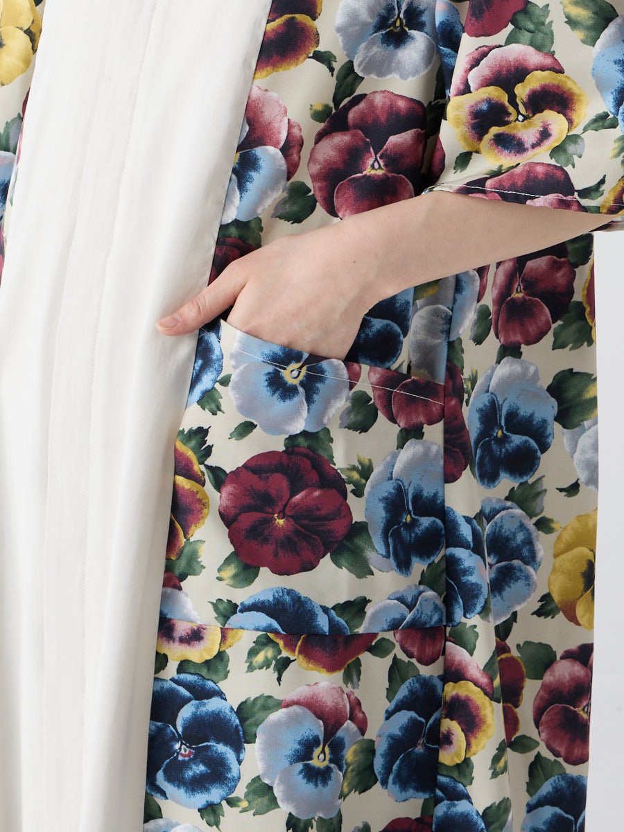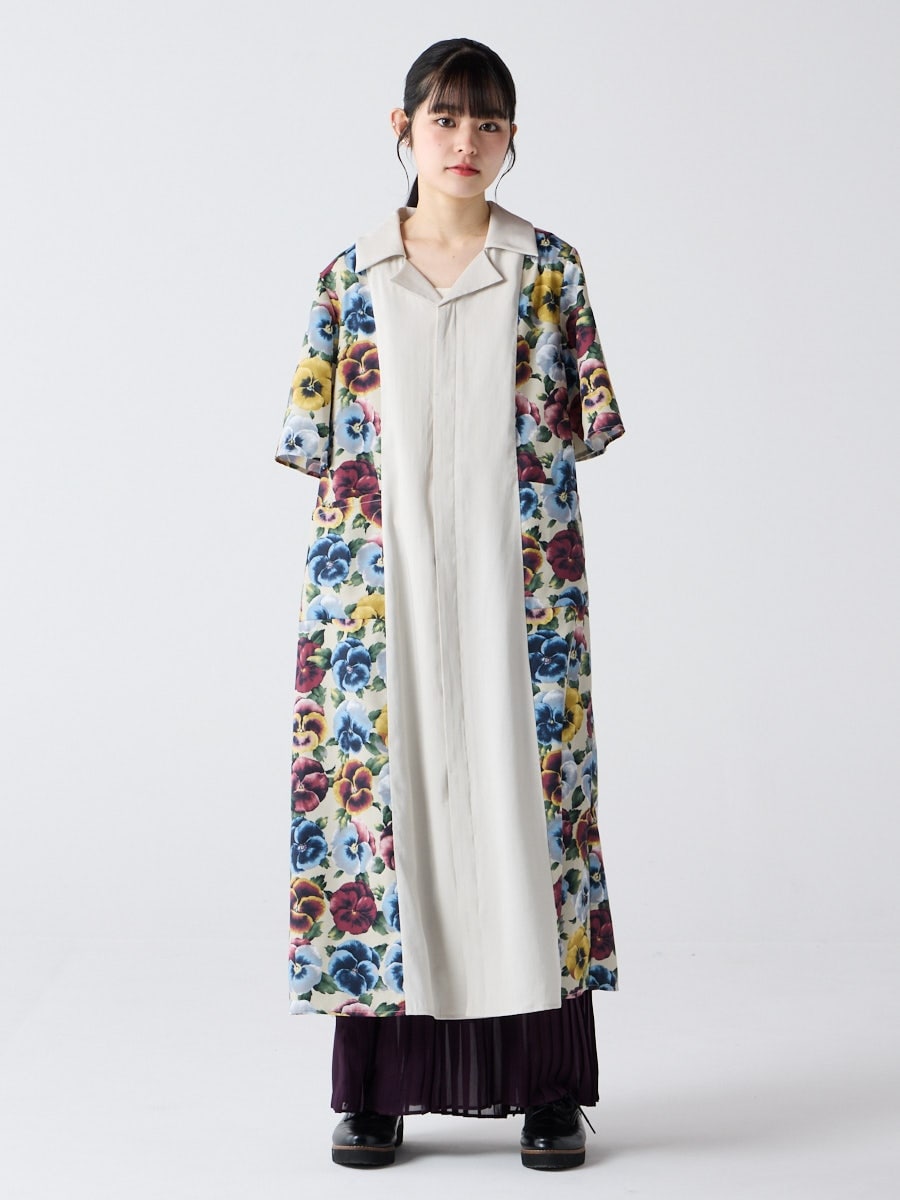 ふりふ人気テキスタイル「パンジー」を規則的に敷き詰めたシャツワンピース。台形シルエットは広がりすぎずシュッとしたラインで、開衿と回顧的ディテールがノスタルジックな趣を添えます。柄の存在感とシルエットの軽やかさが、モード感と遊び心を両立します。