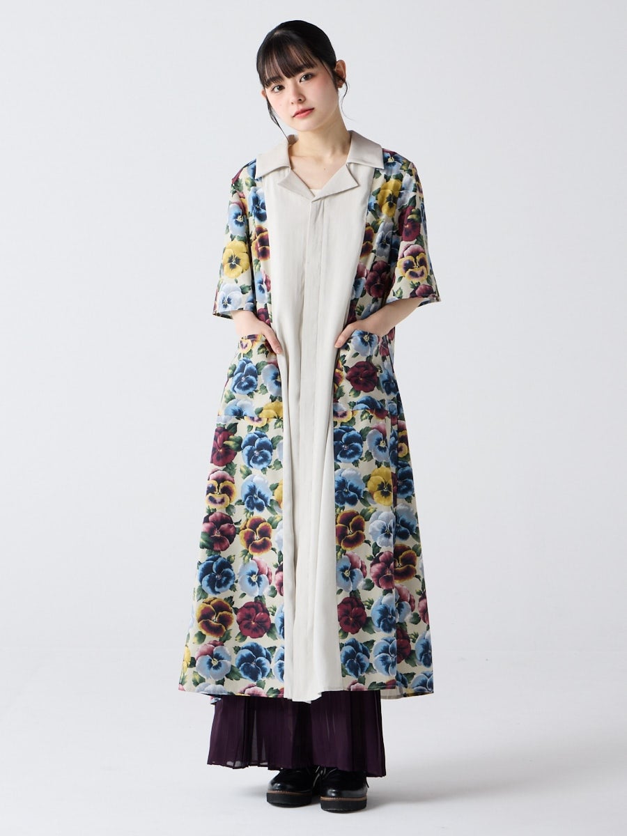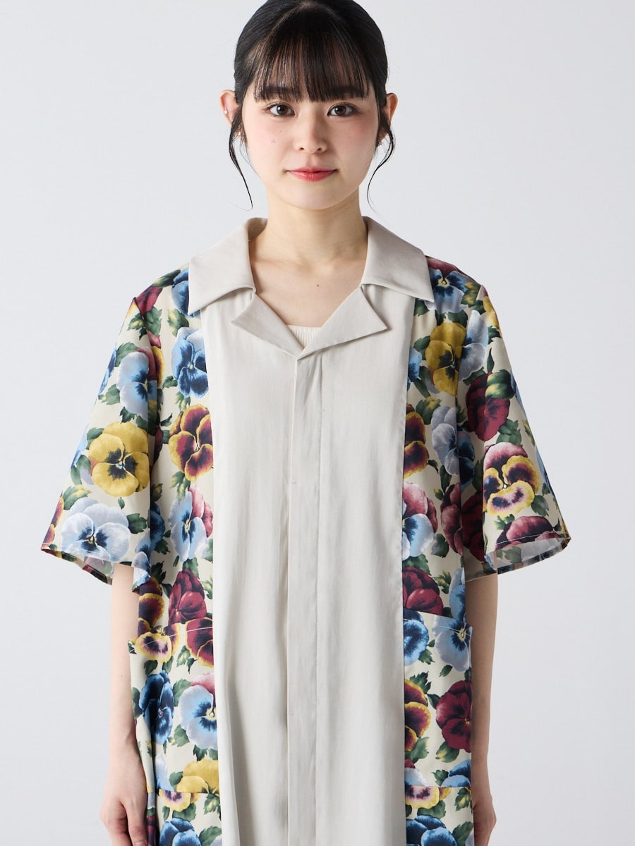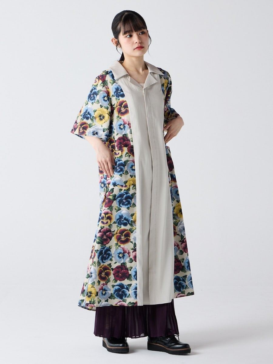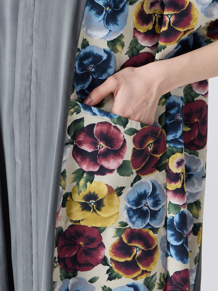ふりふ人気テキスタイル「パンジー」を規則的に敷き詰めたシャツワンピース。台形シルエットは広がりすぎずシュッとしたラインで、開衿と回顧的ディテールがノスタルジックな趣を添えます。柄の存在感とシルエットの軽やかさが、モード感と遊び心を両立します。