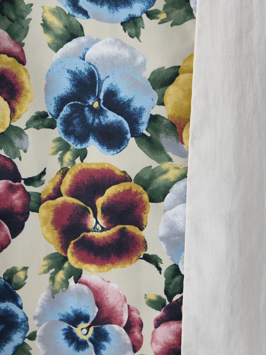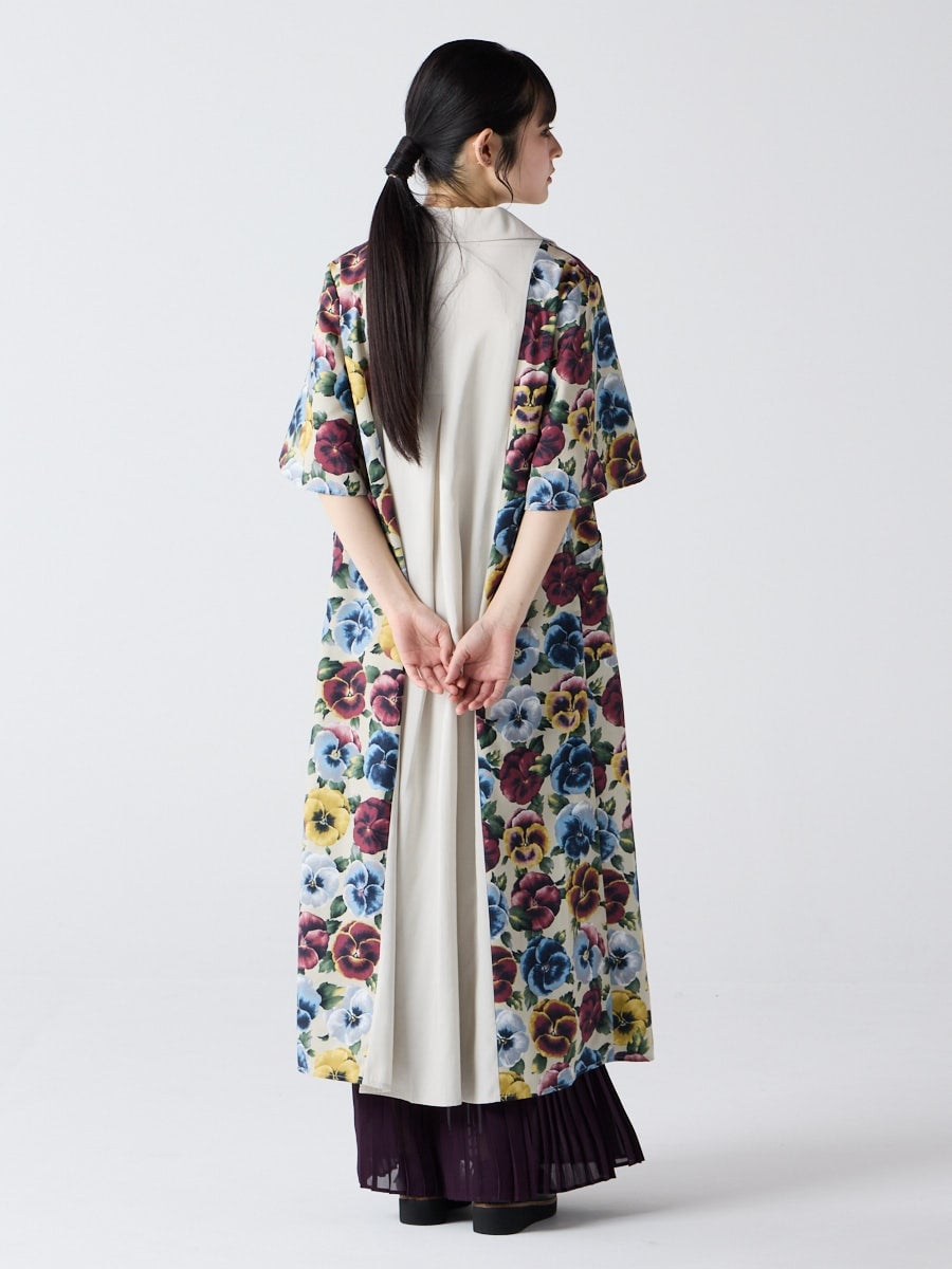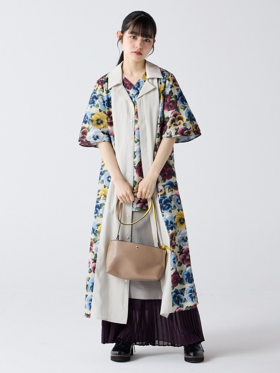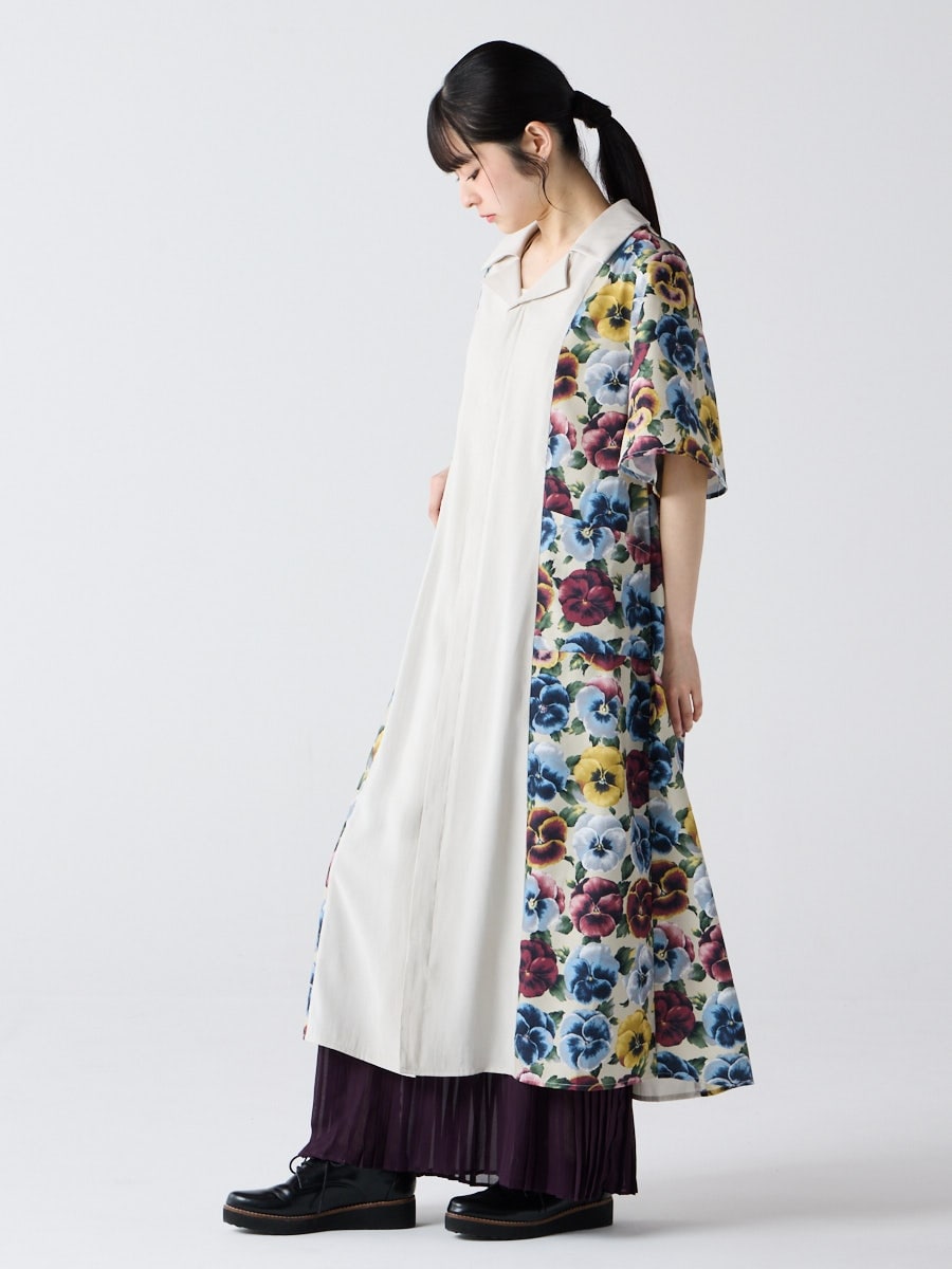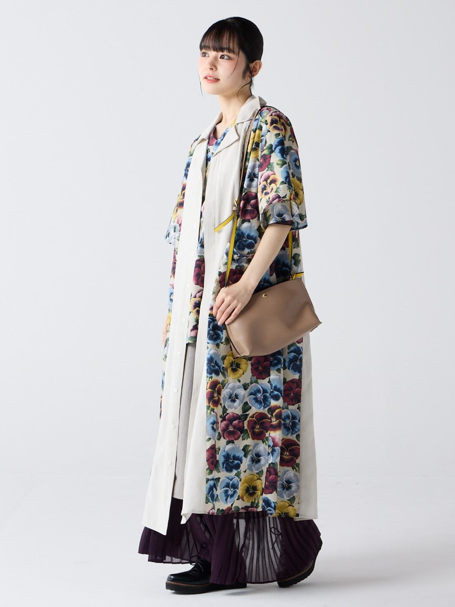 ふりふ人気テキスタイル「パンジー」を規則的に敷き詰めたシャツワンピース。台形シルエットは広がりすぎずシュッとしたラインで、開衿と回顧的ディテールがノスタルジックな趣を添えます。柄の存在感とシルエットの軽やかさが、モード感と遊び心を両立します。